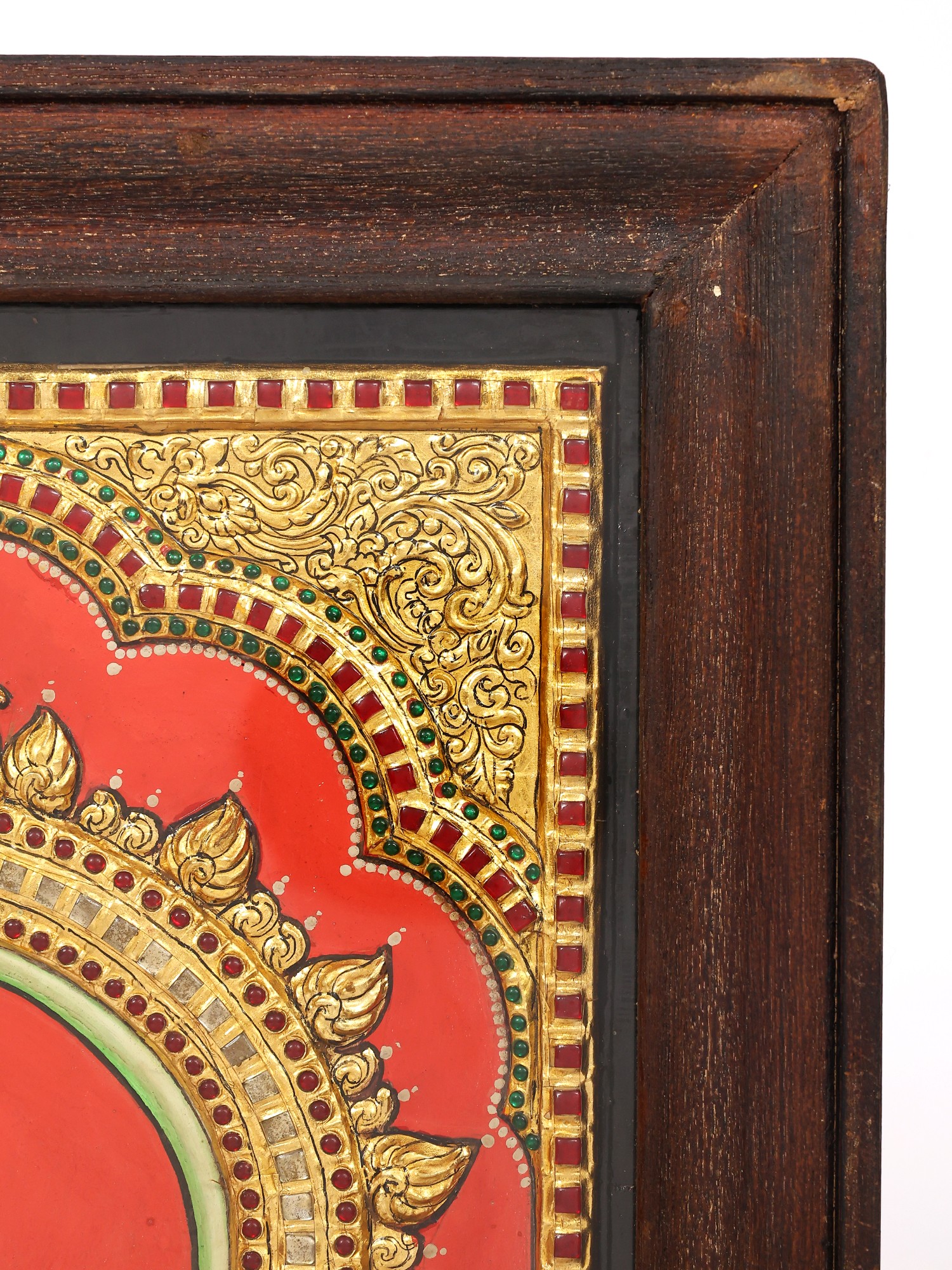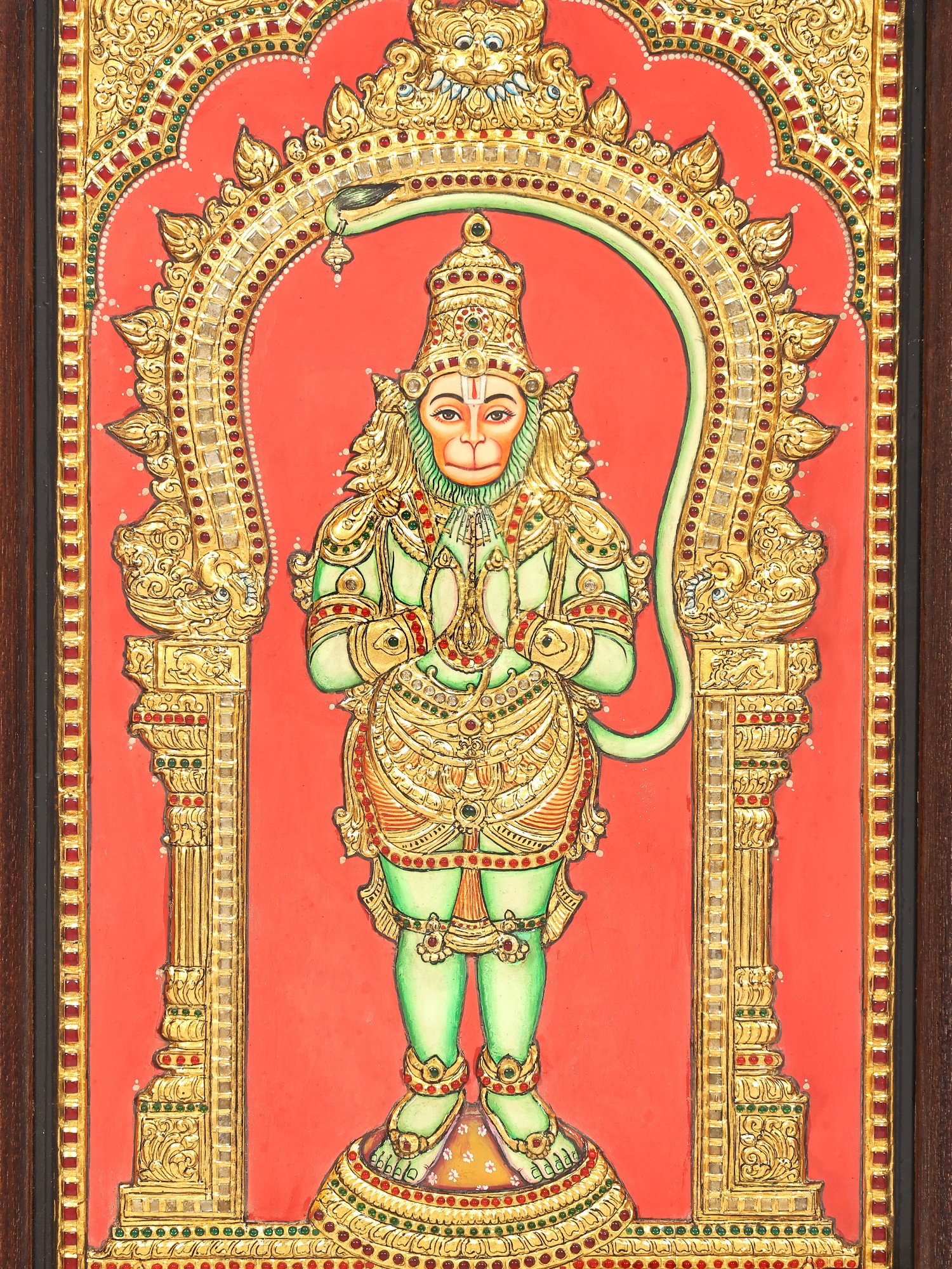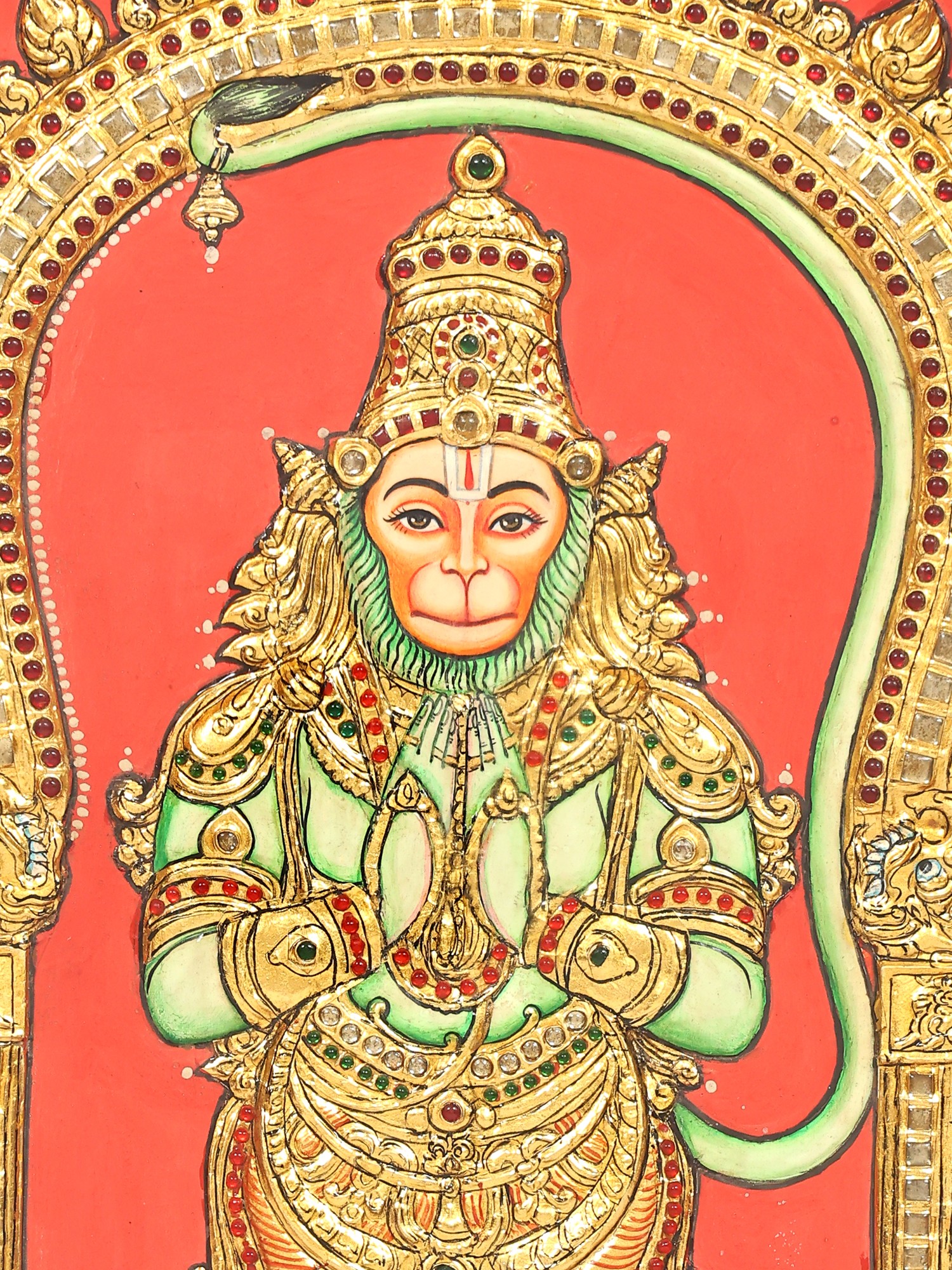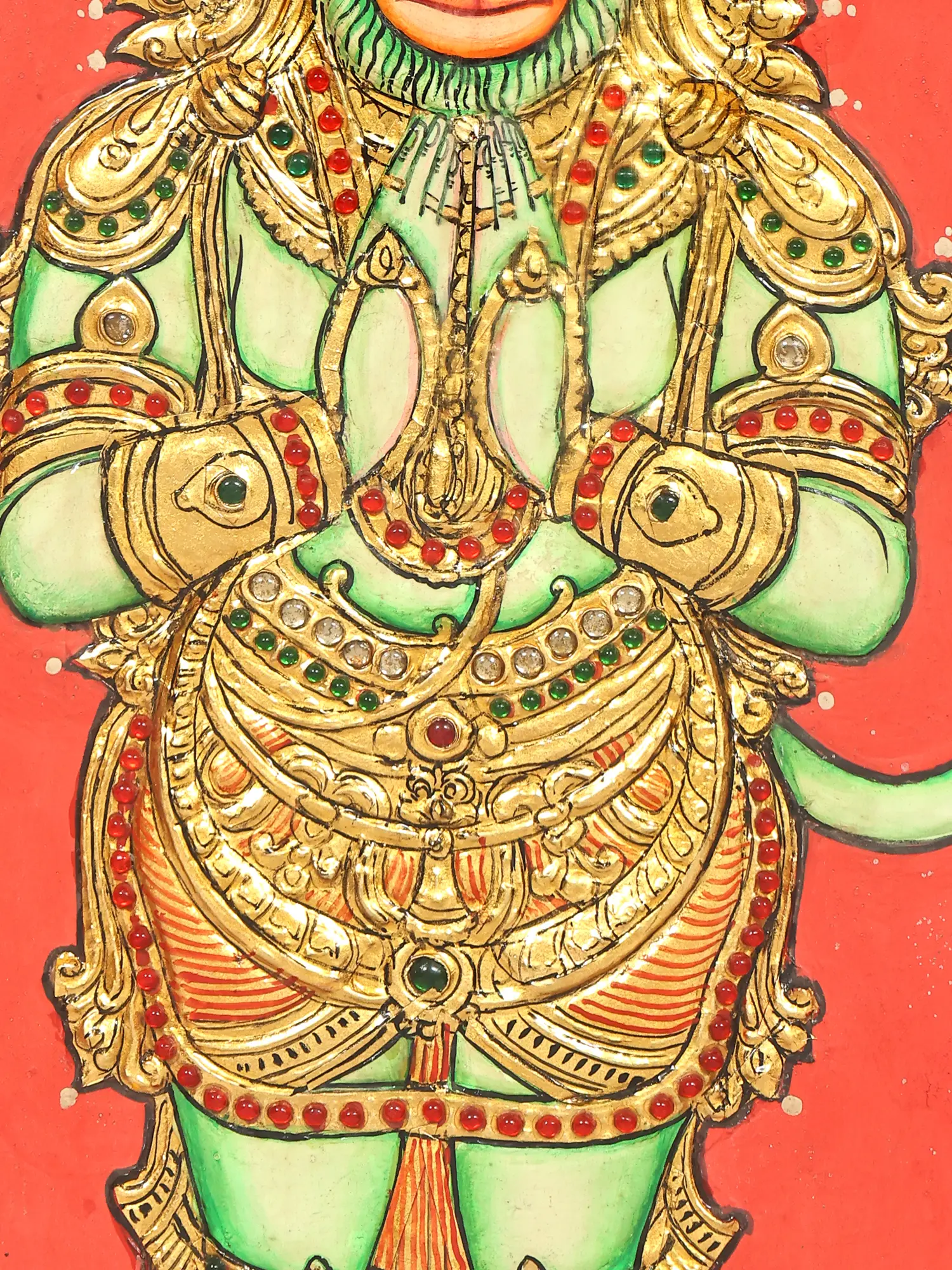 This exquisite Tanjore painting captures the essence of unwavering devotion and strength embodied by Lord Hanuman, the devoted disciple of Lord Rama. Rendered in the traditional Tanjore style, renowned for its rich colors, intricate details, and the opulent use of gold, this artwork brings to life a powerful and serene depiction of the Vanara god. Hanuman, with his characteristic green complexion, stands tall in the auspicious Namaskar Mudra, his hands clasped in a gesture of profound respect and reverence. His gaze is steady and focused, conveying a sense of inner peace and absolute surrender. The artistry involved in creating such a piece is a testament to centuries-old traditions. Tanjore paintings are not merely decorative; they are considered sacred objects, believed to imbue the space they occupy with divine energy and blessings. The use of natural pigments and the meticulous application of 24-karat gold foil are hallmarks of this art form, giving the painting a luminous and almost three-dimensional quality. The divine form of Hanuman is adorned with ornate jewelry and a richly patterned dhoti, all meticulously rendered with fine brushstrokes and embellished with sparkling inlays. The vibrant red background provides a dramatic contrast, making the golden motifs and the figure of Hanuman stand out with remarkable brilliance.