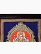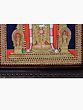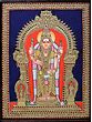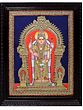 In the exquisite Tanjore painting, standing Lord Karttikeya, also known as Murugan, emanates divine beauty and grace. He stands atop a gem-studded pedestal, sharing it with his loyal door guardians, each with their miniature shrine attached to the throne. This pedestal is encircled by an intricate aureole adorned with symbols of royalty, including the Makara, Kirtimukha, and a bird with a Makara head.
