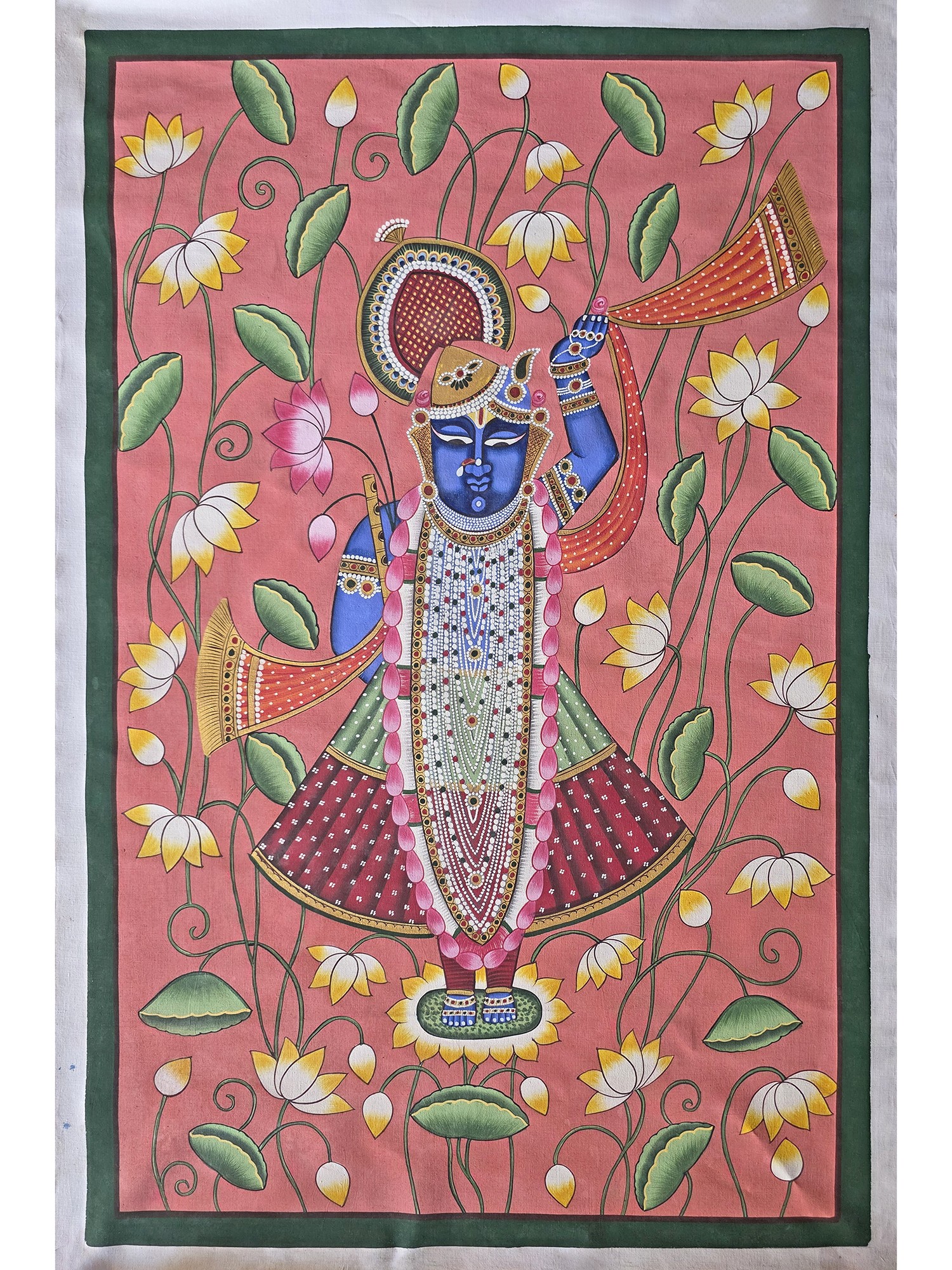 Standing Lord Shrinathji With Lotus | Pichwai Art | Watercolor On Cotton