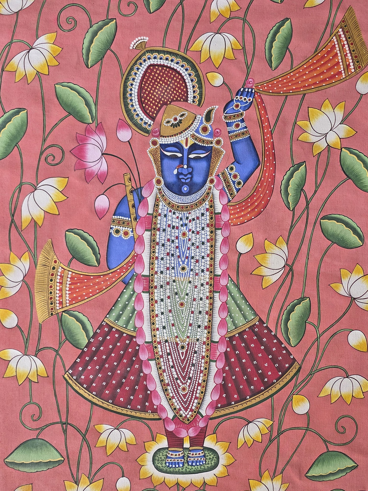 The use of watercolor on cotton as the medium for this Pichwai painting is a hallmark of its authenticity and traditional craftsmanship. The cotton fabric provides a subtly textured surface that allows the watercolors to blend and diffuse beautifully, creating a soft, luminous effect. The pigments are carefully chosen to reflect the traditional color palette of Pichwai art, known for its richness and vibrancy. The meticulous detailing, from the fine patterns on Shrinathji's attire to the delicate veins on the lotus leaves, speaks to the immense skill and dedication of the artisan. This painting is a tangible piece of cultural heritage, embodying centuries of artistic tradition and spiritual devotion.