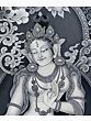 While it bears the hallmarks of authentic paubha art and depicts the Buddhist Devi in Her traditional iconography, the aesthetic is remarkably different. For example, it is a monotone composition comprising numerous shades and tints of charcoal. The cotton of the fabric-based canvas adds the appropriate texture to the solemn mood of the paubha.