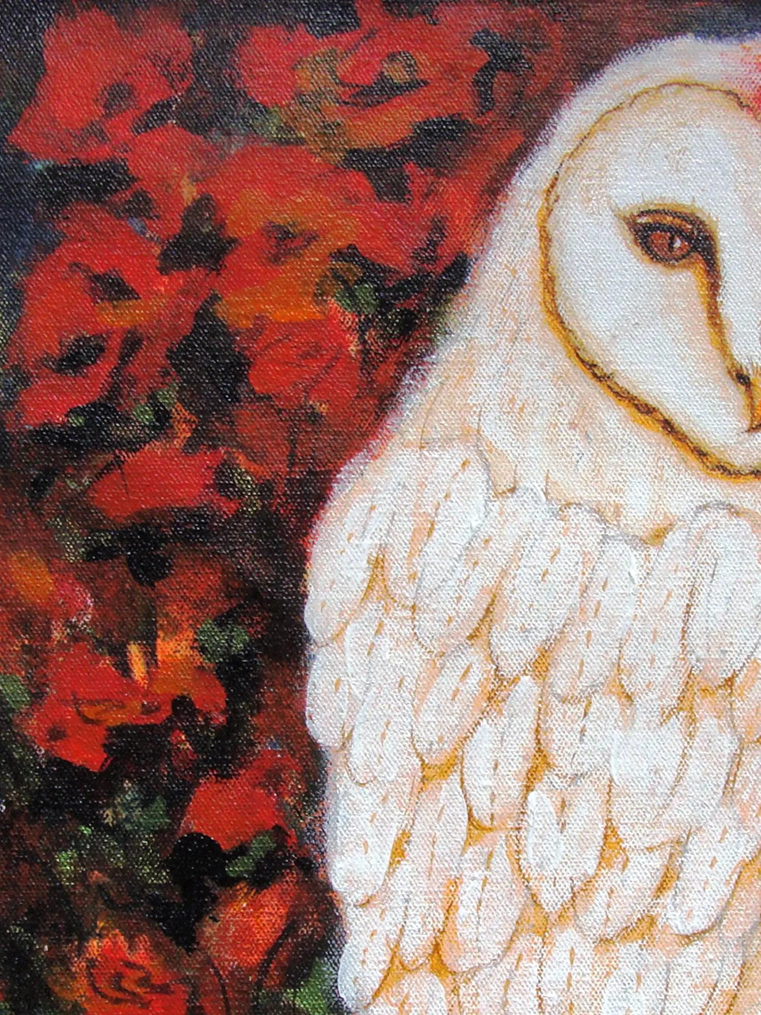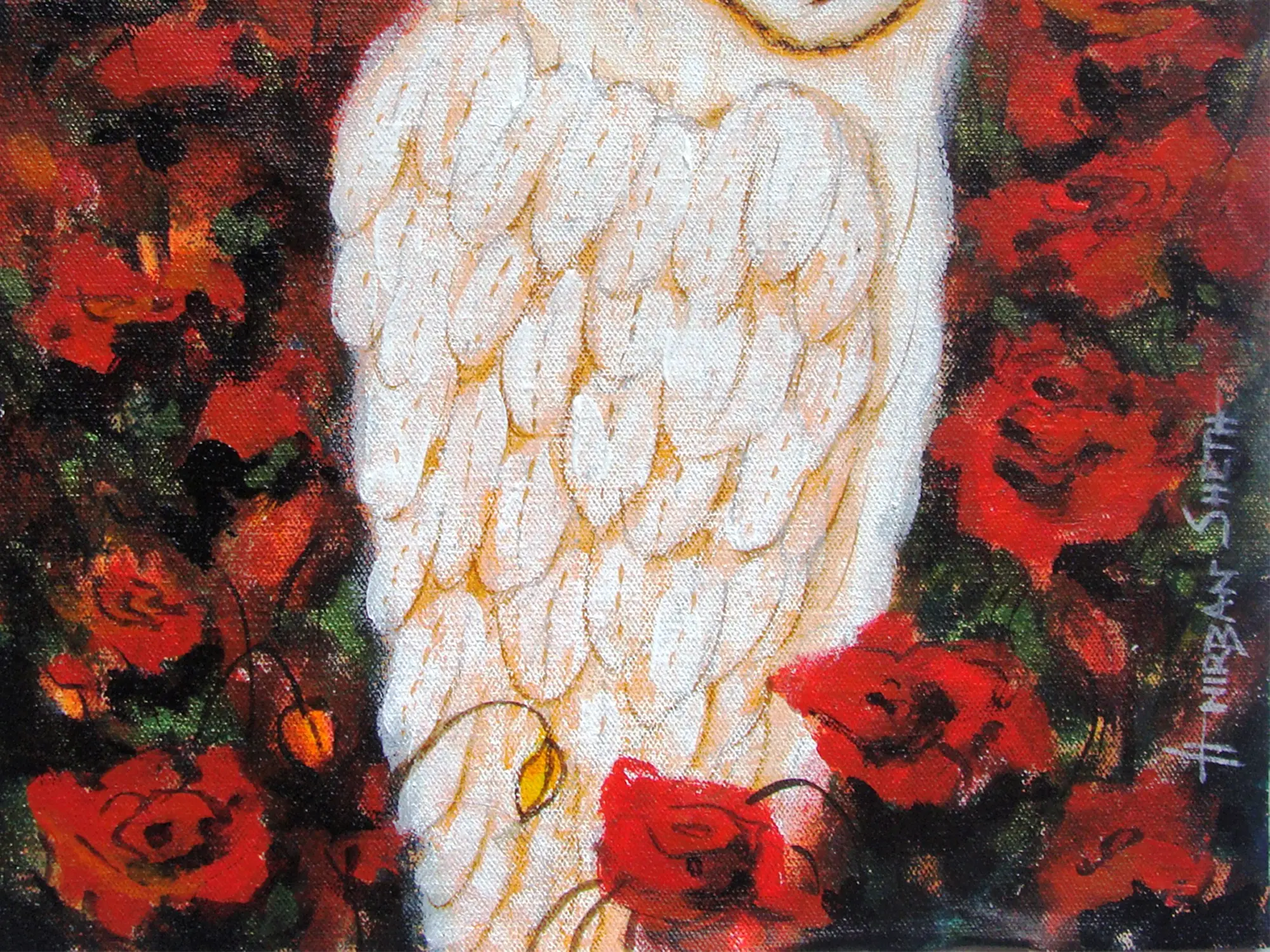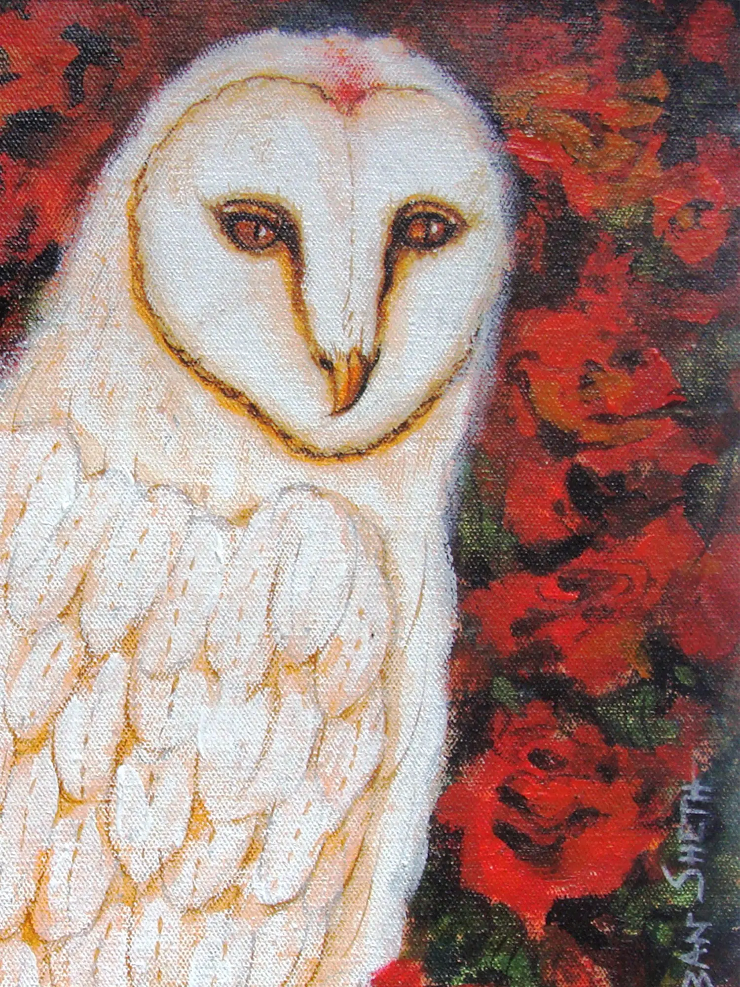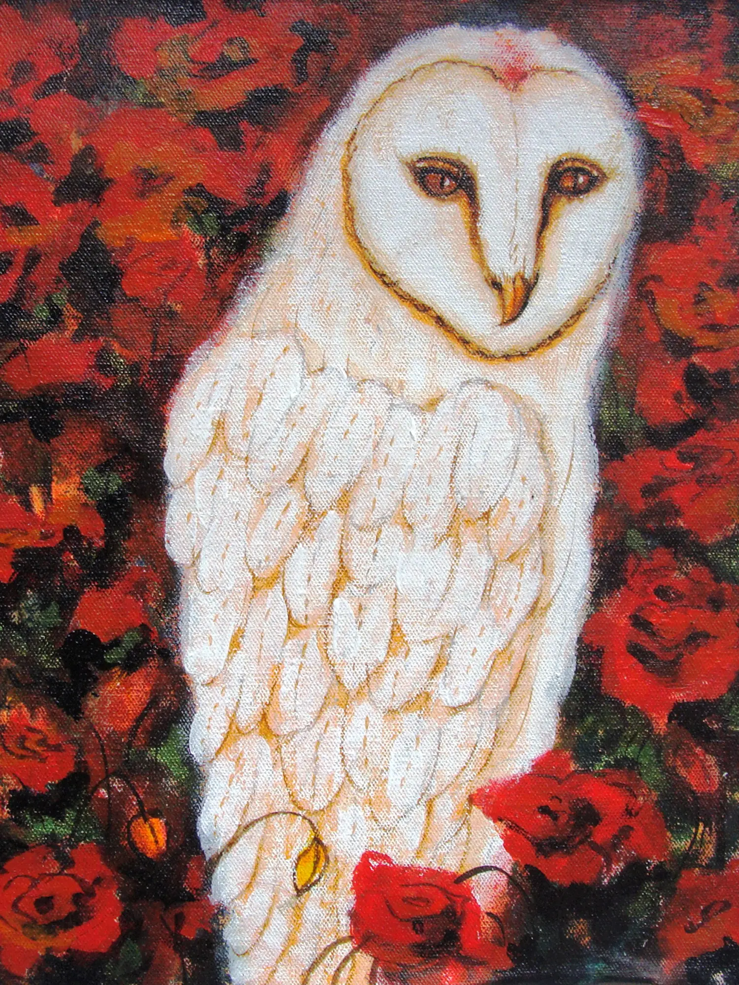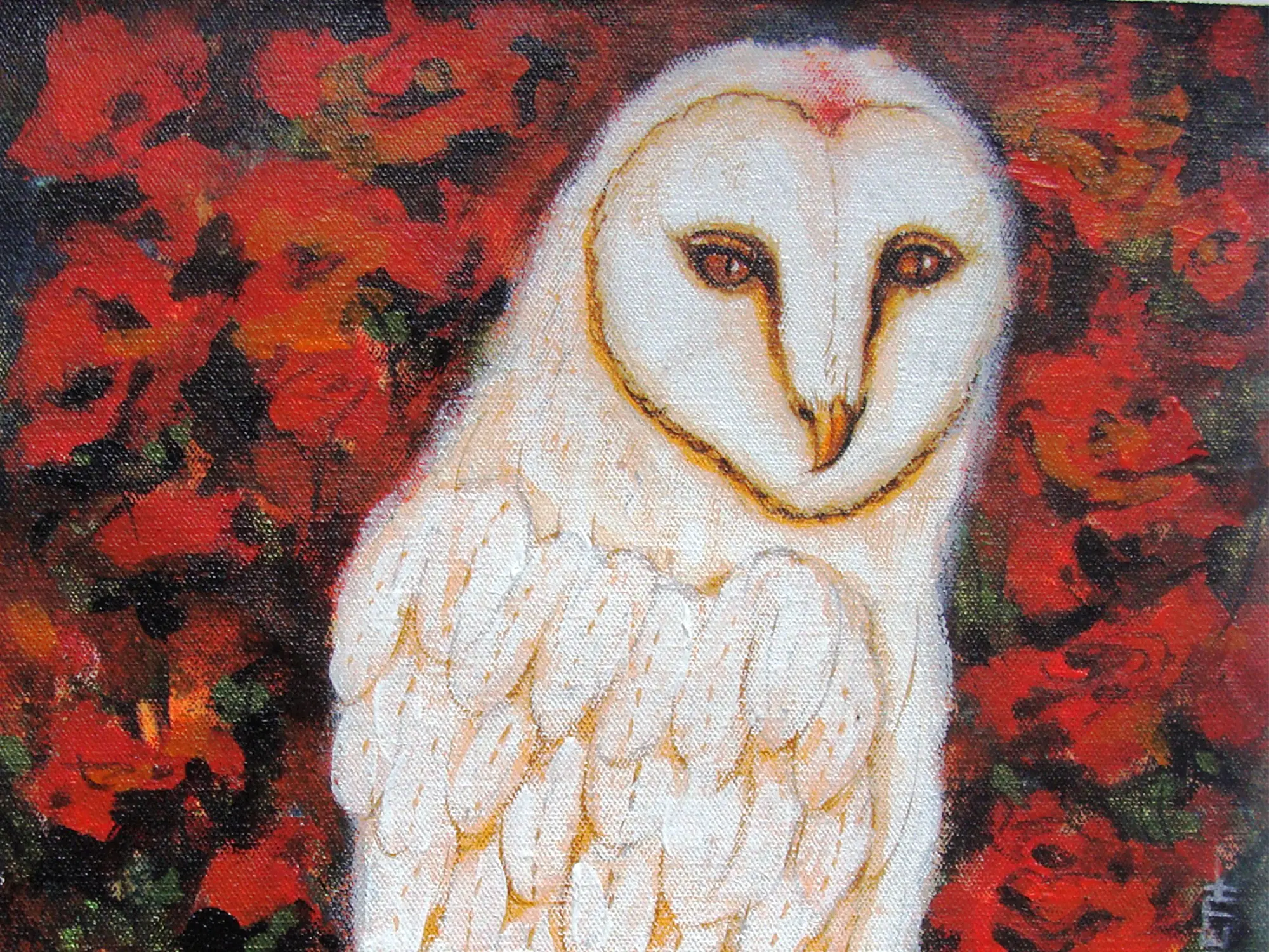 The striking contrast between the luminous white owl and the deep, passionate reds of the surrounding flora forms the heart of this composition. The canvas, measuring eleven inches in height by ten inches in width, provides an intimate yet impactful viewing experience. You'll appreciate the subtle variations in hue and shadow that imbue the subject with a lifelike presence, while the deftly handled background suggests a lush, almost abstract garden setting.