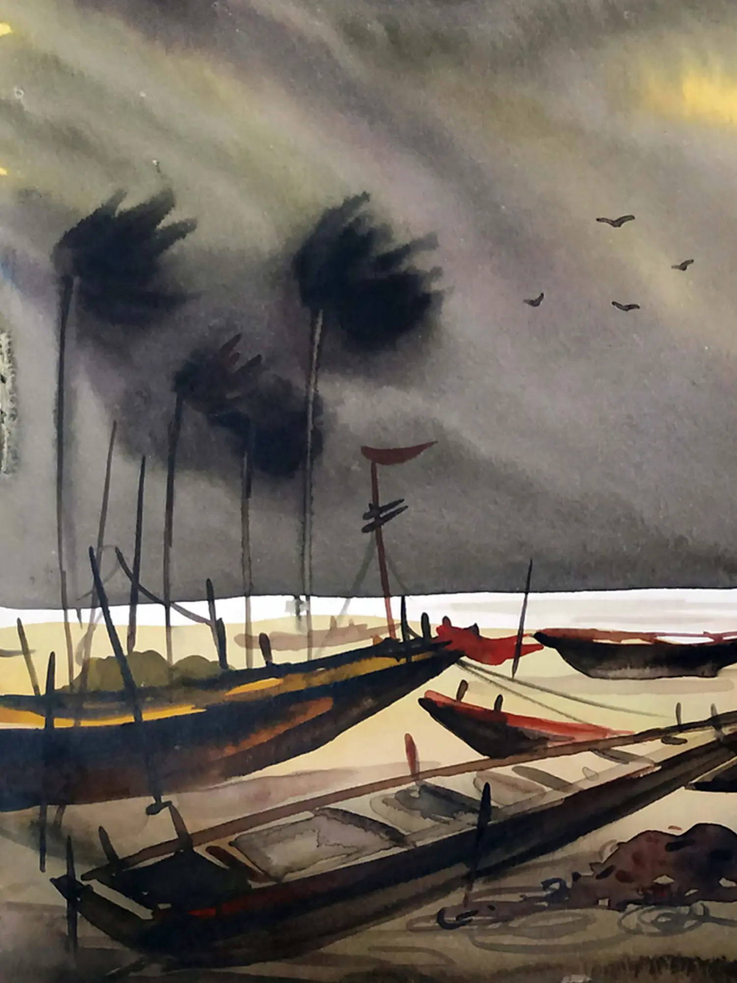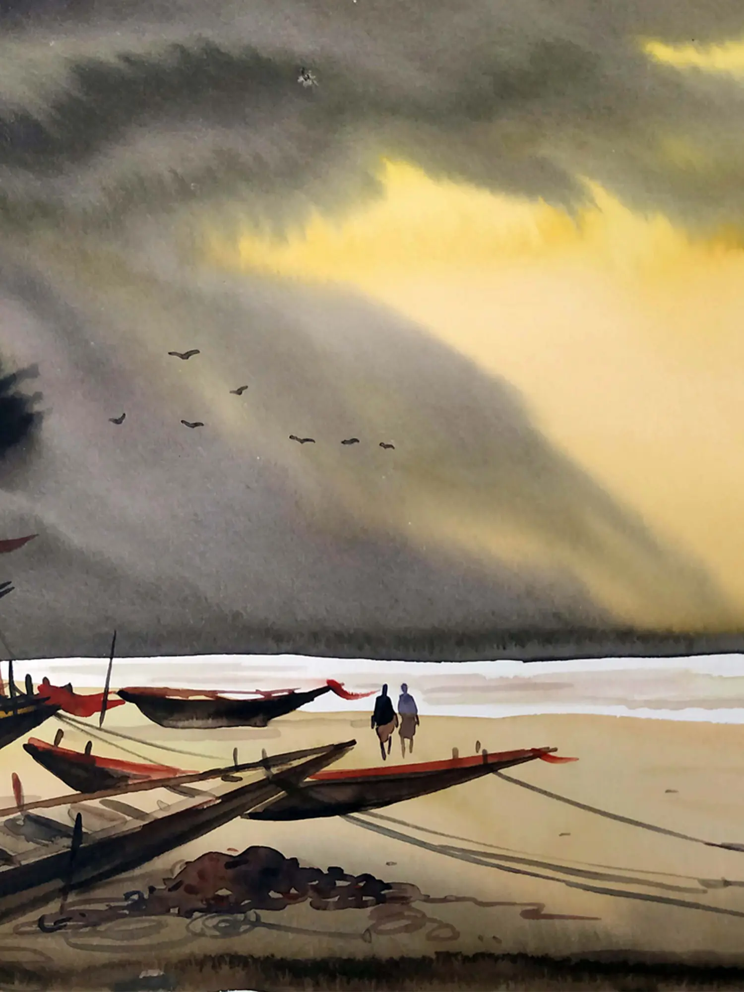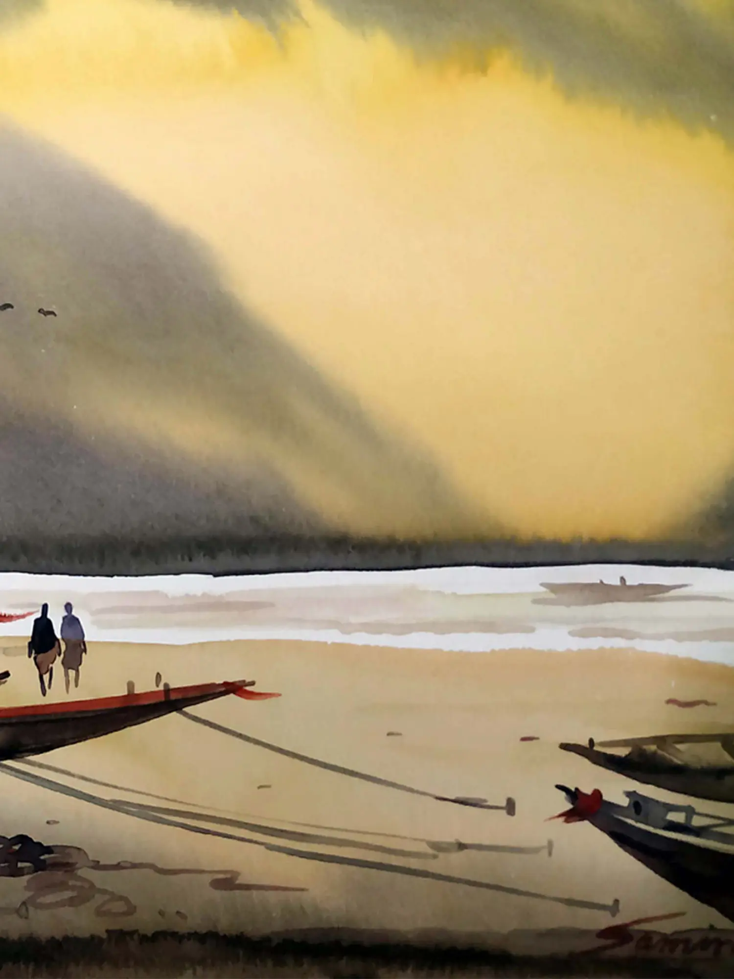 Masterfully rendered in watercolor on fine paper, this piece showcases the artist's exceptional skill in capturing atmospheric conditions. Samiran Sarkar employs delicate washes and bold strokes to delineate the swirling clouds, the glint of the distant sun, and the subtle textures of sand and water. The composition, with its balanced arrangement of boats and figures, draws the eye through the scene, creating a sense of depth and narrative.