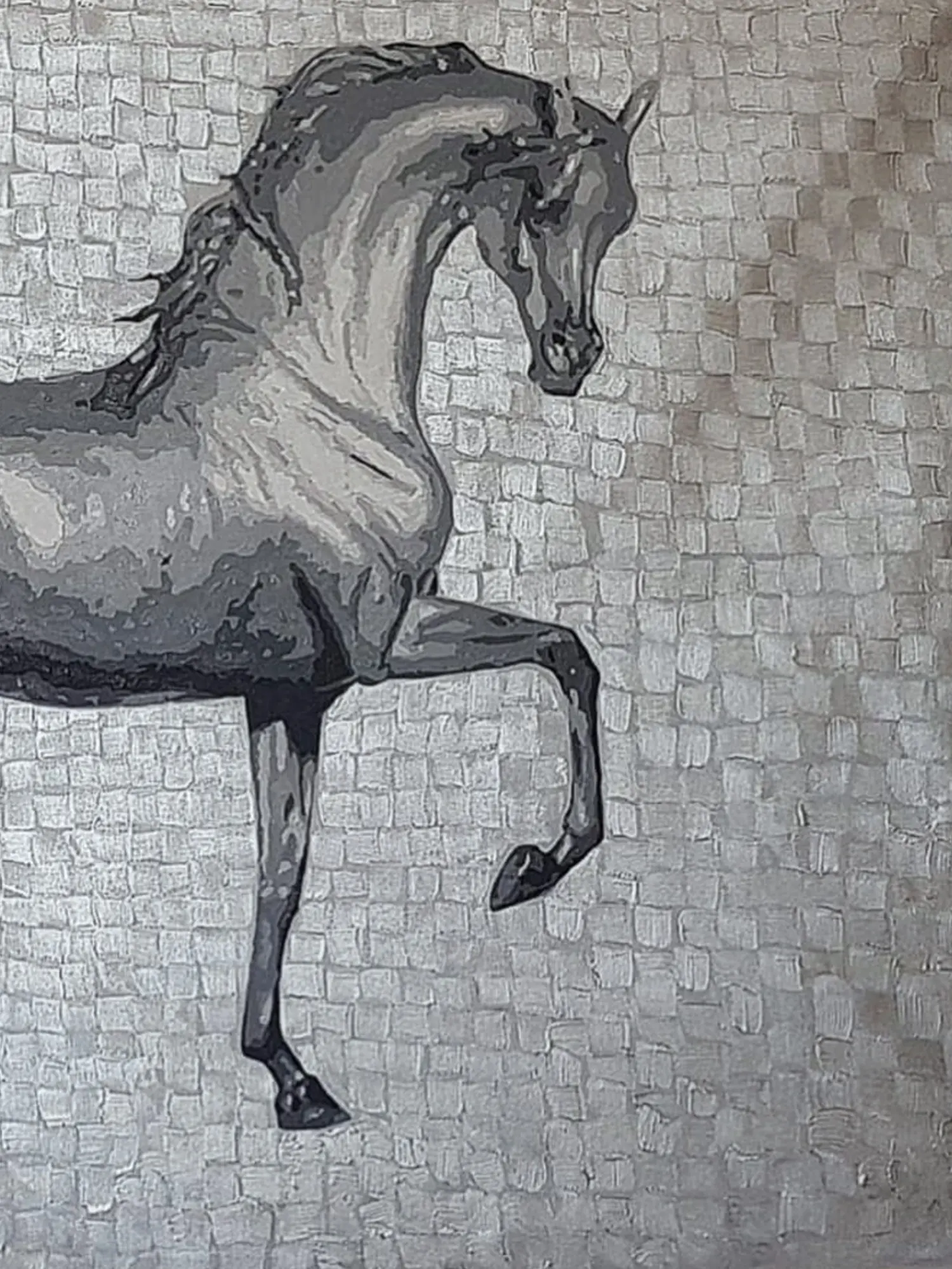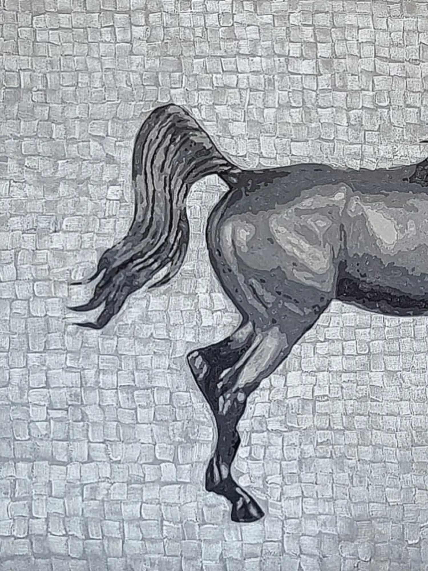 The choice of acrylics on canvas allows for a rich layering of color and texture, evident in the subtle variations in tone that give the horse's coat a sense of depth and realism. The background, textured to resemble stone or mosaic tiling, provides a striking contrast to the smooth depiction of the horse, emphasizing its form and highlighting the artist’s skilled application of the medium. The monochromatic scheme amplifies the elegance of the subject and elevates the painting into a sophisticated and timeless piece. This monochrome technique intensifies the focus on the form and movement of the horse itself, drawing the viewer's eye to the elegance of its posture.