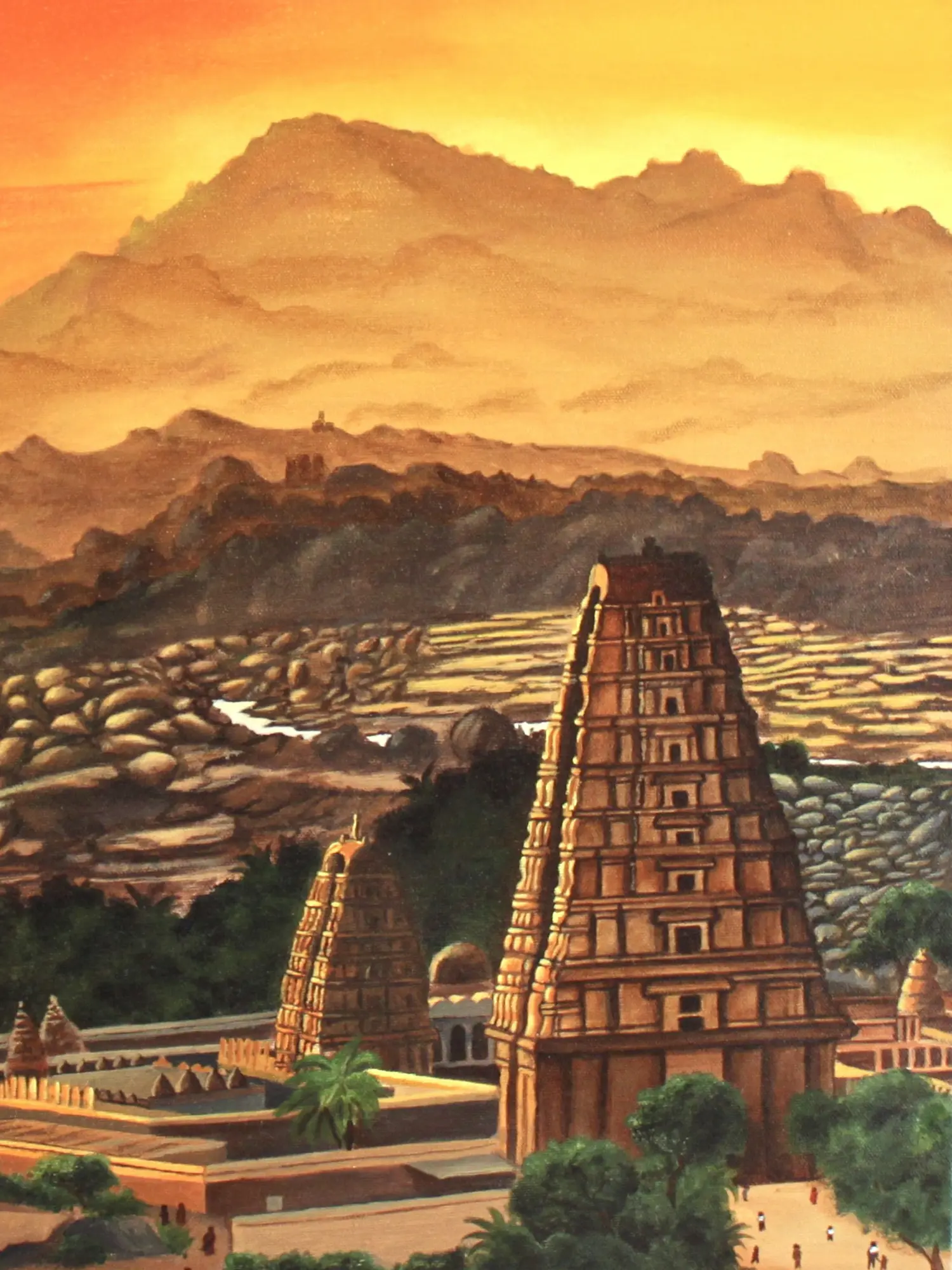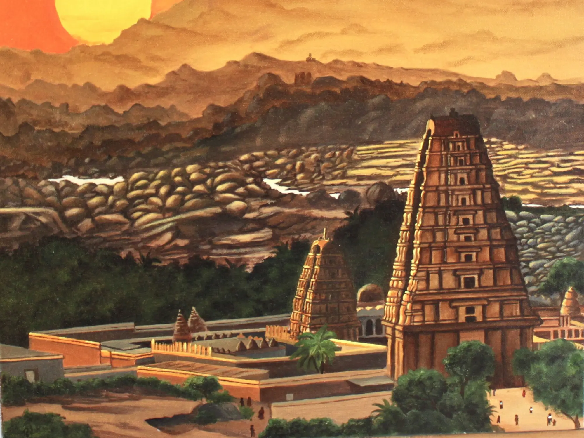 This scene transports you to the legendary ruins of Hampi, a UNESCO World Heritage site that once served as the opulent capital of the Vijayanagara Empire. The towering gopurams depicted are iconic symbols of Dravidian architecture, standing as proud reminders of a glorious past steeped in history and spirituality. It offers a visual dialogue with centuries of human endeavor and devotion.