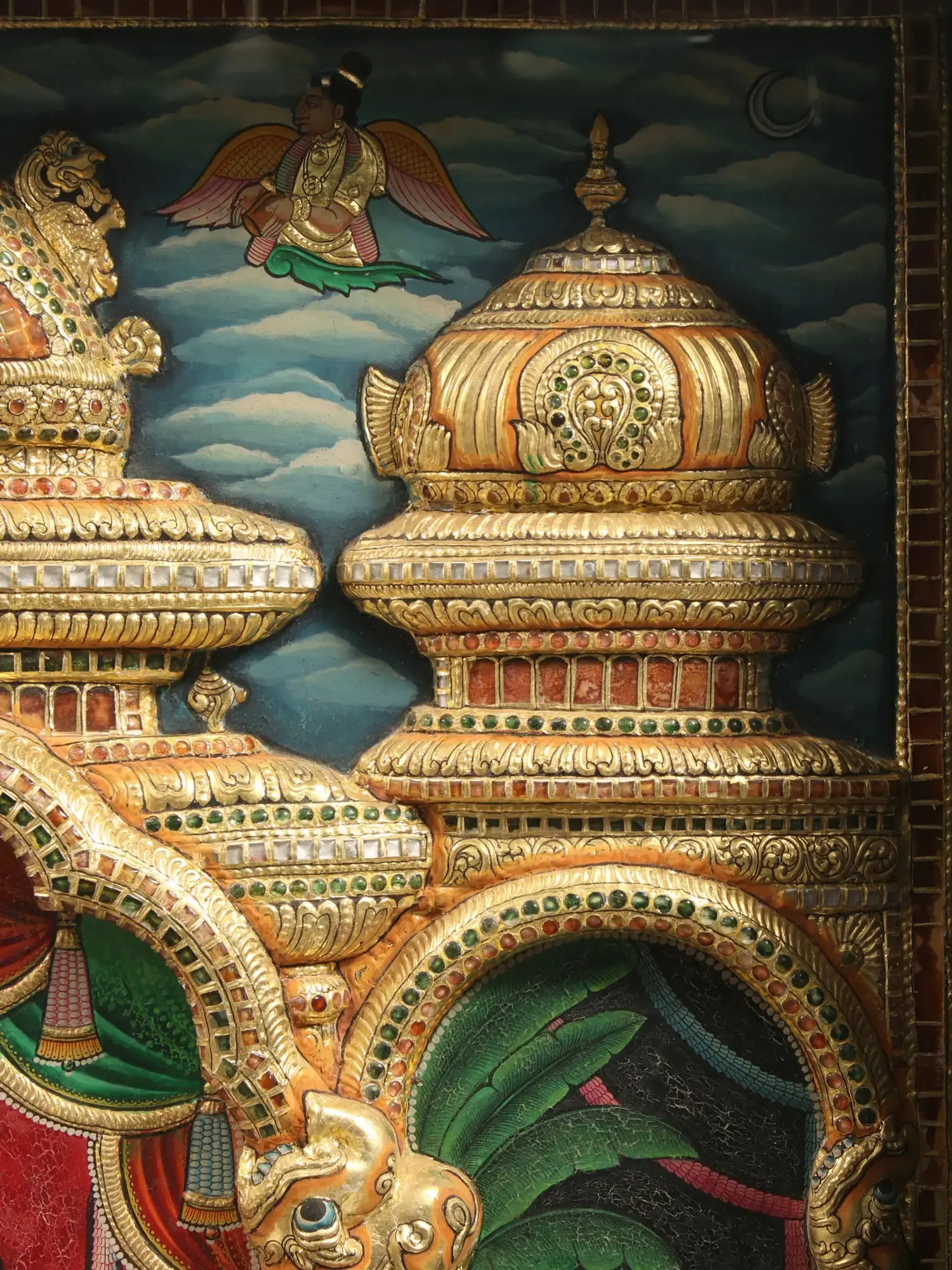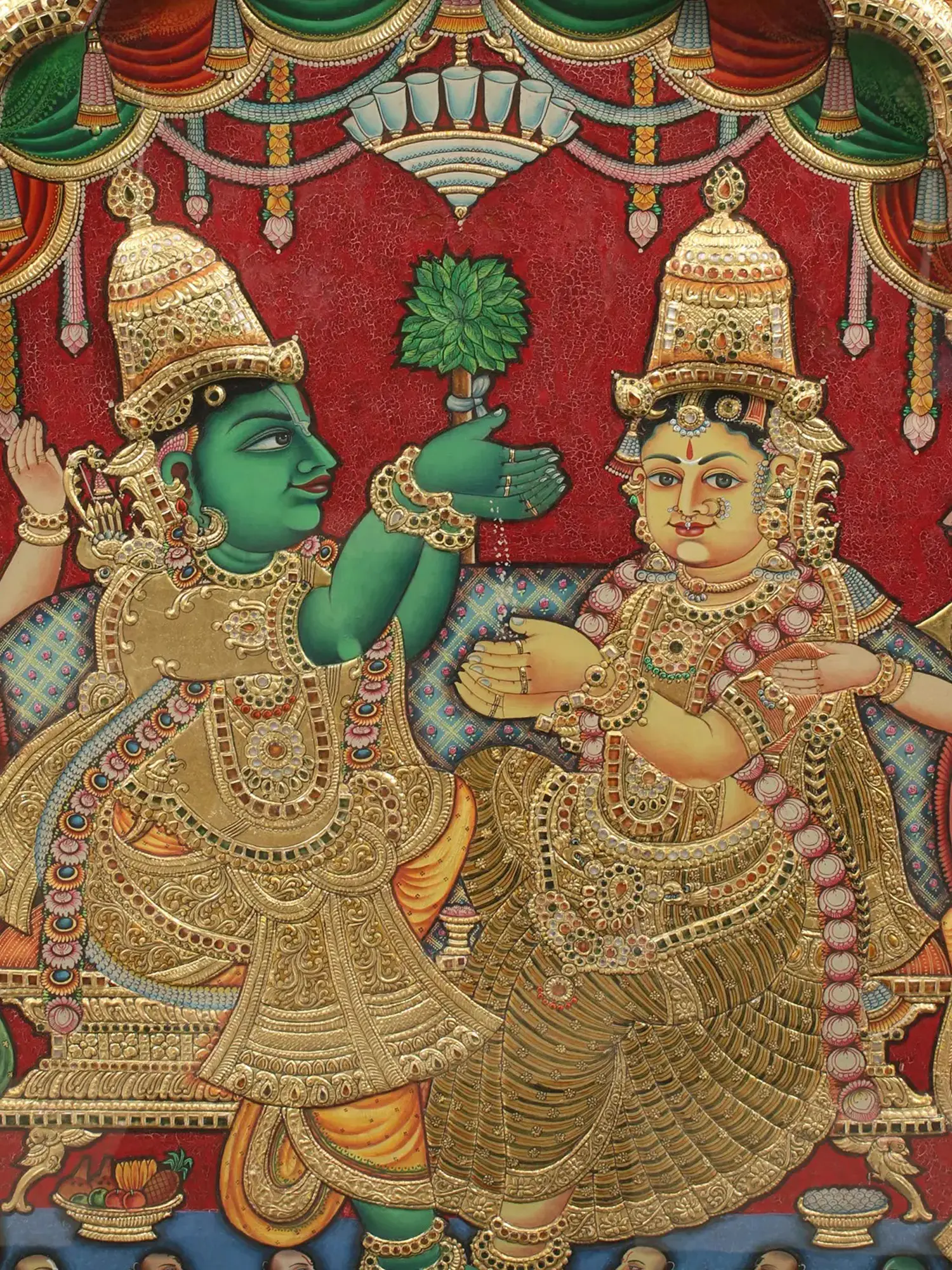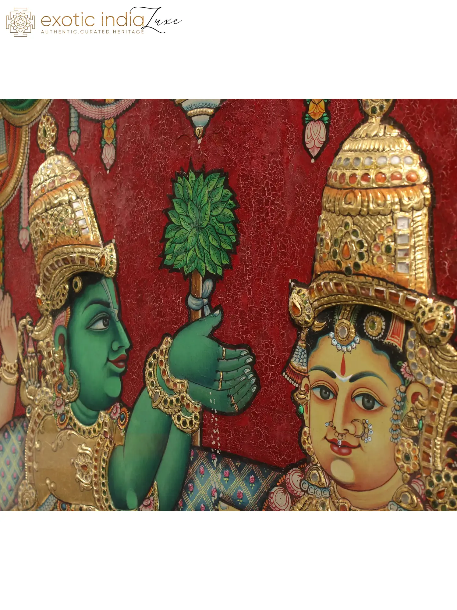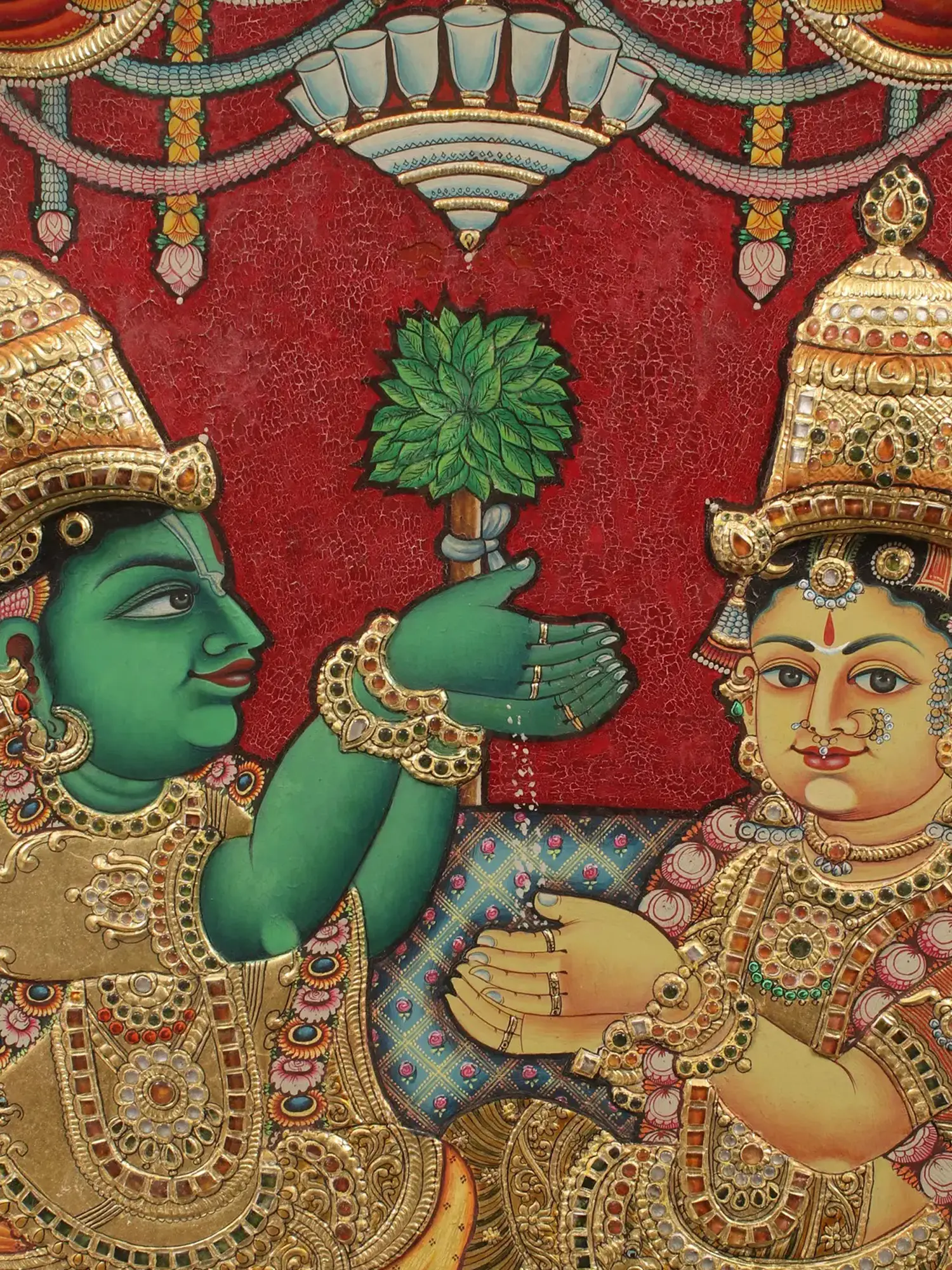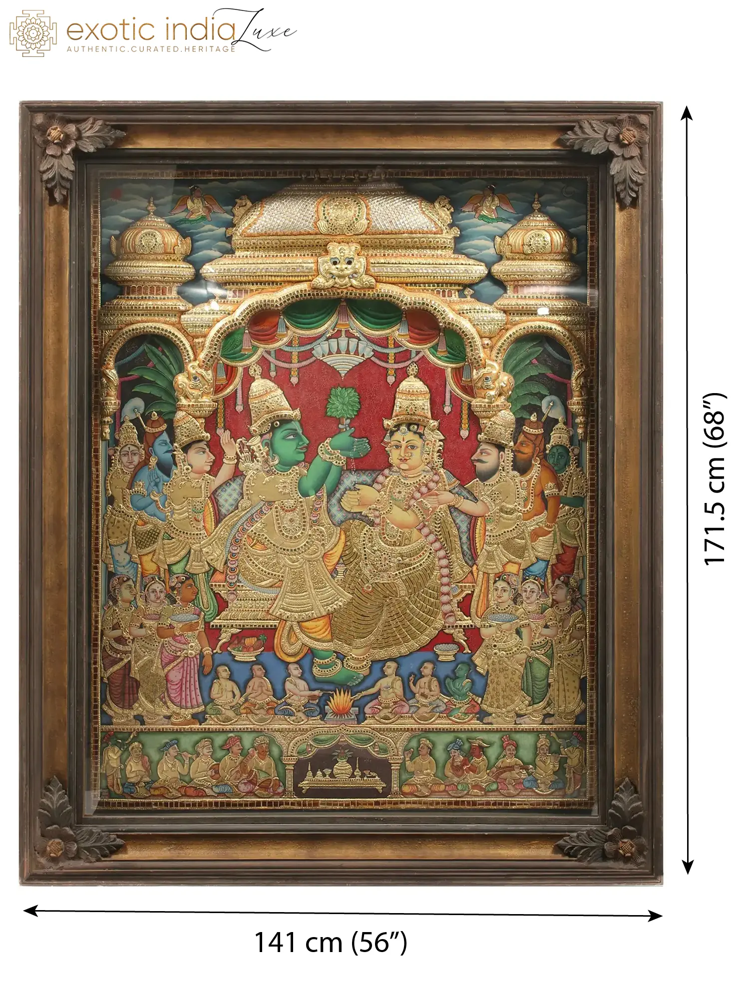 Tanjore paintings in the culture of South India are a mode for the devotee to feel proximity with their deities in every aspect. For this reason, the artists of Tanjore pick various themes from Hindu epic-Puranic legends to enliven their canvas, so that the devotee experiences a personal bond with the gods and goddesses. In this mesmerizing Tanjore painting, a heart-warming and rather rare subject of Sita-Kalyanam, goddess Sita’s marriage with Sri Rama has been presented on the canvas. Placed within a vintage teakwood frame which is an art piece unto itself, this superfine Thanjavur painting is vertically laid, with the marriage rituals being conducted inside a grand arched Mandapam, with the Kirtimukha emblem in the centre.