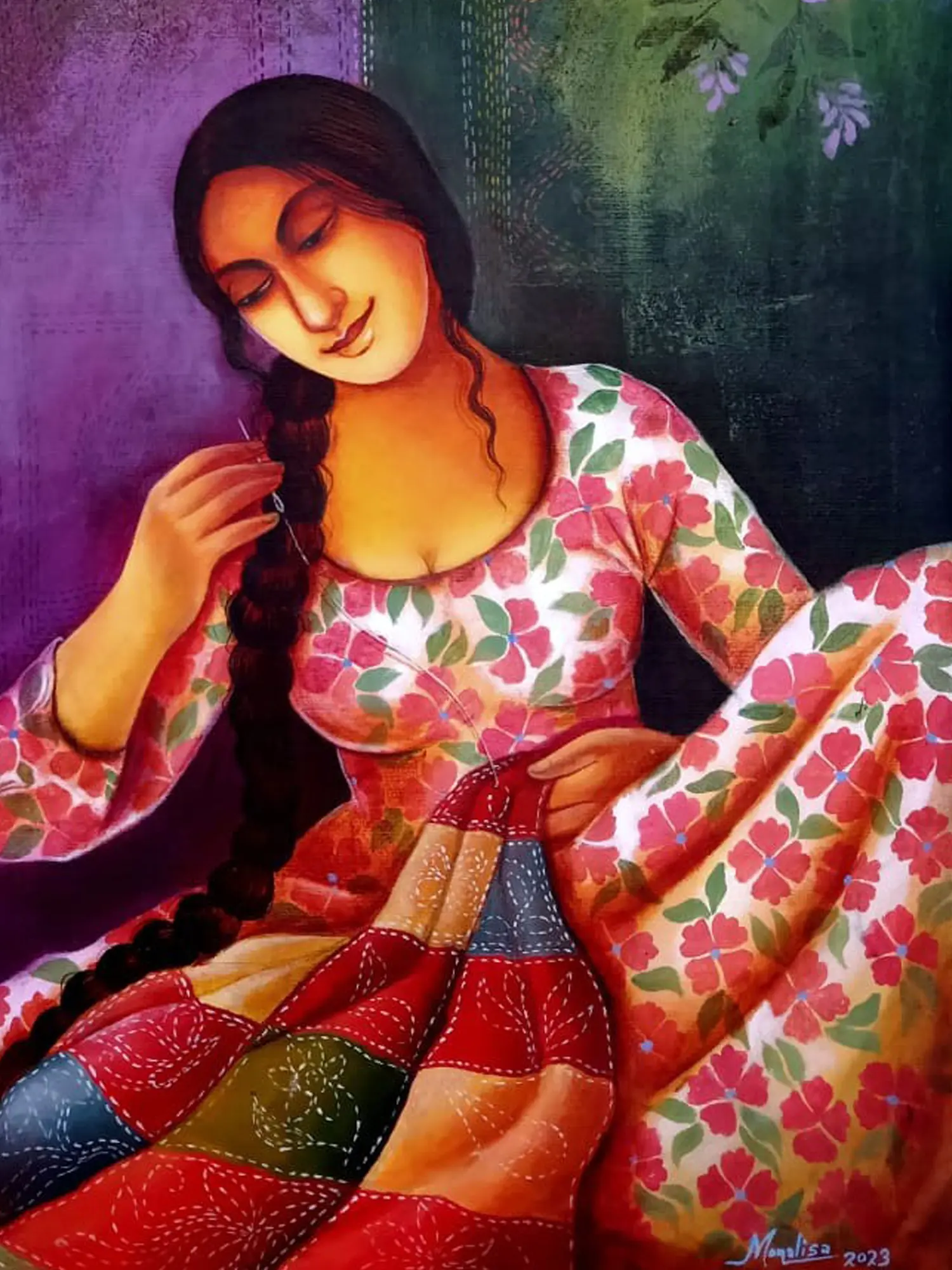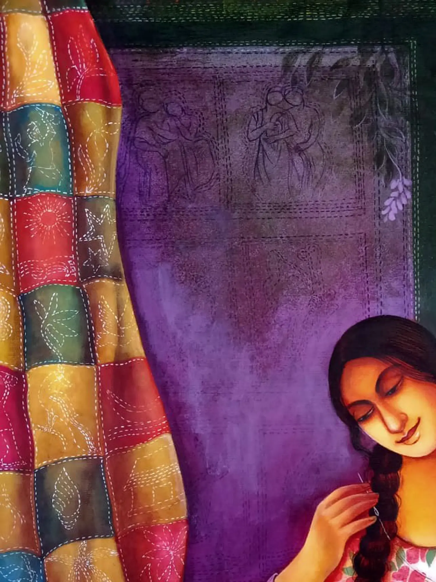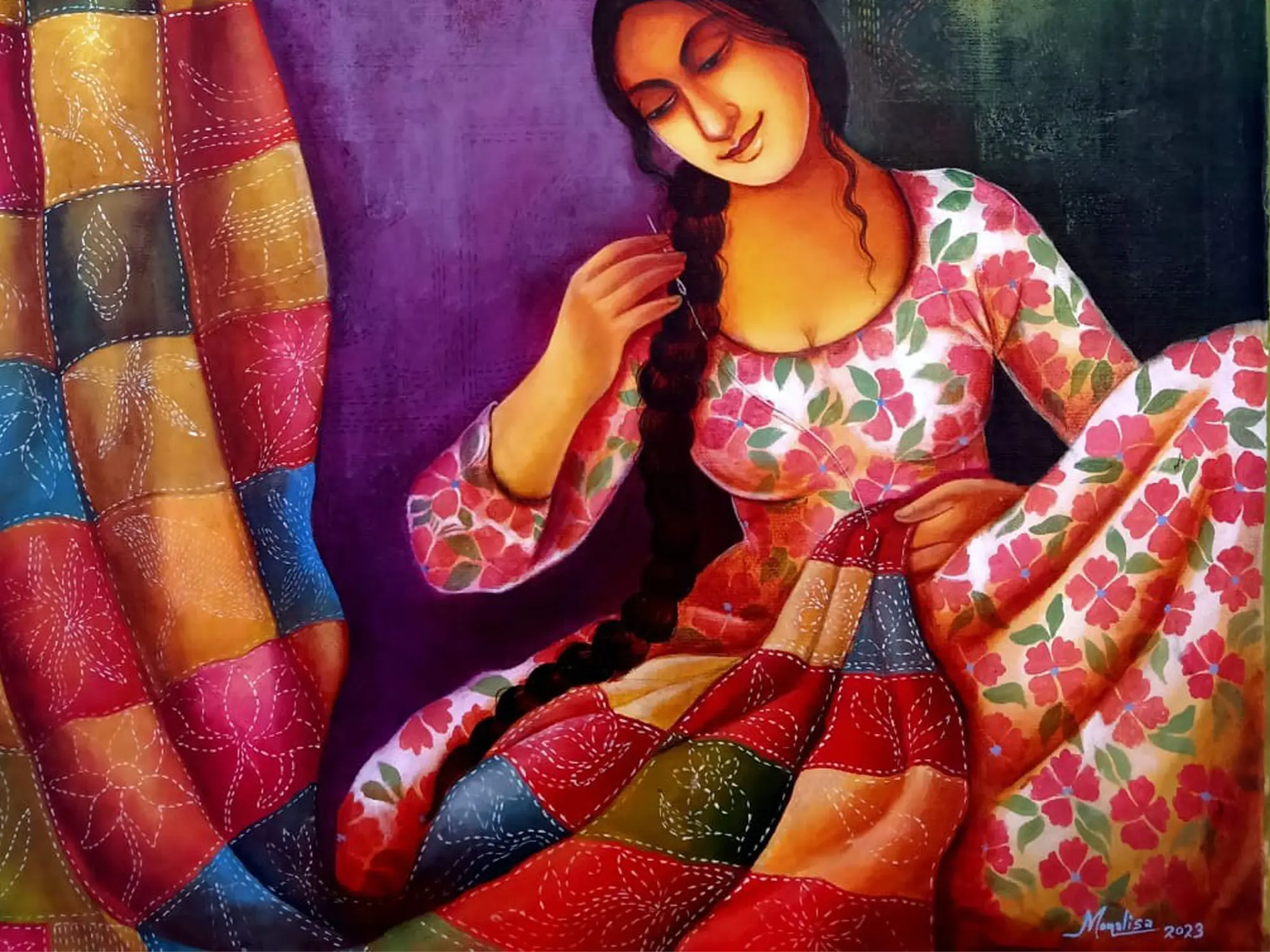 The canvas, breathing life into Supti Kantha, a woman sewing a colourful piece of fabric. The needle's rhythm, a symphony of unity, echoes the thread connecting generations. Each stitch is a thread of time, weaving moments of laughter and wisdom. Around her, a tapestry of faces whispers stories of shared dreams. As she stitches, the canvas reminds us: life is a masterpiece sewn together with love and shared experiences. In the hum of the needle, discover the joy of nurturing connections, as bonds grow stronger with every stitch.