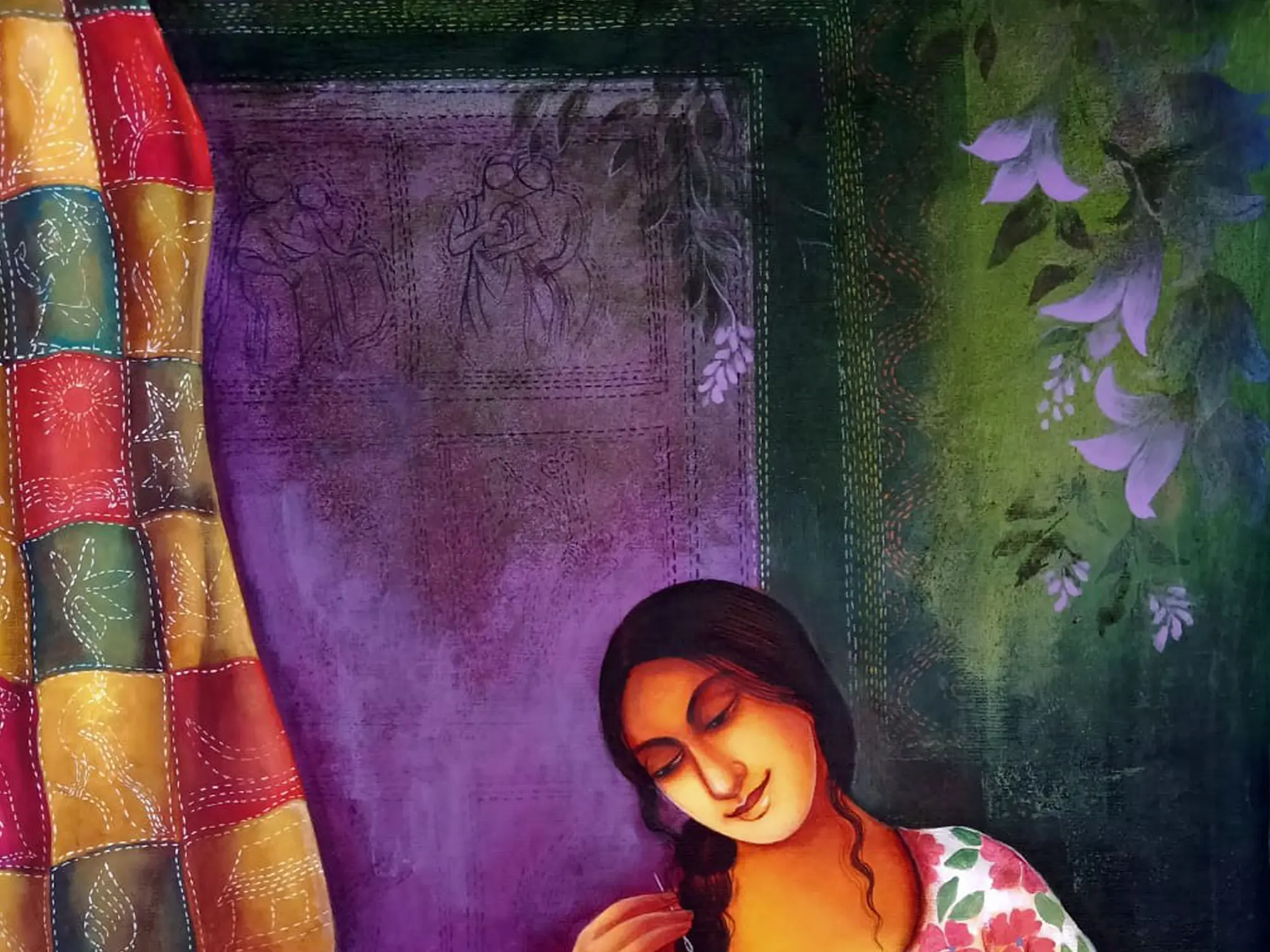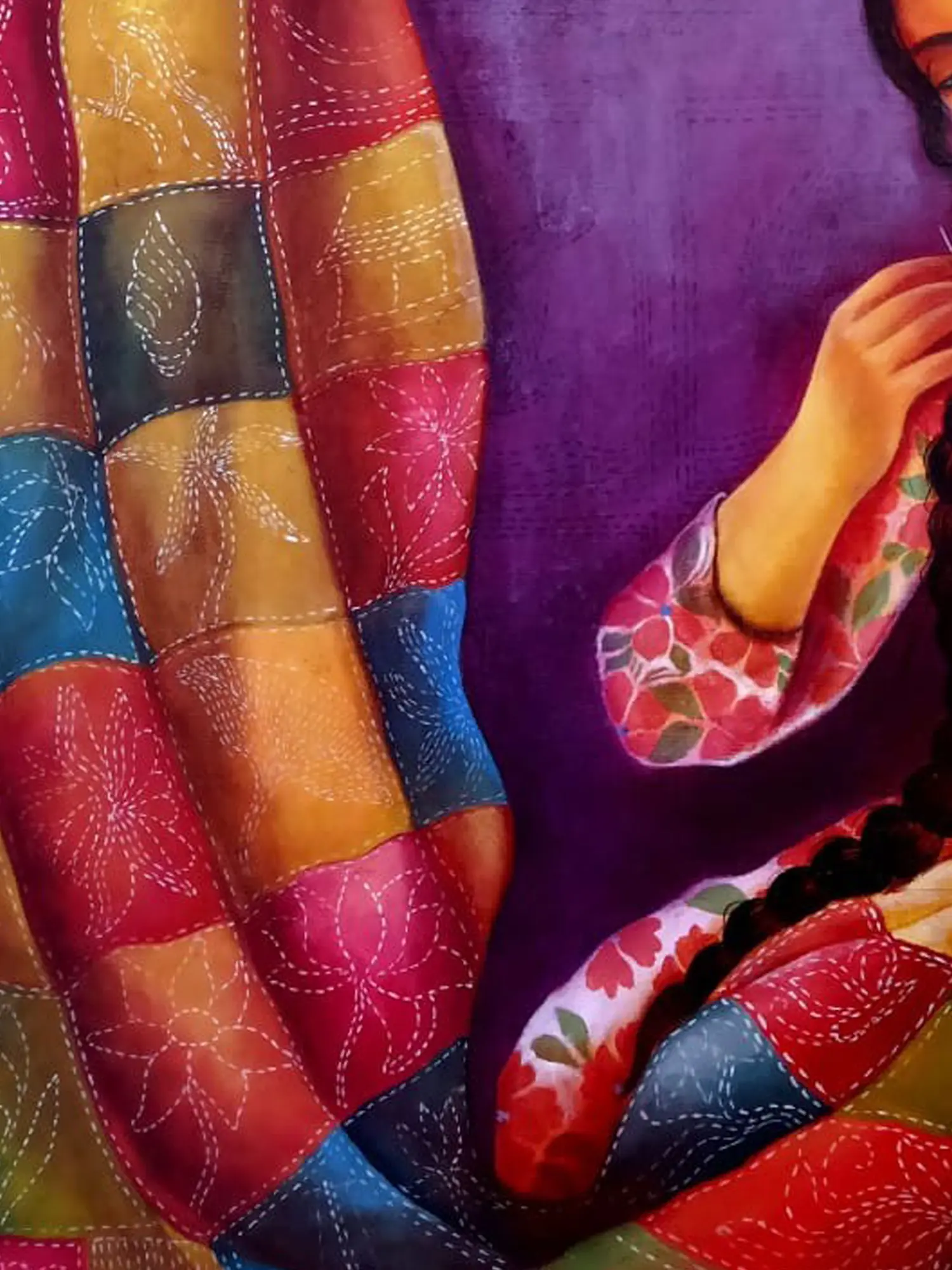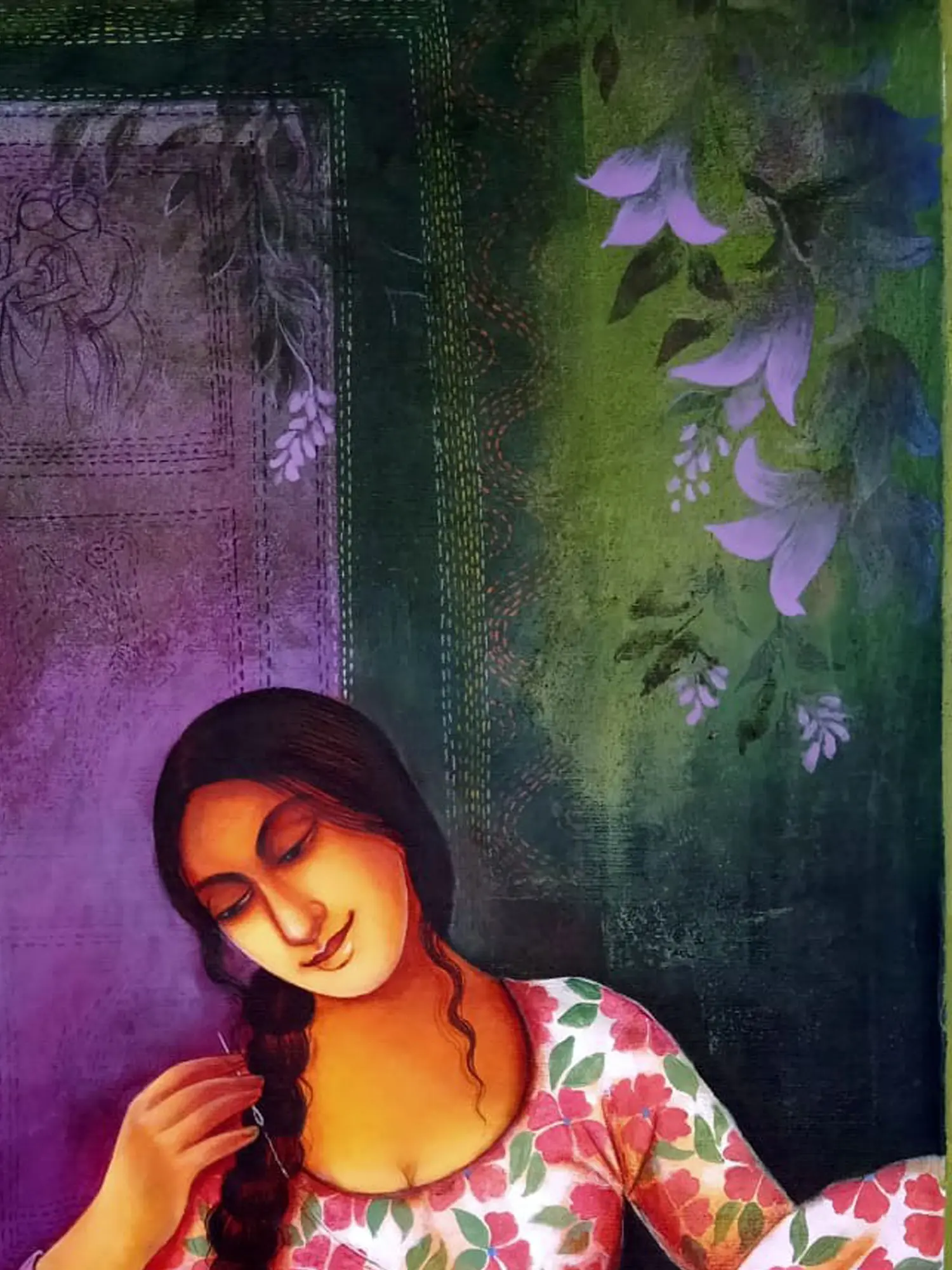 The canvas, breathing life into Supti Kantha, a woman sewing a colourful piece of fabric. The needle's rhythm, a symphony of unity, echoes the thread connecting generations. Each stitch is a thread of time, weaving moments of laughter and wisdom. Around her, a tapestry of faces whispers stories of shared dreams. As she stitches, the canvas reminds us: life is a masterpiece sewn together with love and shared experiences. In the hum of the needle, discover the joy of nurturing connections, as bonds grow stronger with every stitch.