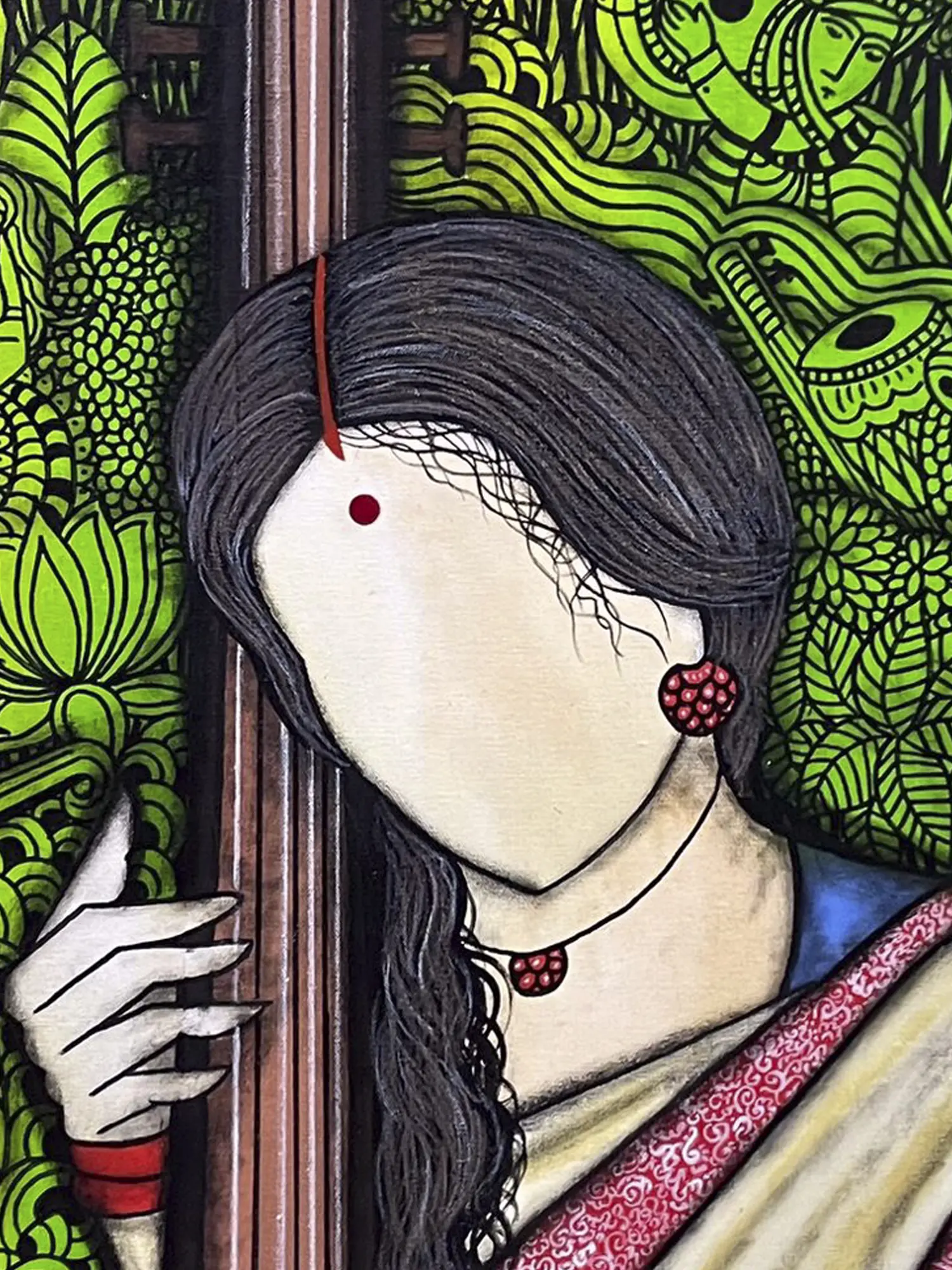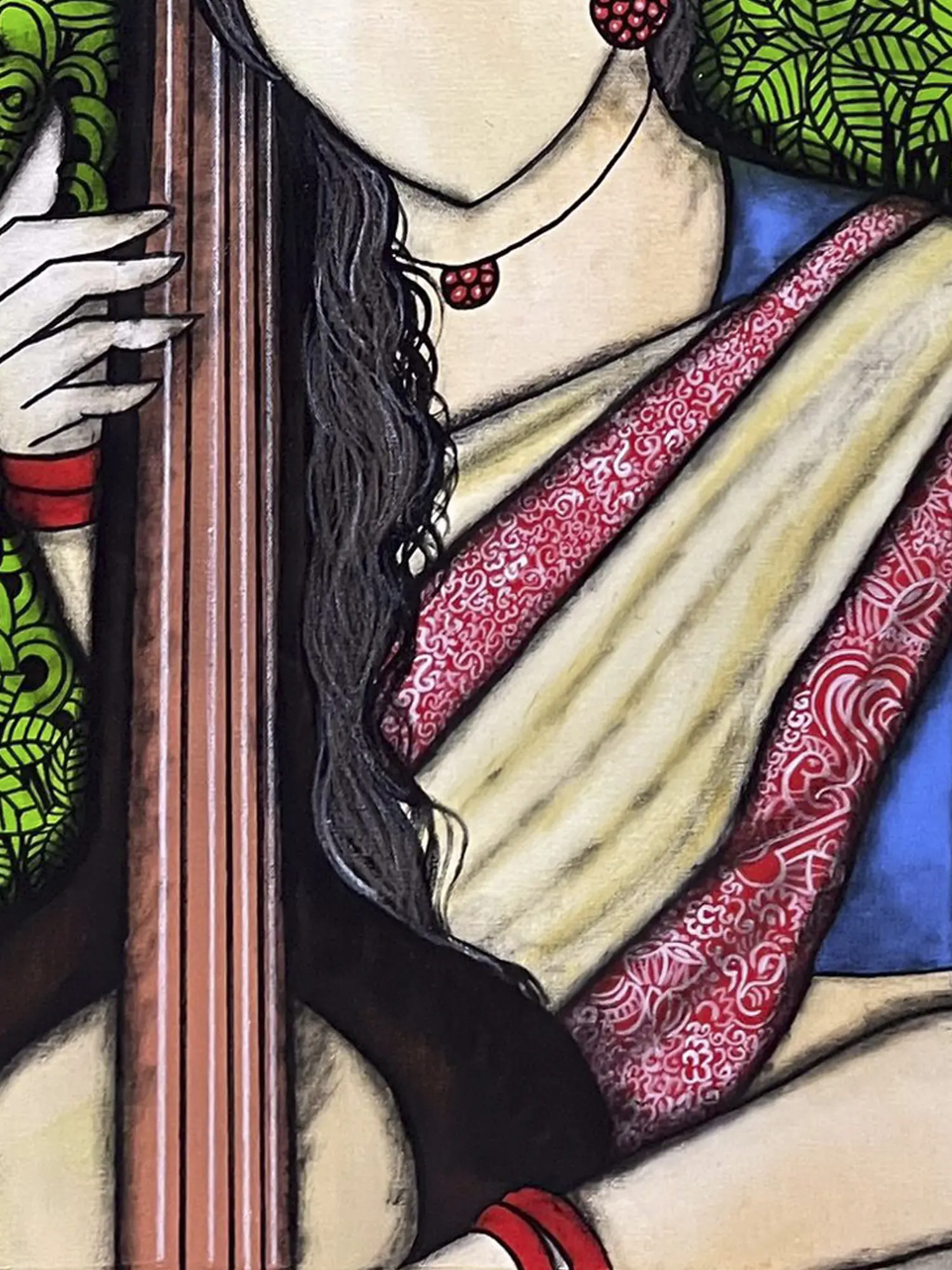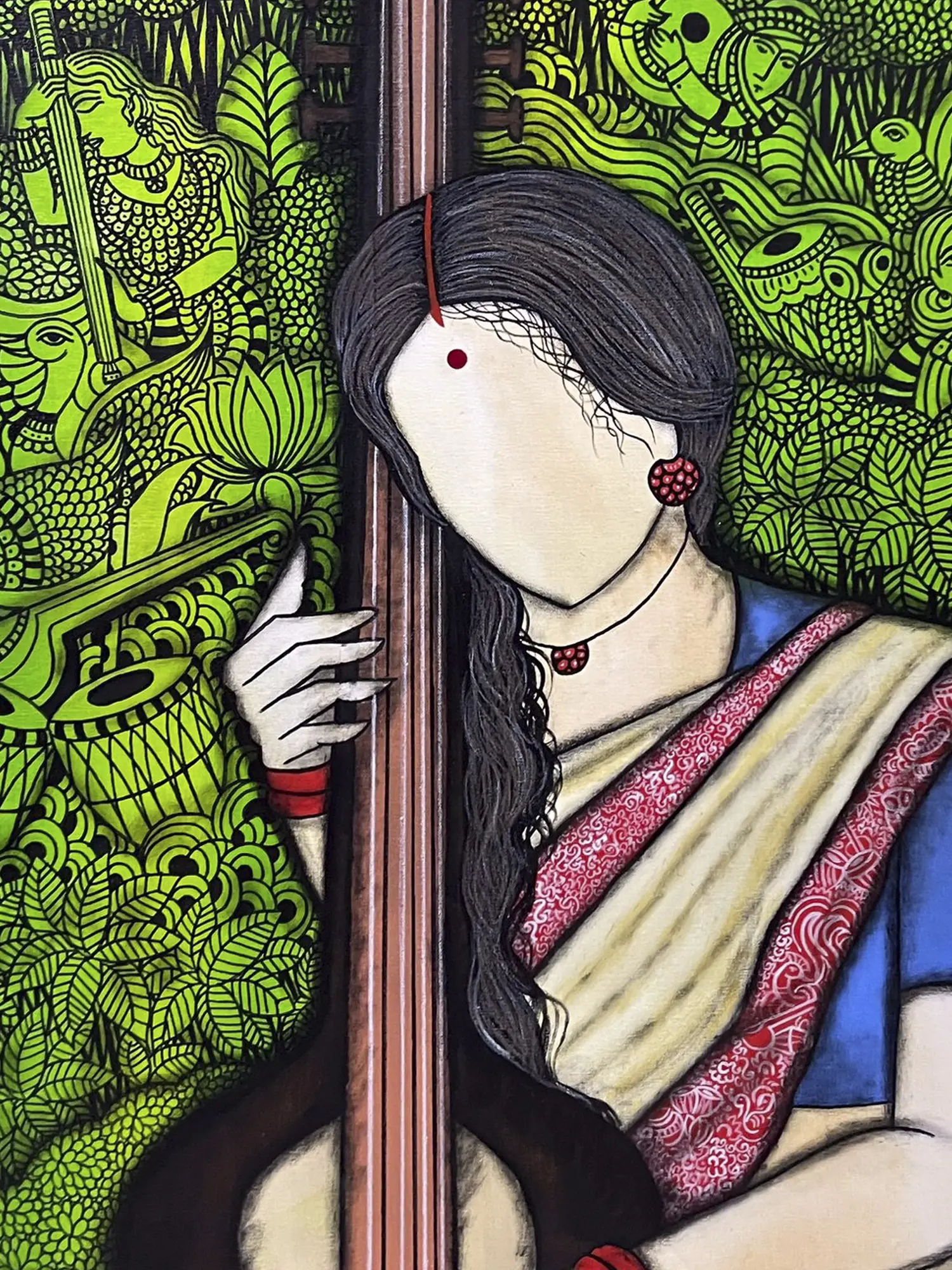 "Surmadhur" captures the melodic beauty of a lady with a veena, rendered in acrylic and wax on canvas. The fusion of mediums creates a unique texture, mirroring the harmonious blend of music and art. Each stroke harmonises with the strings, crafting a visual melody. The lady's gaze resonates with musical notes, inviting you to explore the intersection of sound and sight. In this acrylic and wax piece, experience the symphony of Sumadhur – where art and music become one.
