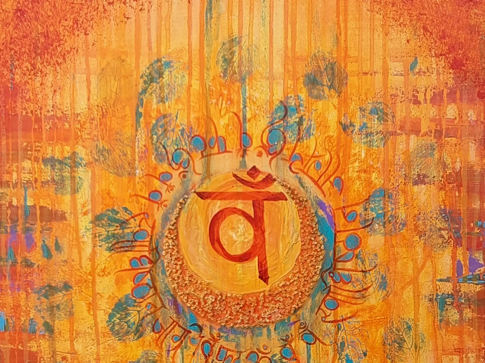 The artwork features a central mandala-like representation of the Swadhisthan Chakra, rendered in bold, glowing orange hues and accented with delicate teal patterns. Surrounding this core, a dynamic interplay of warm yellows and fiery oranges evokes a sense of boundless energy. Subtle textures and abstract linear elements add a contemporary edge, making this a truly unique visual experience.