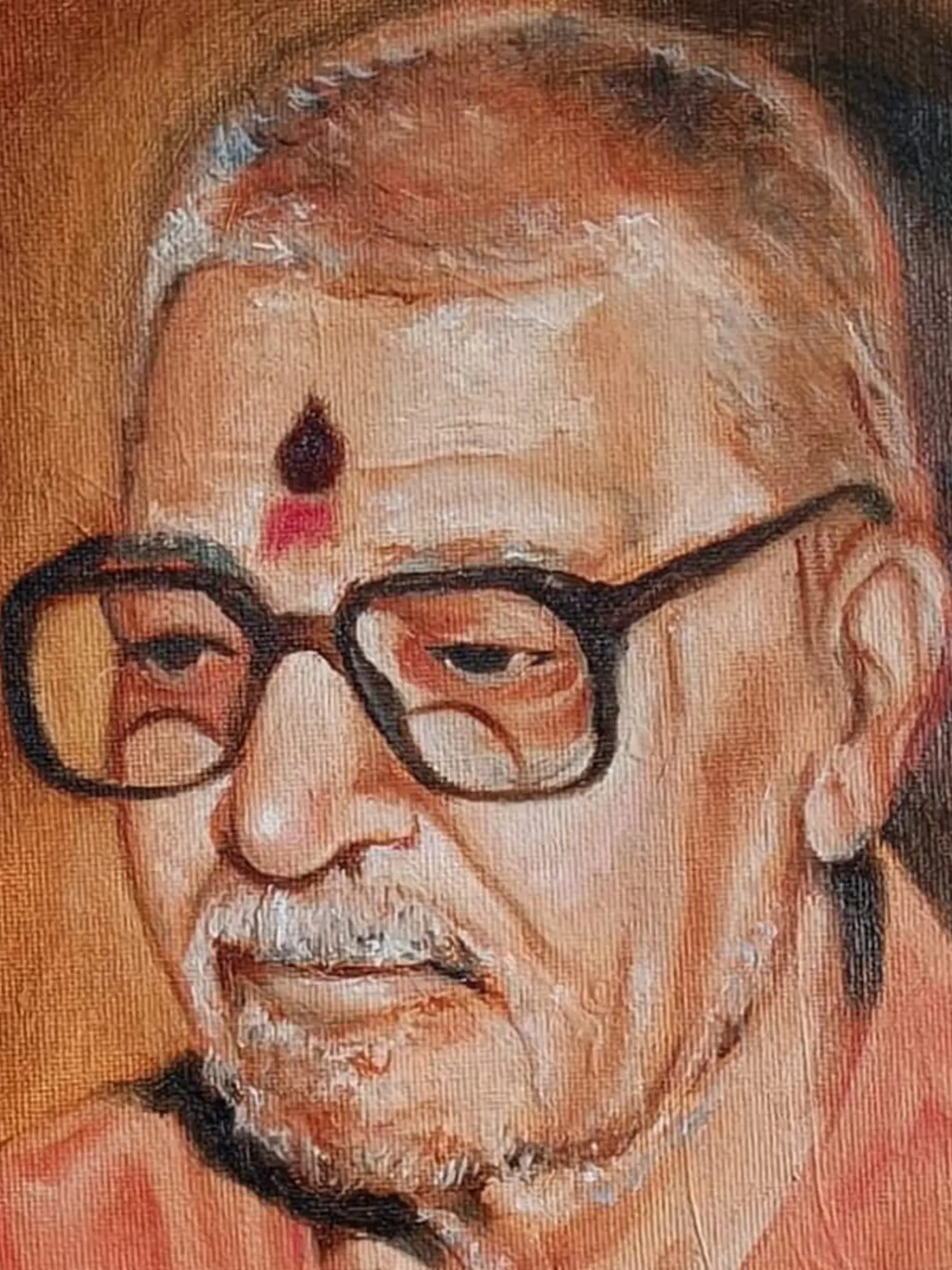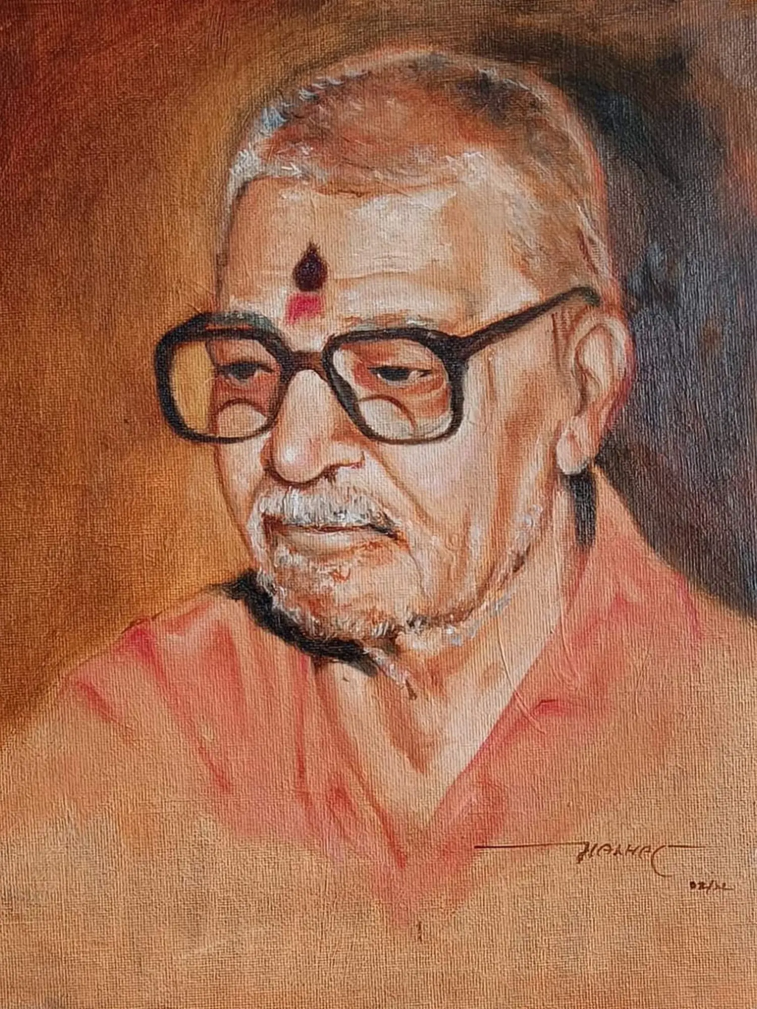 This exquisite oil on canvas painting by Malhar Ambulgekar captures the serene countenance of Swami Vardanandbharti, a figure who likely embodied spiritual depth and wisdom. The artist's skillful use of light and shadow creates a sense of quiet contemplation, drawing the viewer into the subject's inner world. The subtle hues of the painting, predominantly warm browns and soft oranges, further enhance this feeling of tranquility and peace. The artist's attention to detail is evident in the carefully rendered lines of Swami Vardanandbharti's face, from the gentle curve of his lips to the thoughtful gaze behind his spectacles. The small, dark bindi on his forehead—a traditional mark signifying spirituality and devotion in many Indian cultures—adds a touch of cultural significance to the portrait. The bindi, a small dot, holds immense symbolism, representing the third eye, the seat of intuition and inner wisdom. In Hindu mythology, the third eye is associated with Shiva, the god of destruction and transformation, representing enlightenment and the ability to perceive beyond the mundane. This seemingly small detail enriches the painting, adding a layer of meaning beyond the mere visual representation. The painting invites viewers to reflect on the themes of spirituality, contemplation, and the enduring power of faith.