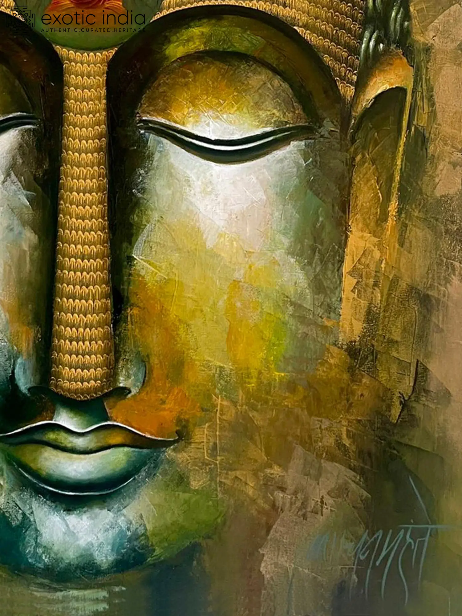 This breathtaking acrylic on canvas painting, a creation by the talented Kanchan Mahante, captures the essence of serenity and enlightenment. The artist's masterful use of the nib technique brings a unique texture and depth to the piece, transforming the Buddha's countenance into a meditation in itself. The rich, earthy tones of gold, green, and brown evoke a sense of ancient wisdom and timeless peace. The large scale of the artwork, measuring 36 inches in height and width, commands attention and adds a powerful statement to any space. The intricate details, from the subtly textured ushnisha (the topknot representing wisdom) to the calm expression on the Buddha's face, invite contemplation and reflection.