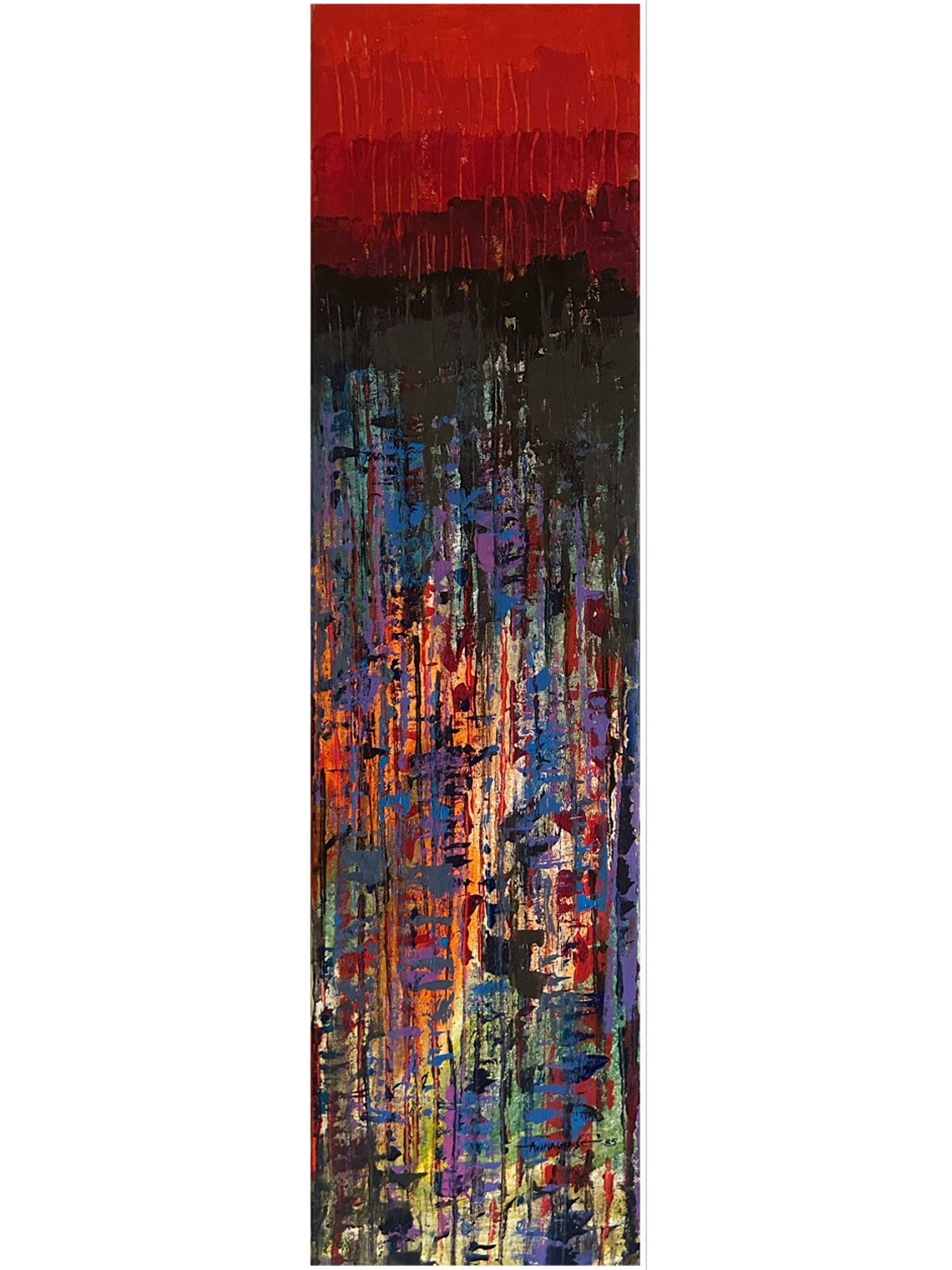 While abstract, this piece can evoke the spirit of ancient Indian art, where color and form often served as conduits for profound narratives and spiritual exploration. The verticality and bold color blocking might suggest the dramatic descent of a deity or the energetic flow of cosmic forces. It speaks to a modern interpretation of timeless artistic impulses.