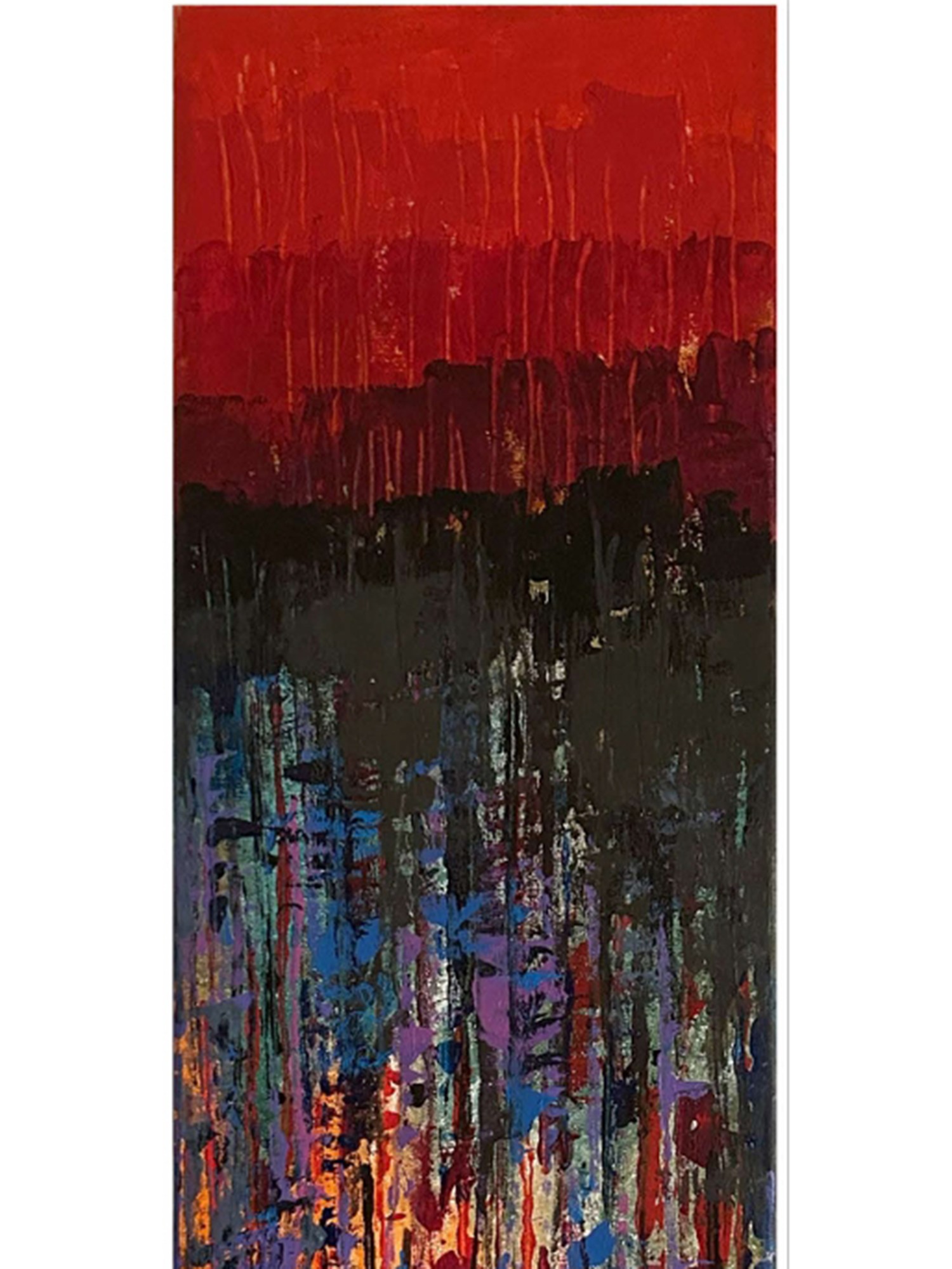 Observe the masterful composition, where a fervent crimson sky dissolves into a deep, enigmatic black. Below this dramatic transition, a vibrant cascade of blues, purples, oranges, and yellows emerges, suggesting a hidden world illuminated by ethereal light. You’ll appreciate the subtle variations in hue and the textured surface that invites closer inspection.
