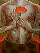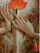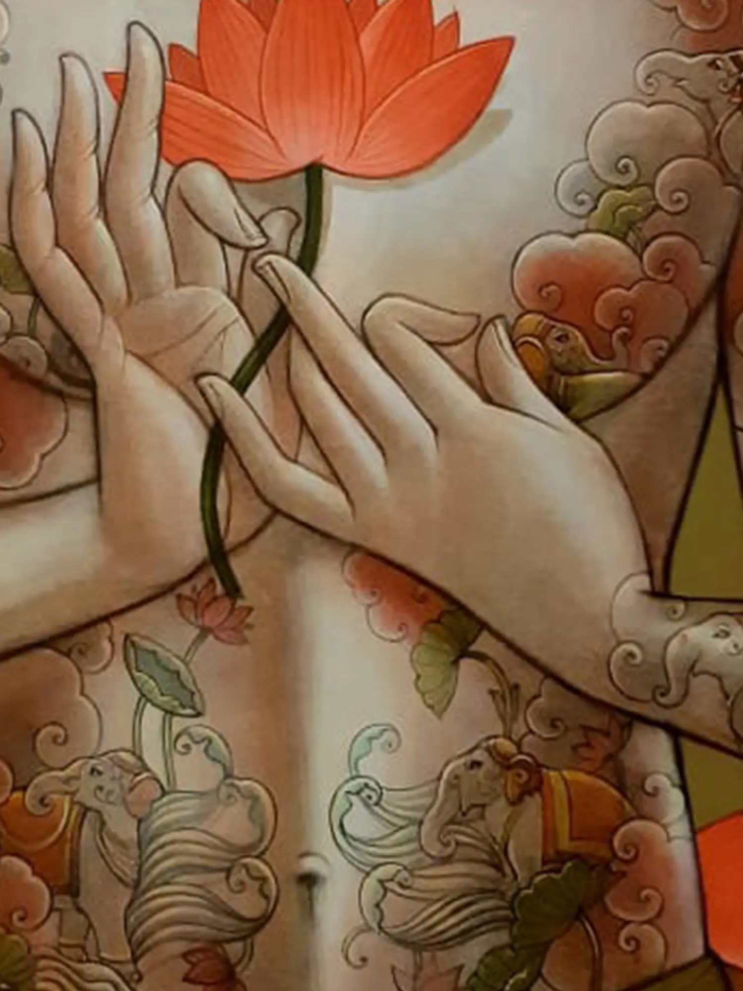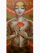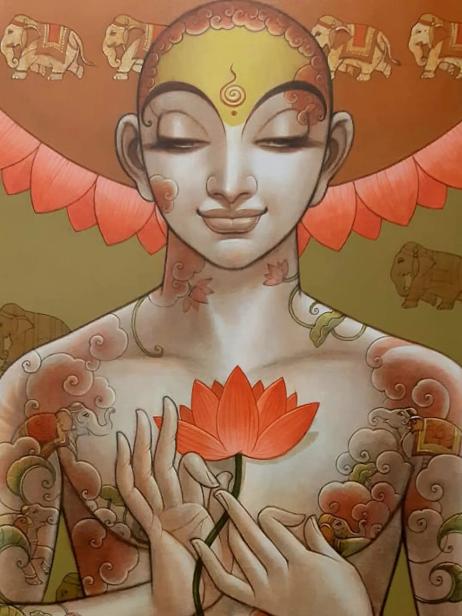 The artwork features a unique rendition of the Buddha, adorned with symbolic motifs that are deeply rooted in Buddhist tradition and Indian art. The figure is depicted with a peaceful expression, eyes gently closed in meditation, conveying a sense of inner peace and tranquility. He holds a vibrant lotus flower, a powerful symbol of purity, spiritual awakening, and enlightenment. Just as the lotus rises from muddy waters to bloom in pristine beauty, the lotus represents the potential for the human spirit to overcome suffering and attain enlightenment. The placement of the lotus, directly at the heart, is a visual reminder of the importance of cultivating compassion and wisdom.