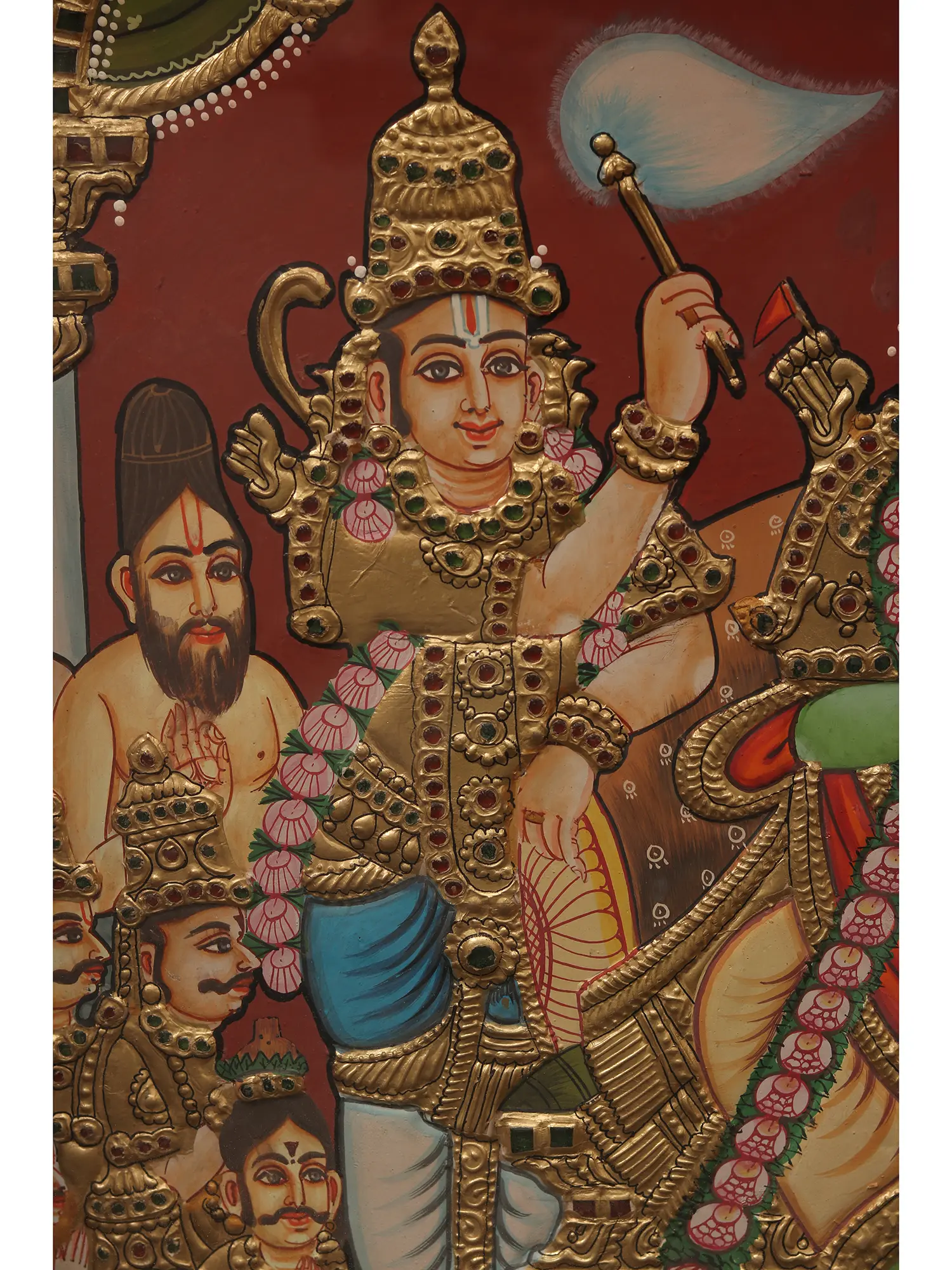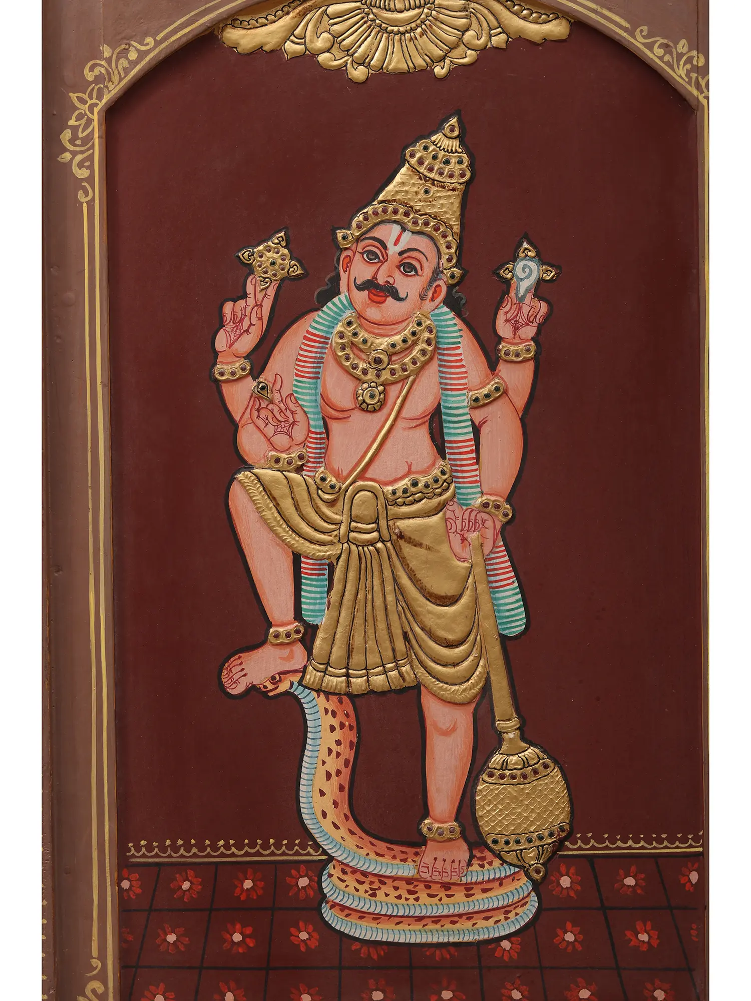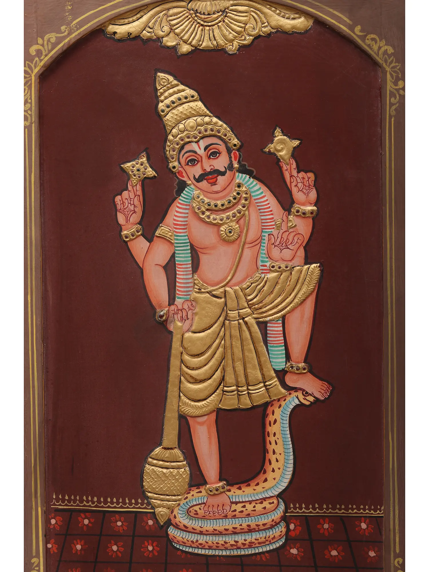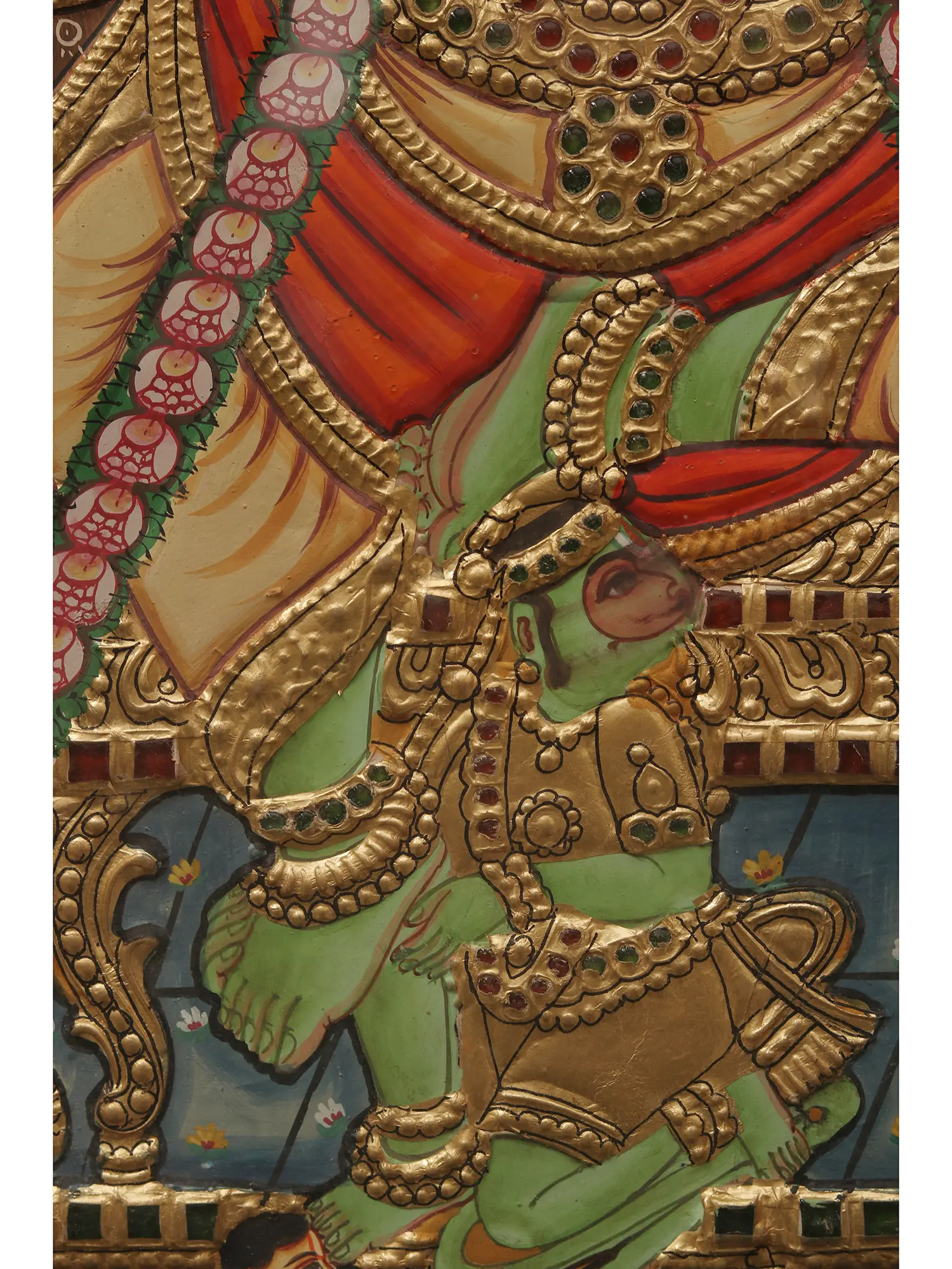 Crafted using the time-honored techniques of Tanjore painting, each detail is meticulously rendered by skilled artisans. The vibrant traditional colors are applied with precision, creating a depth and richness that speaks of generations of artistic heritage. Infused with genuine 24-karat gold leaf, the artwork shimmers with an ethereal radiance, elevating its spiritual and aesthetic qualities to a divine level. The intricate application of gold highlights the divine figures and decorative elements, imbuing the piece with a luxurious and sacred aura.