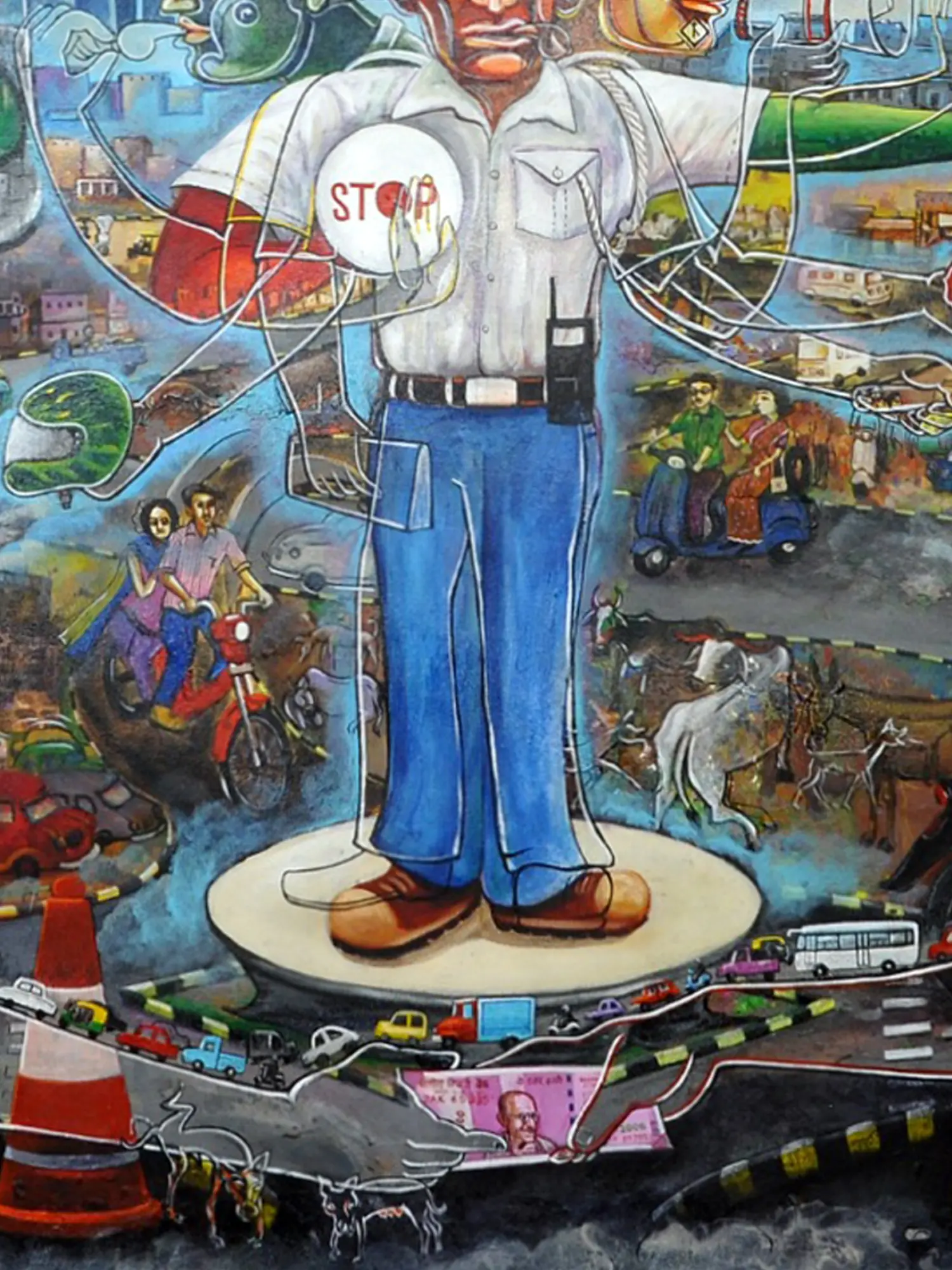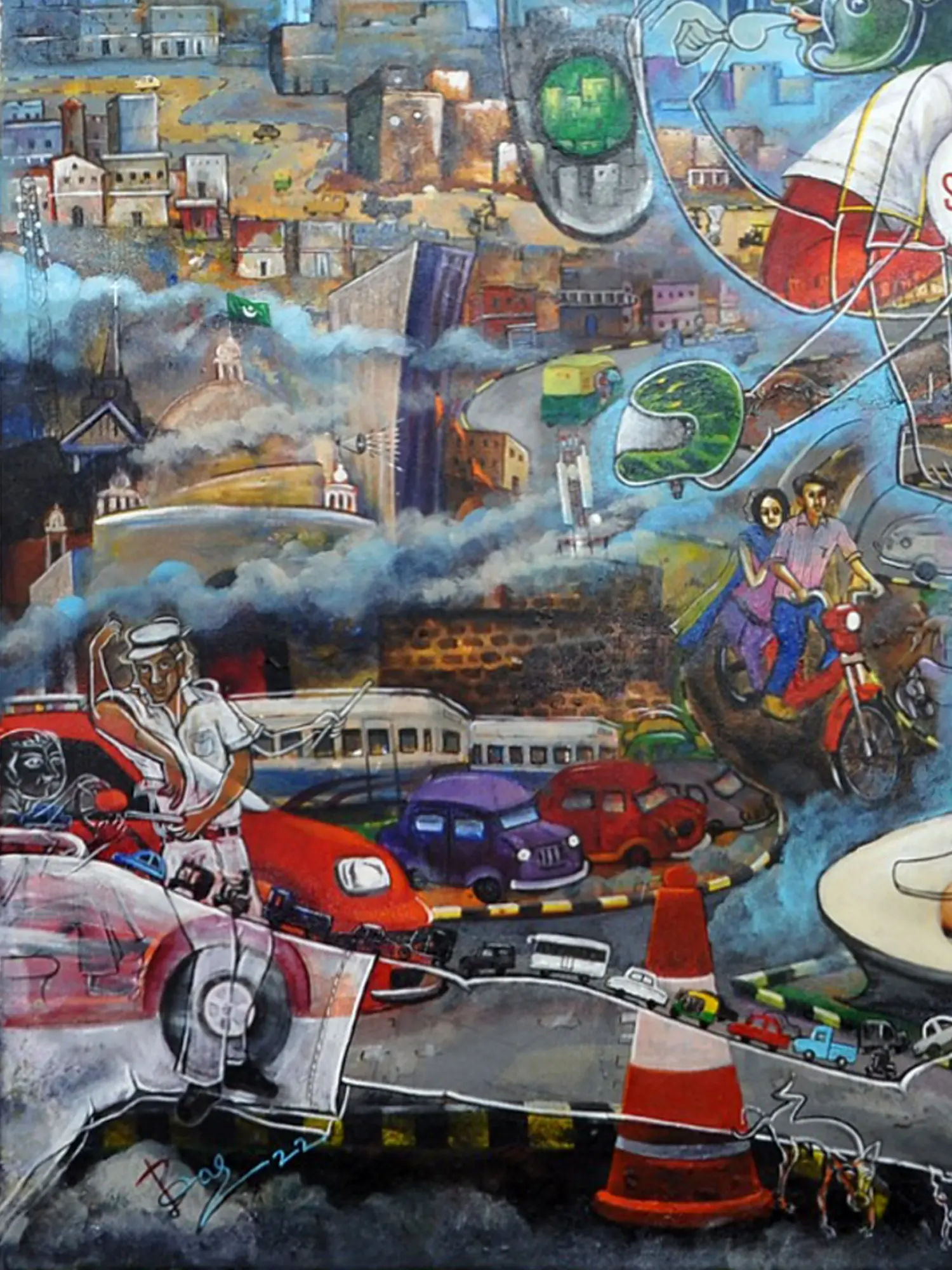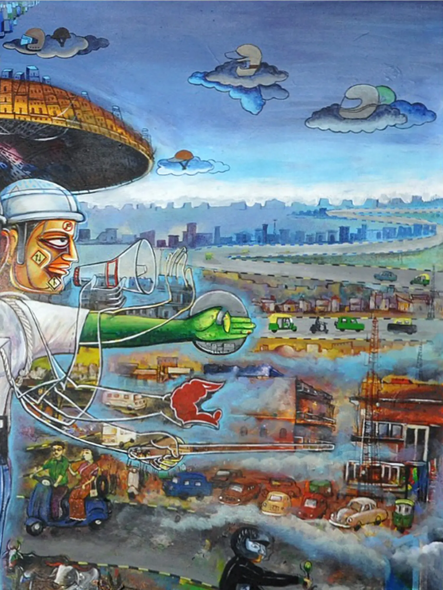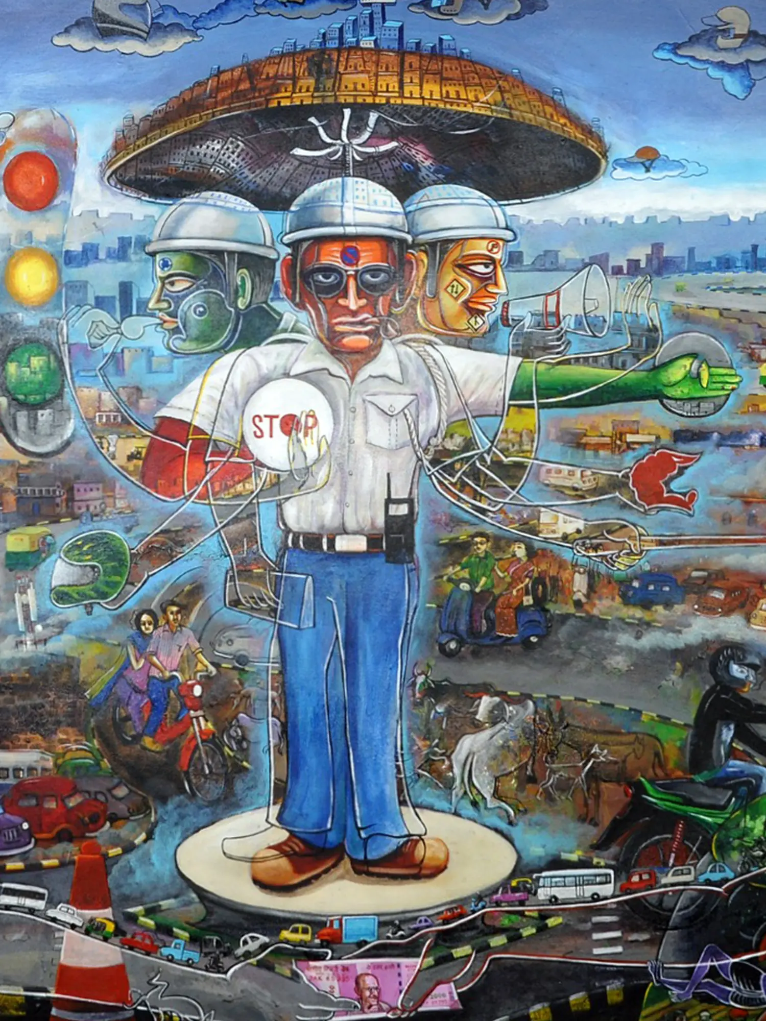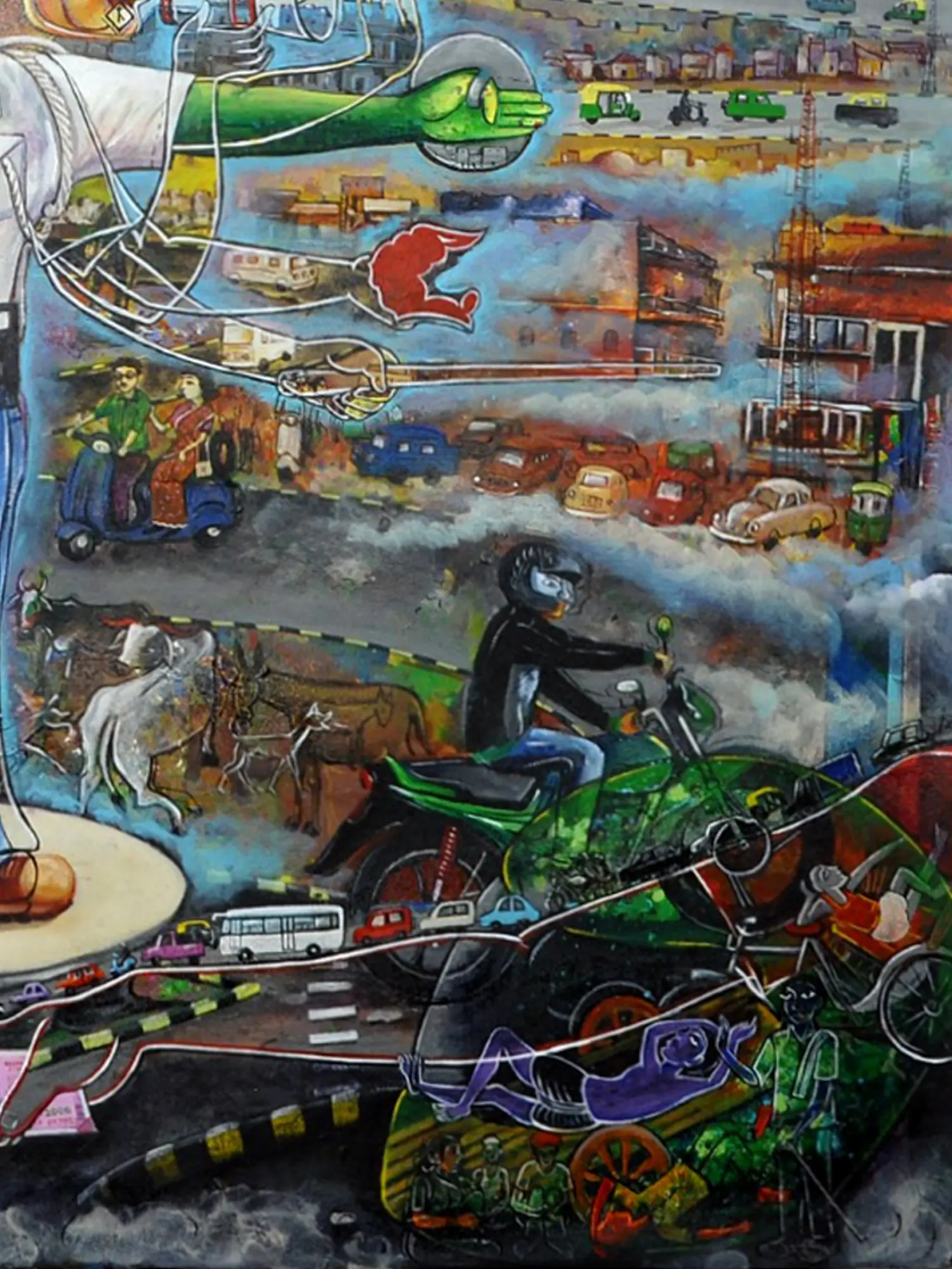 Surrounding the central figure is a bustling city scene, replete with a rich tapestry of vehicles, pedestrians, and architectural elements. Cars, scooters, rickshaws, buses, and even animals weave their way through the streets, creating a dynamic and intricate composition. The artist's attention to detail is evident in the depiction of each vehicle, person, and element of the background cityscape. This meticulous rendering creates a sense of depth and immersion, drawing the viewer into the heart of the scene. The composition is full of symbolic imagery, suggesting the artist’s deep observation of and engagement with their urban environment. The chaotic yet organized nature of the artwork reflects the daily lives of millions in big cities around the world.