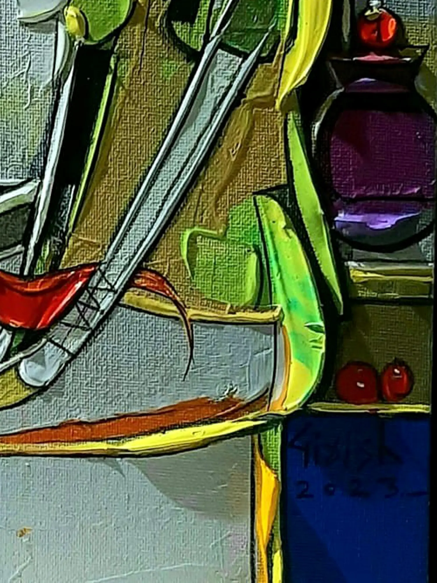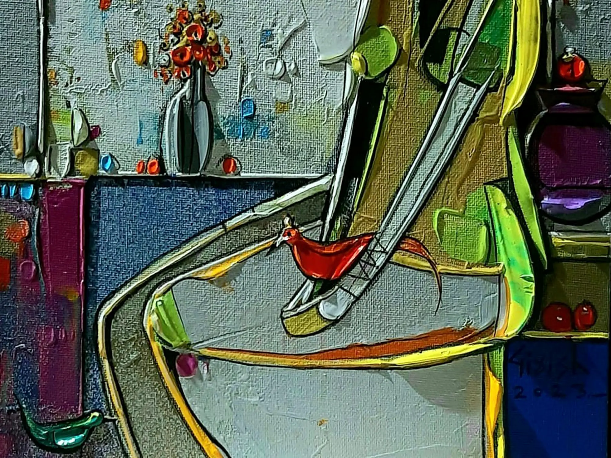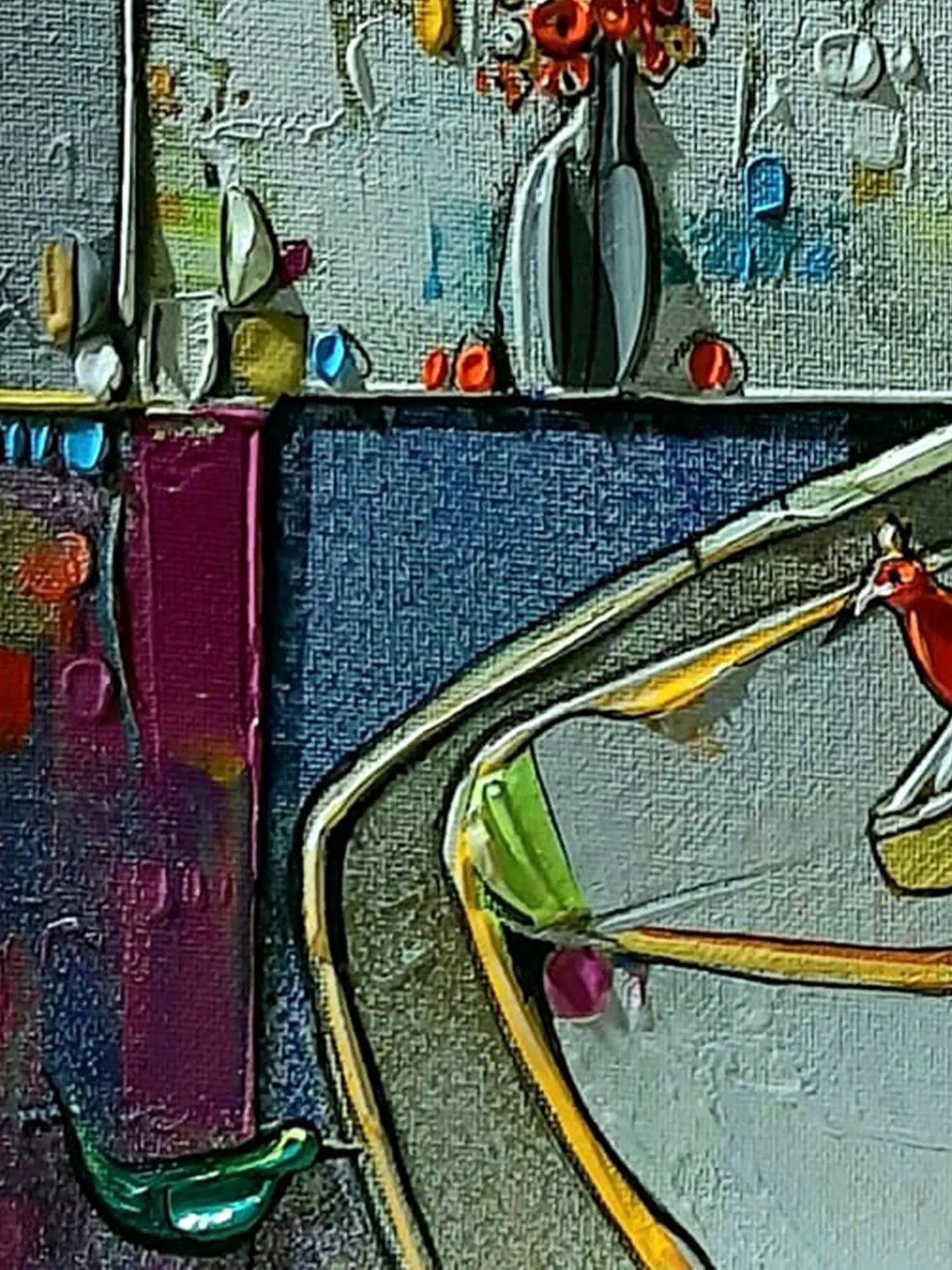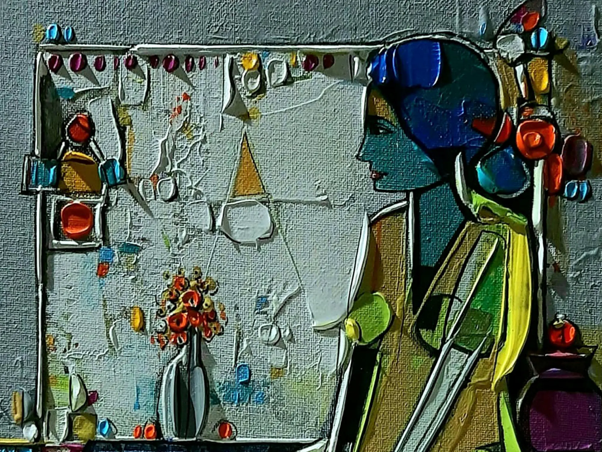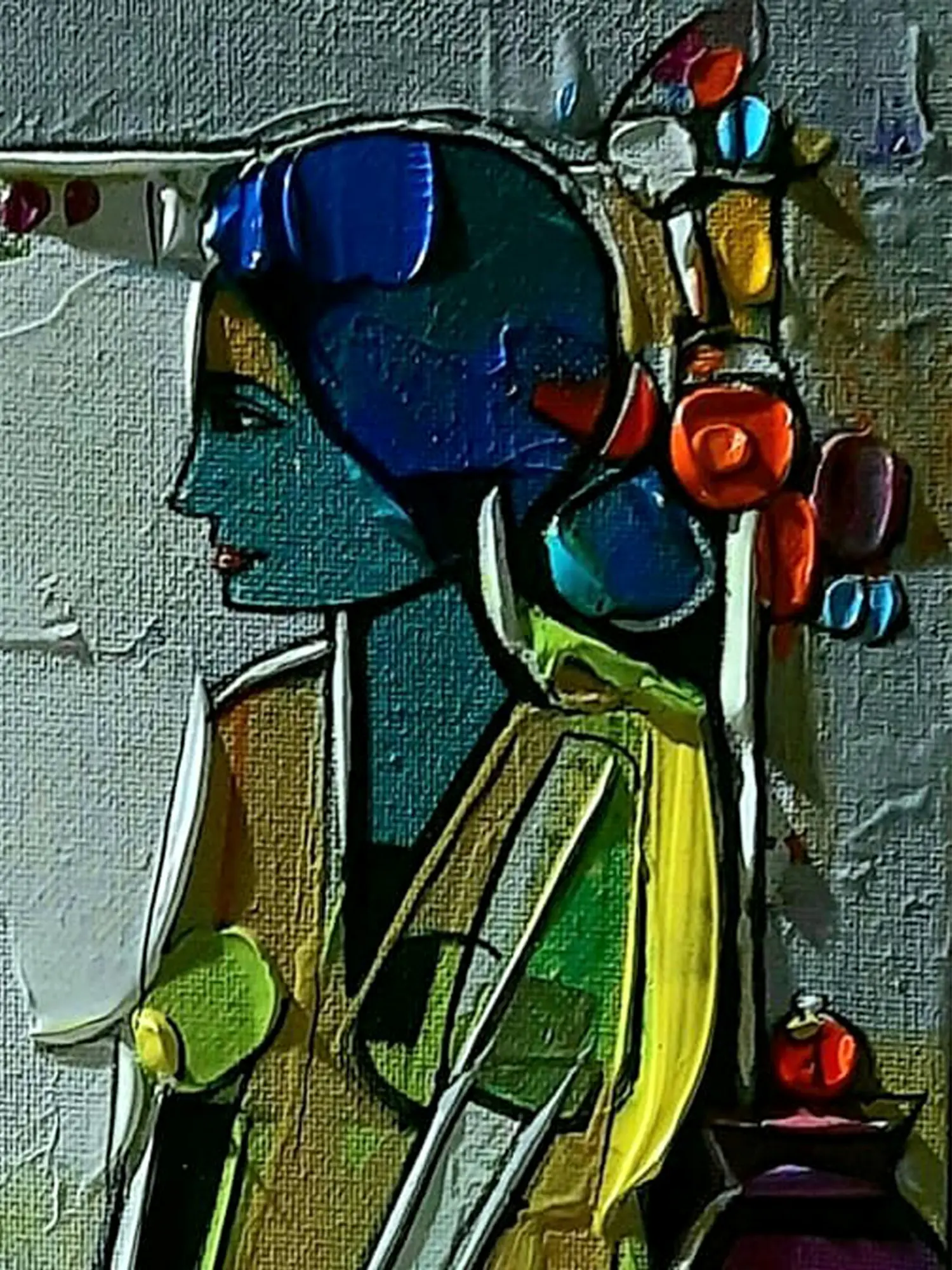 The dynamic interplay of cool blues and greens against warm yellows and reds creates a captivating visual tension. Observe the bold outlines that define the subject and her surroundings, lending a graphic quality that enhances the overall impact. The textured surface catches the light, revealing subtle nuances and adding a tangible dimension that draws the viewer closer.