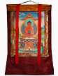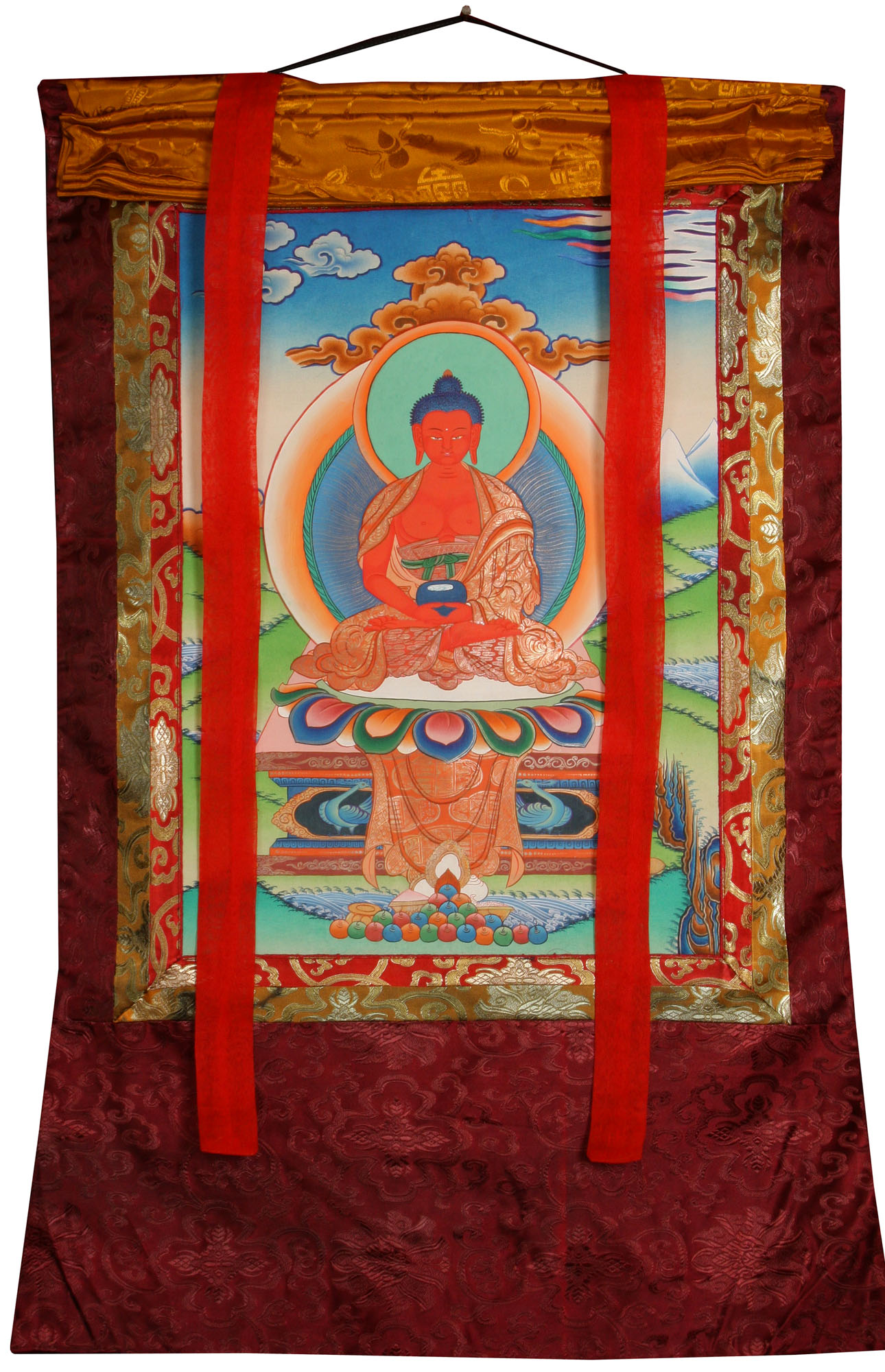A Thangka is a traditional Tibetan Buddhist painting that usually depicts a Buddhist Deity (Buddha or Bodhisattva), a scene, or a mandala. These paintings are considered important paraphernalia in Buddhist rituals. They are used to teach the life of the Buddha, various lamas, and Bodhisattvas to the monastic students, and are also useful in visualizing the deity while meditating. One of the most important subjects of thangkas is the Bhavacakra (the wheel of life) which depicts the Art of Enlightenment. It is believed that Thangka paintings were developed over the centuries from the murals, of which only a few can be seen in the Ajanta caves in India and the Mogao caves in Gansu Province, Tibet. Thangkas are painted on cotton or silk applique and are usually small in size. The artist of these paintings is highly trained and has a proper understanding of Buddhist philosophy, knowledge, and background to create a realistic and bona fide painting.