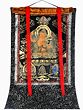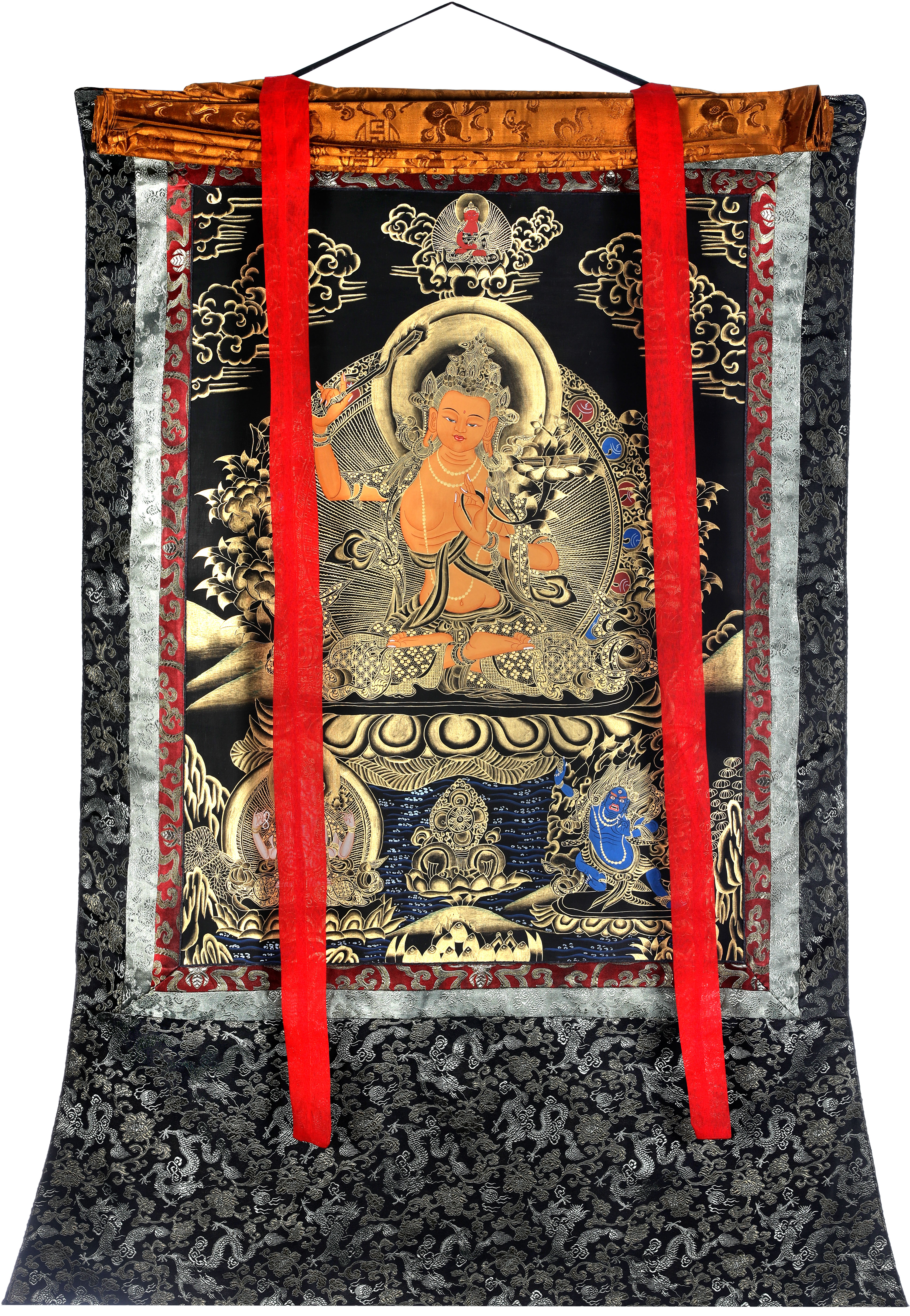 A Thangka is a traditional Tibetan Buddhist painting that usually depicts a Buddhist Deity (Buddha or Bodhisattva), a scene, or a mandala. These paintings are considered important paraphernalia in Buddhist rituals. They are used to teach the life of the Buddha, various lamas, and Bodhisattvas to the monastic students, and are also useful in visualizing the deity while meditating. One of the most important subjects of thangkas is the Bhavacakra (the wheel of life) which depicts the Art of Enlightenment. It is believed that Thangka paintings were developed over the centuries from the murals, of which only a few can be seen in the Ajanta caves in India and the Mogao caves in Gansu Province, Tibet. Thangkas are painted on cotton or silk applique and are usually small in size. The artist of these paintings is highly trained and has a proper understanding of Buddhist philosophy, knowledge, and background to create a realistic and bona fide painting.