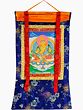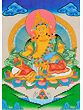 True to tradition, this painting depicts Vaishravana with a golden face and skin. He usually carries a parasol as a sign of sovereignty but in this Tibetan interpretation, he is holding a citron. This a fruit from the jambhara tree, a play on his other name, Jambhala. The citron, instead of the umbrella, is a good way to distinguish Vaishravana from Kuvera. The mongoose animal which is drawn ejecting jewels from its mouth which a symbol of generosity and the defeat over Nagas, the snake guardians of wealth. He is also usually depicted in opulent green clothing and a golden body to symbolize his wealth. His attitude toward wealth is considered as freeing, as it is a way to bestow prosperity and giving and focus more on the spiritual journey rather than materialism.