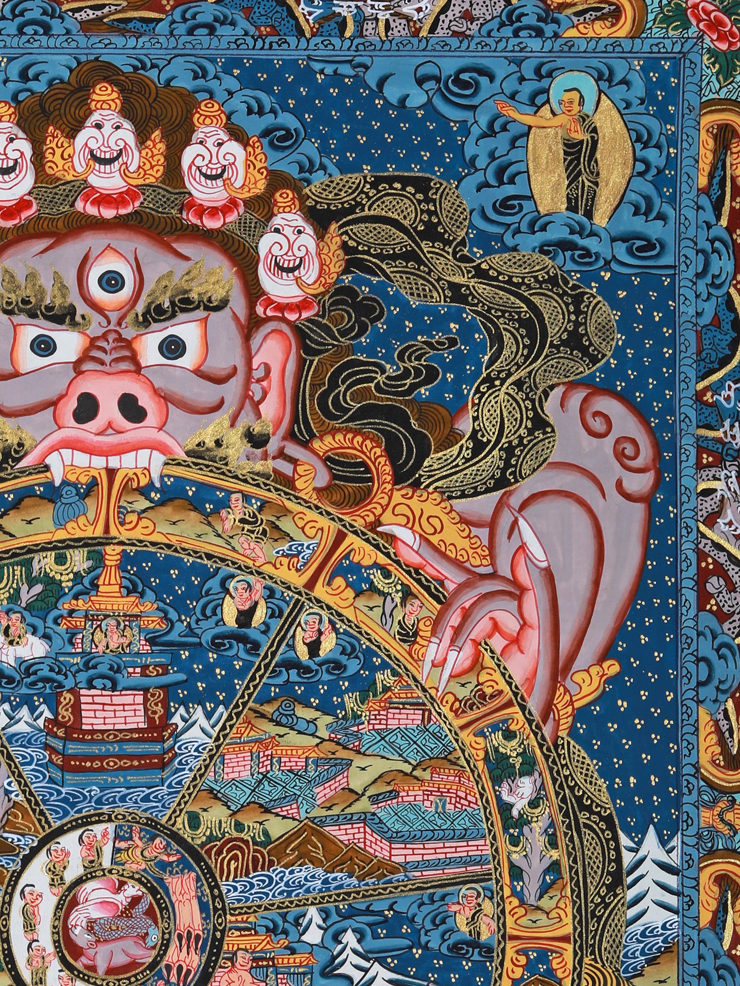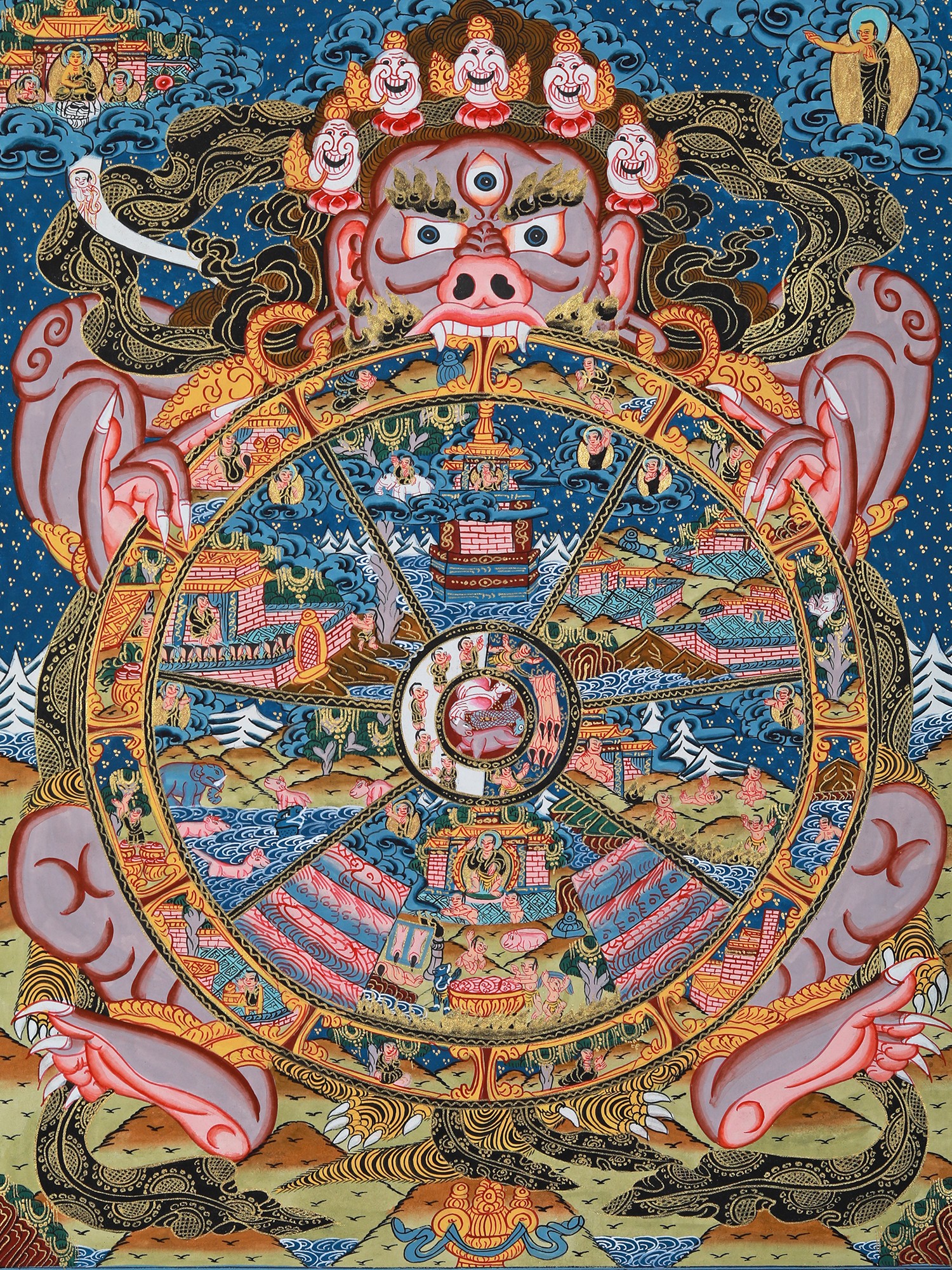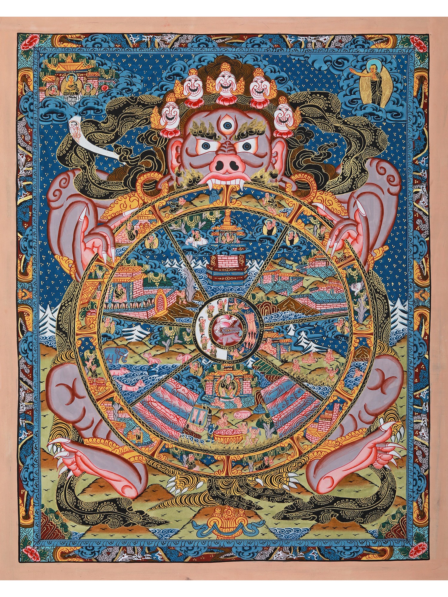 This beautiful Thangka painting is more than just a piece of art; it's a window into the rich spiritual and artistic heritage of Tibet. It is a powerful teaching tool, suitable for personal meditation or as a focal point for contemplation in a home setting. Hanging this Thangka will not only beautify your space but also serve as a constant reminder of the impermanence of life and the importance of cultivating compassion and wisdom. The vibrant colours and precise details are not only aesthetically pleasing but also carry deep symbolic meaning, offering a multi-layered experience for viewers familiar with Buddhist philosophy, as well as offering a captivating visual experience for those exploring the subject for the first time. This Thangka is a valuable heirloom, a piece of art history, and a profound meditation on the human condition.