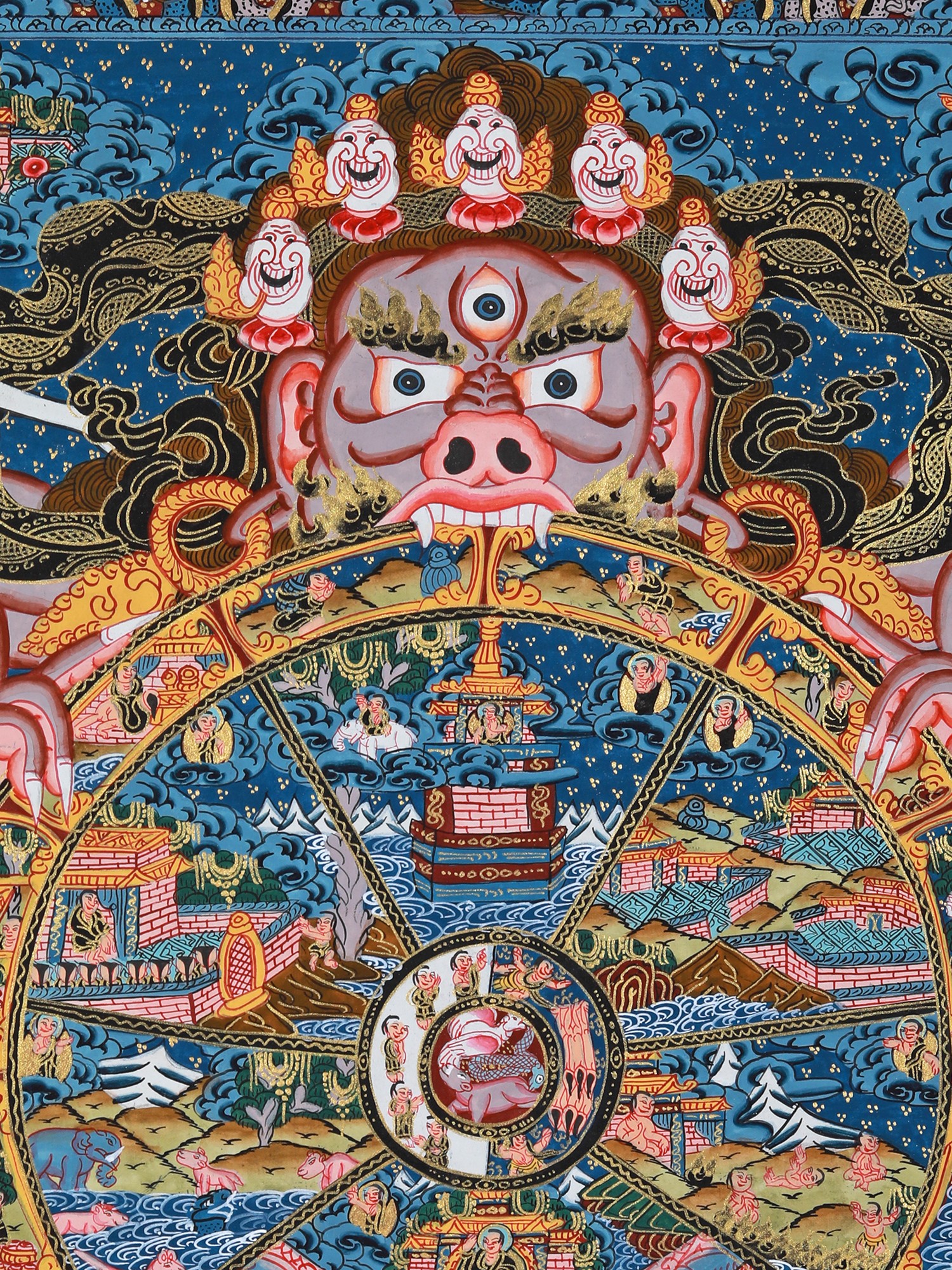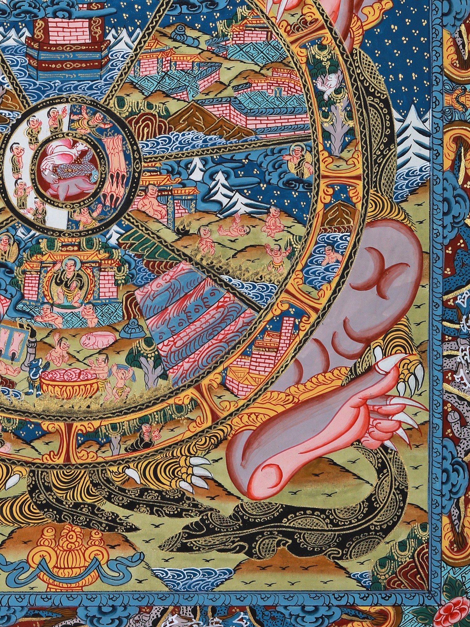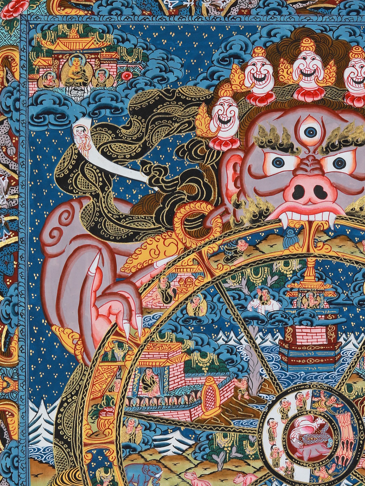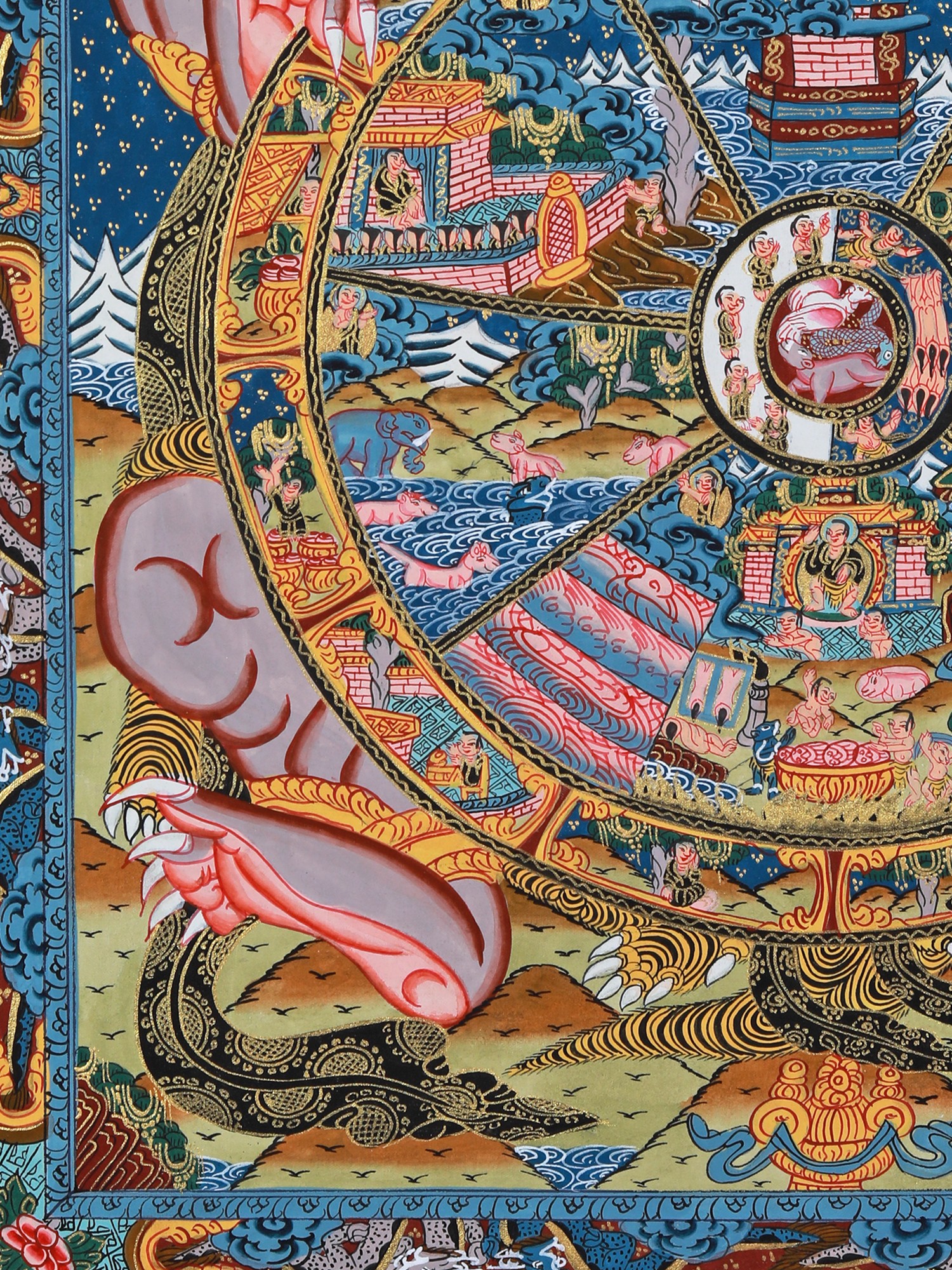 This beautiful Thangka painting is more than just a piece of art; it's a window into the rich spiritual and artistic heritage of Tibet. It is a powerful teaching tool, suitable for personal meditation or as a focal point for contemplation in a home setting. Hanging this Thangka will not only beautify your space but also serve as a constant reminder of the impermanence of life and the importance of cultivating compassion and wisdom. The vibrant colours and precise details are not only aesthetically pleasing but also carry deep symbolic meaning, offering a multi-layered experience for viewers familiar with Buddhist philosophy, as well as offering a captivating visual experience for those exploring the subject for the first time. This Thangka is a valuable heirloom, a piece of art history, and a profound meditation on the human condition.