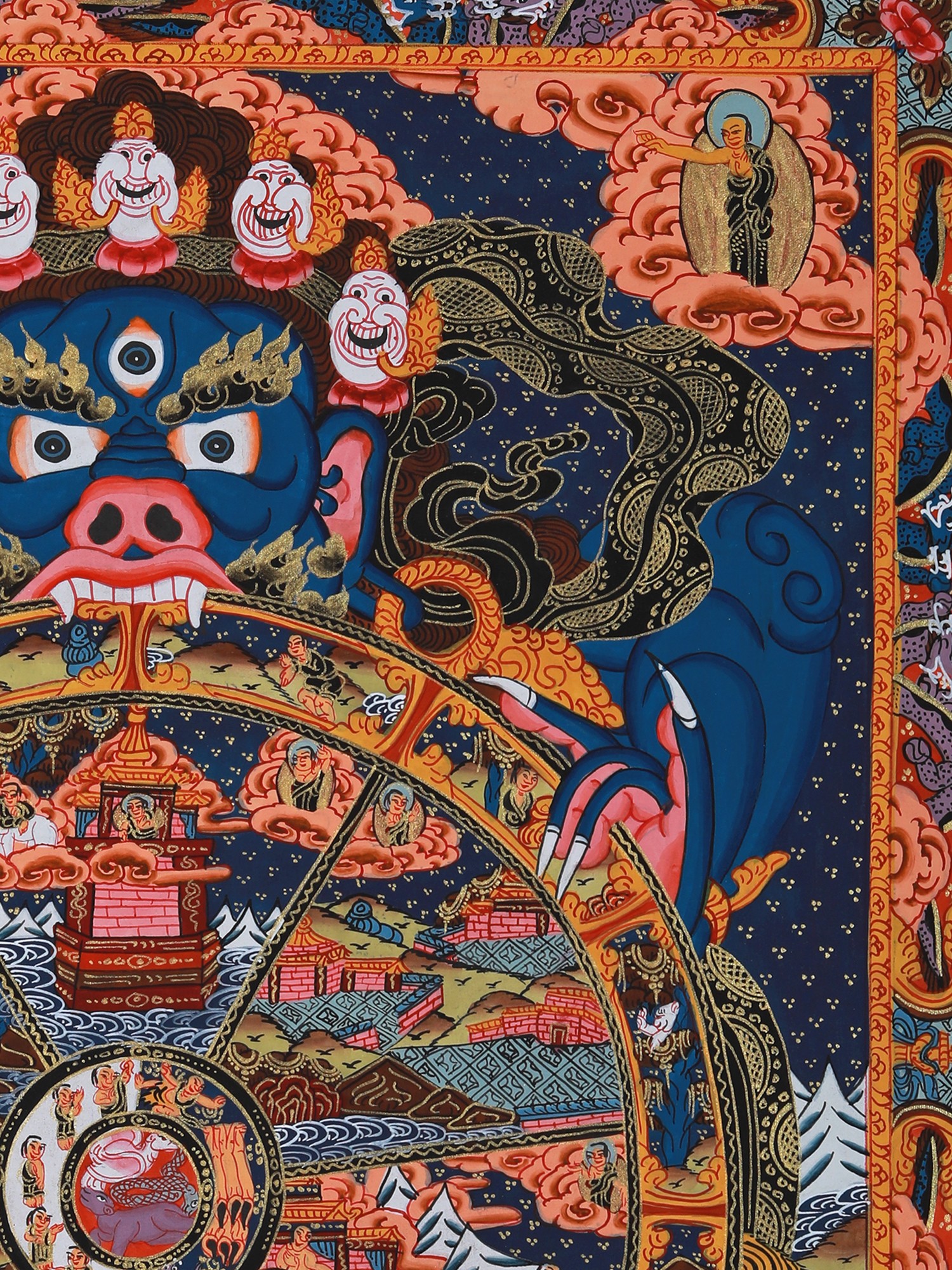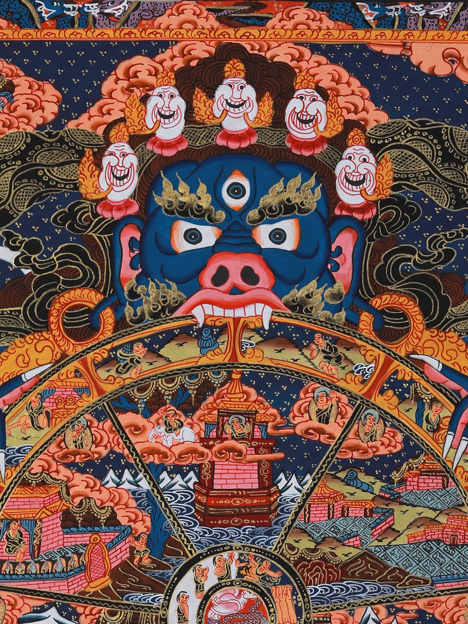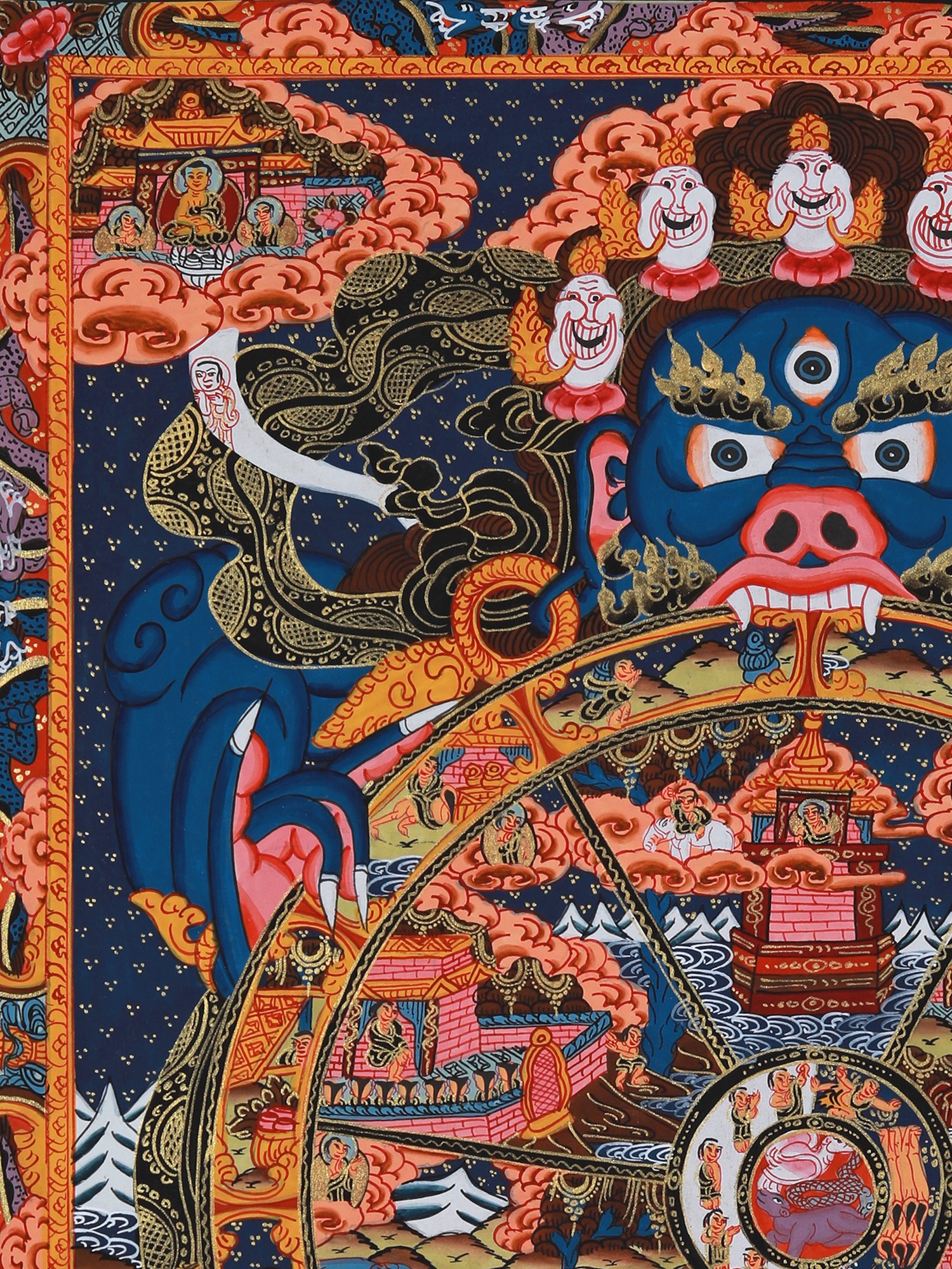 The central image showcases Yama, the Lord of Death, a fearsome yet ultimately compassionate figure in Tibetan Buddhism. Yama is depicted with multiple heads and arms, symbolizing his omniscience and power over the cycle of rebirth. He holds the Wheel of Life, a circular mandala divided into six realms of existence – Gods, Demi-Gods, Humans, Animals, Hungry Ghosts, and Hell beings. Each realm is visually depicted with meticulous detail, providing a vivid portrayal of the karmic consequences of actions and the endless cycle of suffering. The wheel also showcases the twelve links of dependent origination, the twelve causal factors that explain the perpetuation of this cyclical existence. Observing the interconnectedness of these factors and the suffering of beings within each realm provides profound meditation and contemplation for practitioners.