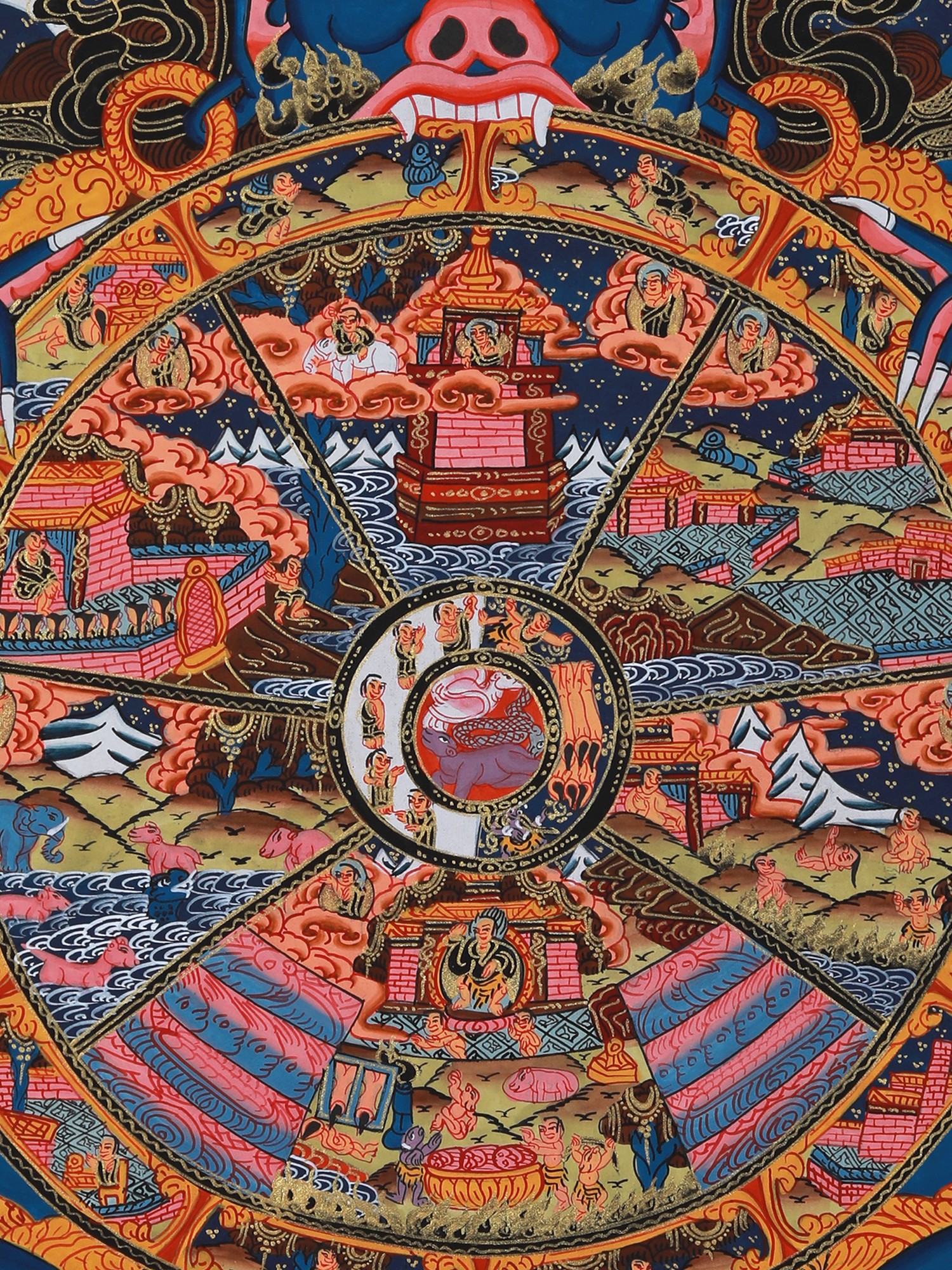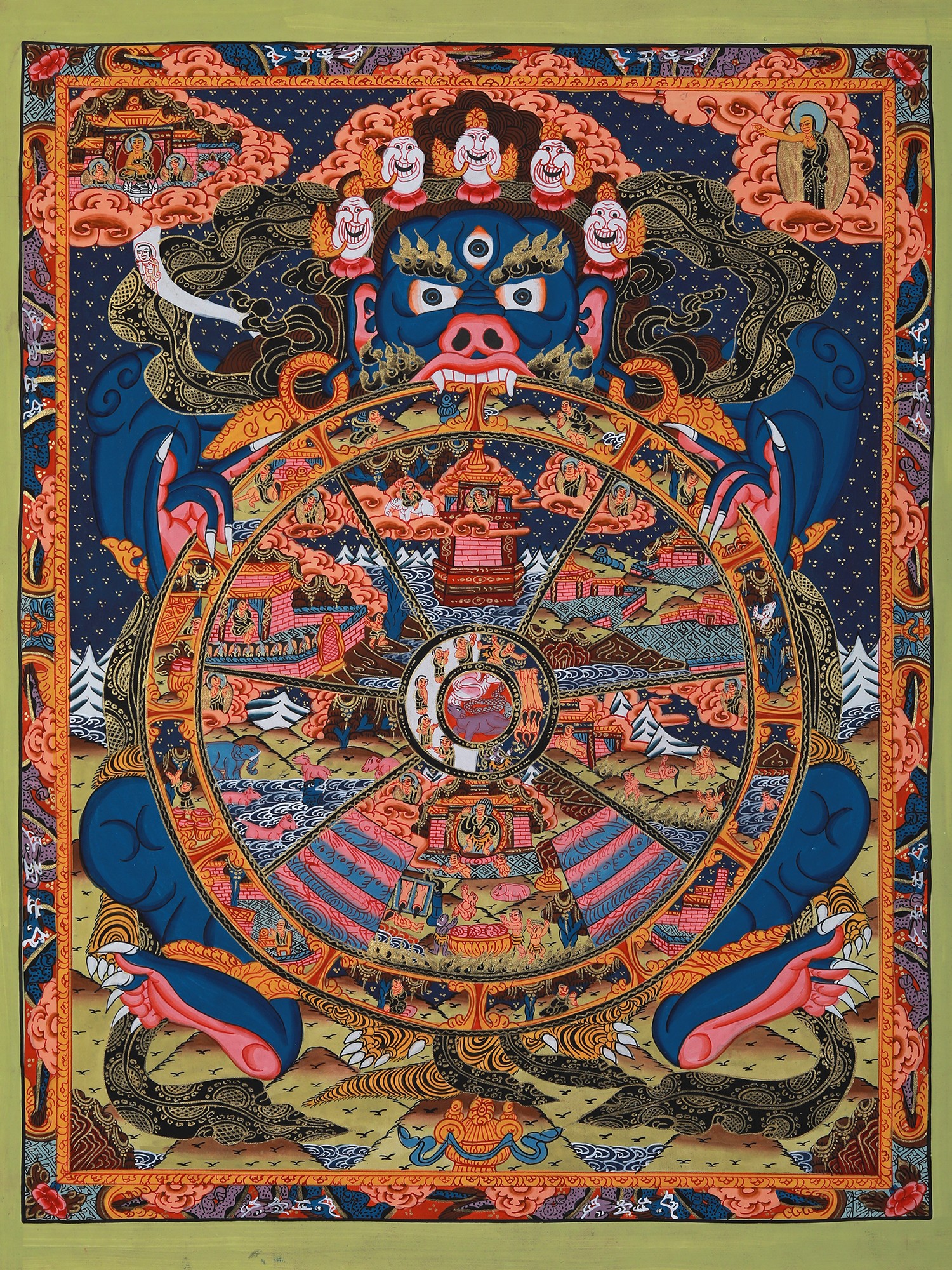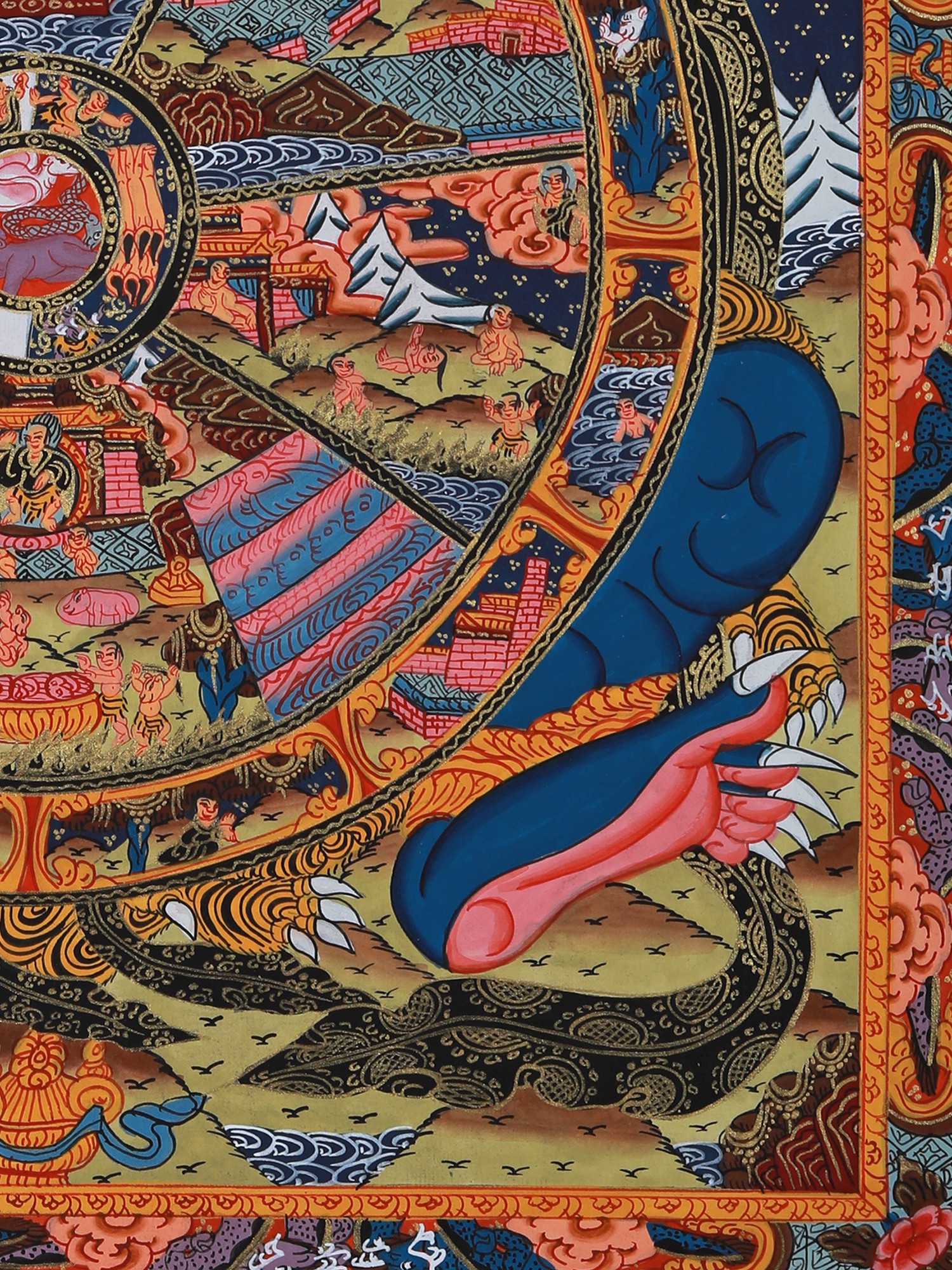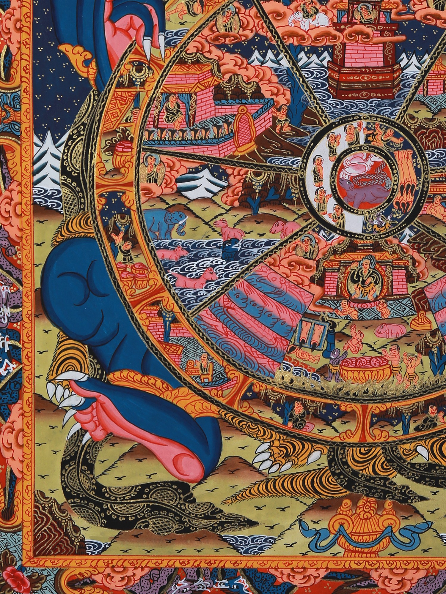 The central image showcases Yama, the Lord of Death, a fearsome yet ultimately compassionate figure in Tibetan Buddhism. Yama is depicted with multiple heads and arms, symbolizing his omniscience and power over the cycle of rebirth. He holds the Wheel of Life, a circular mandala divided into six realms of existence – Gods, Demi-Gods, Humans, Animals, Hungry Ghosts, and Hell beings. Each realm is visually depicted with meticulous detail, providing a vivid portrayal of the karmic consequences of actions and the endless cycle of suffering. The wheel also showcases the twelve links of dependent origination, the twelve causal factors that explain the perpetuation of this cyclical existence. Observing the interconnectedness of these factors and the suffering of beings within each realm provides profound meditation and contemplation for practitioners.