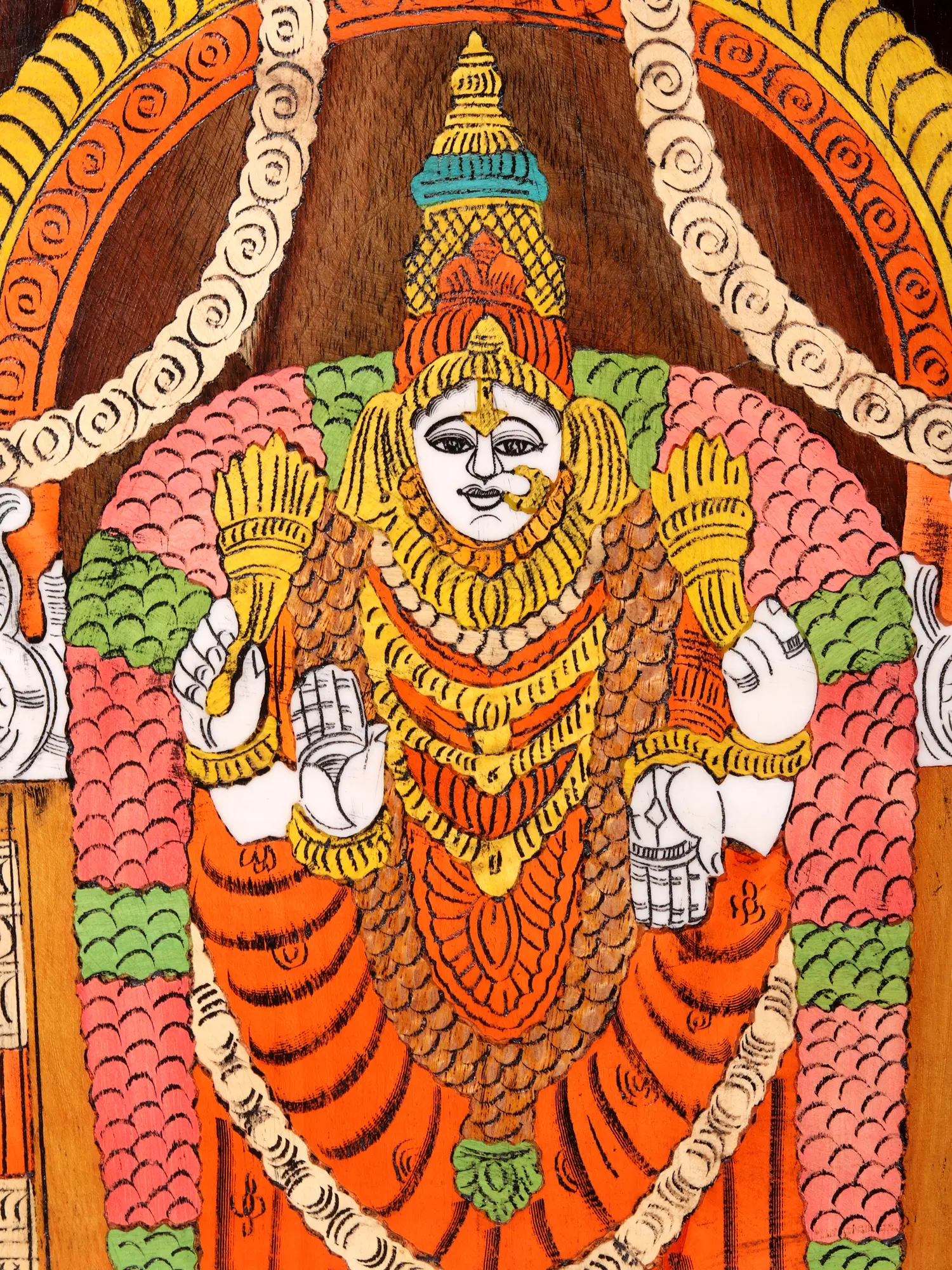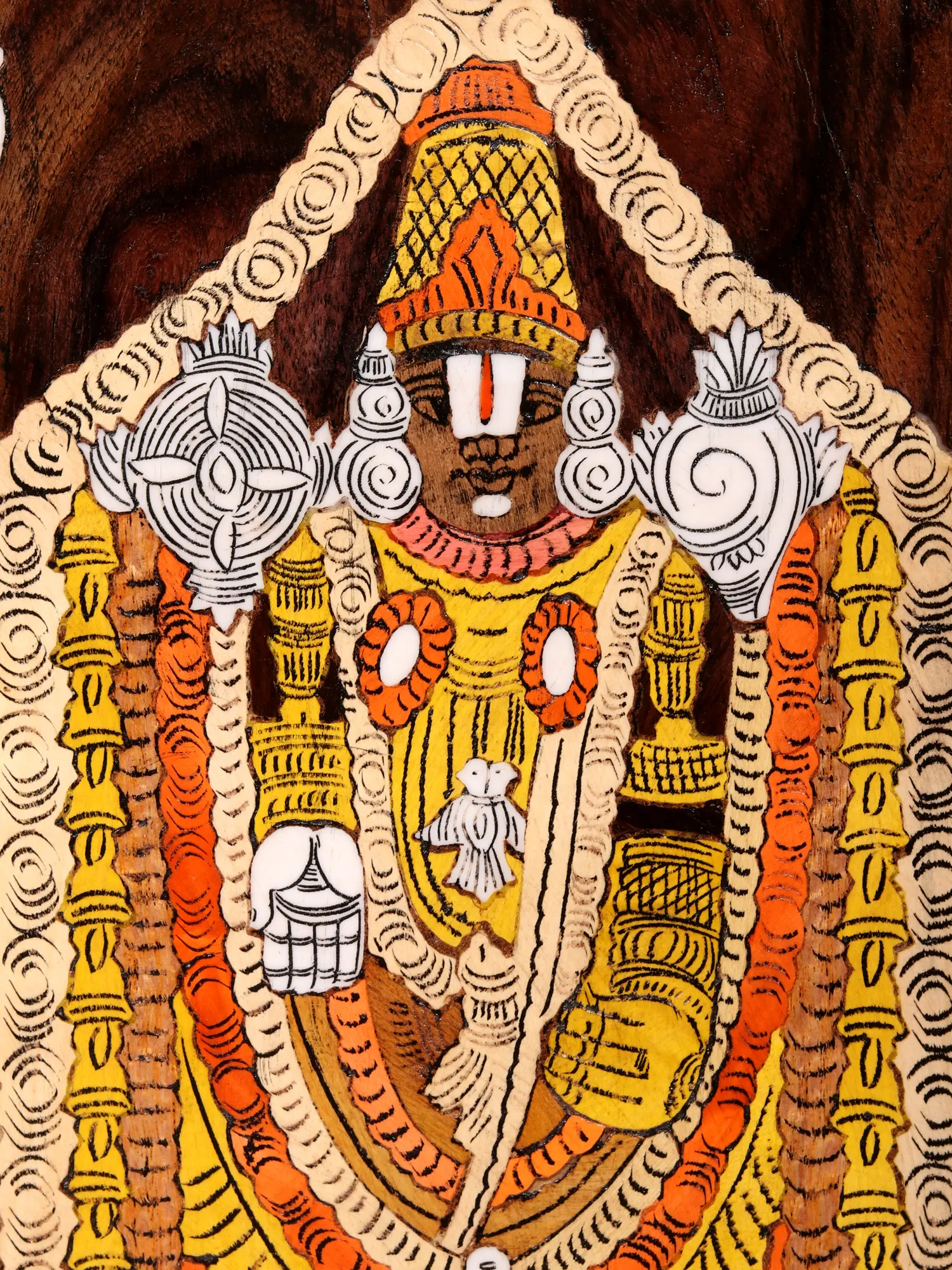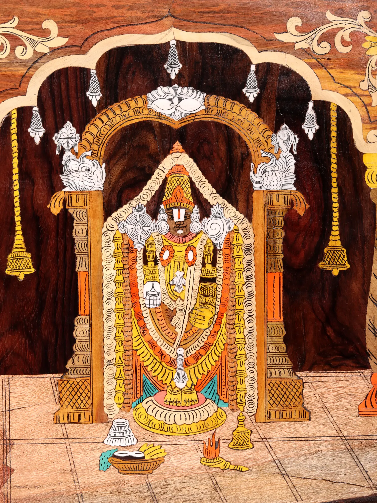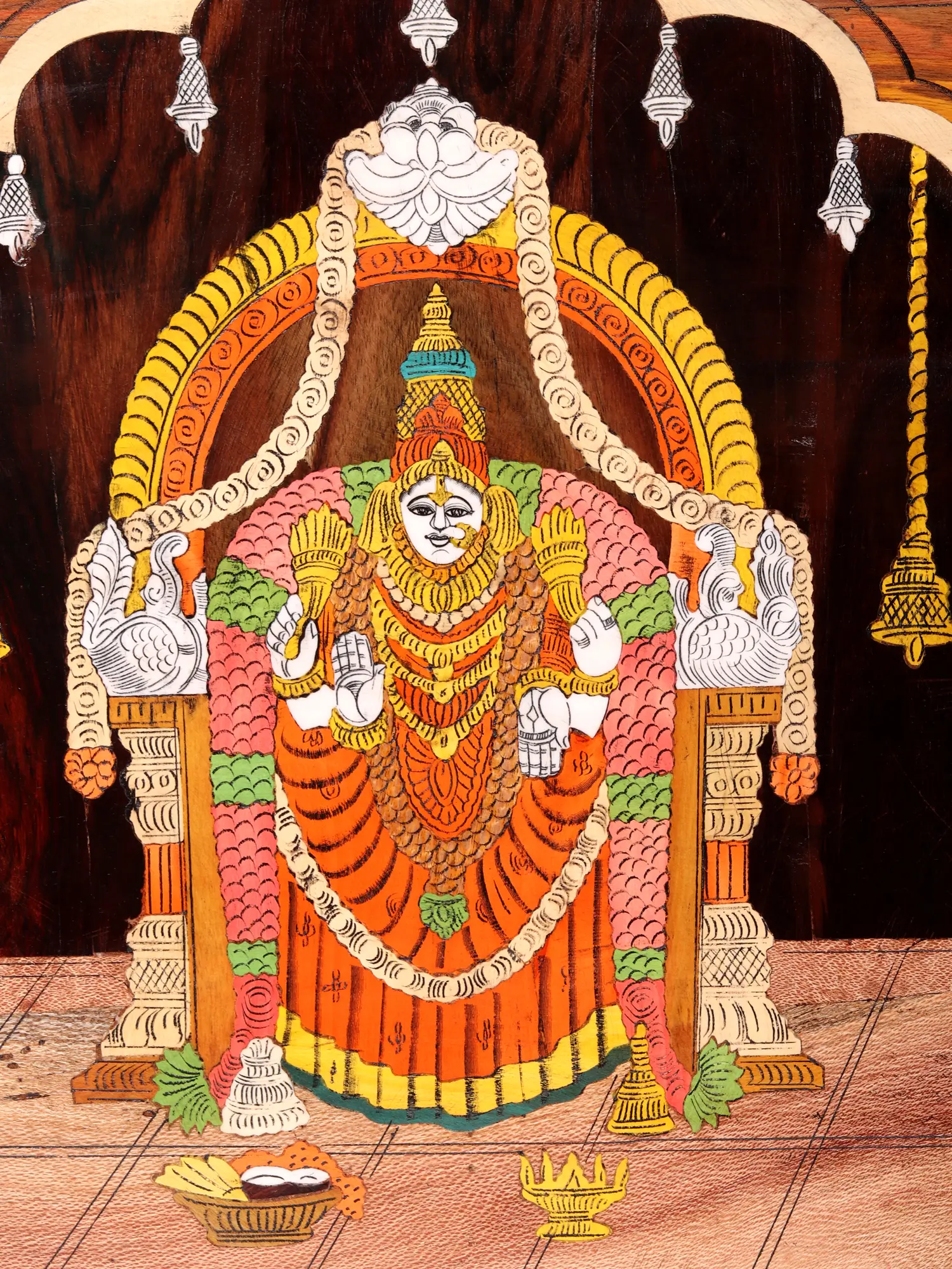 Observe the harmonious balance within this artwork, where Lord Venkateshwara and Goddess Padmavathi are depicted with radiant grace. The rich, natural wood provides a warm and textured canvas, expertly complemented by the vibrant natural colors. The inlay work adds a subtle yet significant dimension, drawing your eye to the intricate adornments and the divine aura surrounding the deities. The composition is designed to evoke a sense of peace and divine blessings, creating a visually stunning and spiritually uplifting experience.