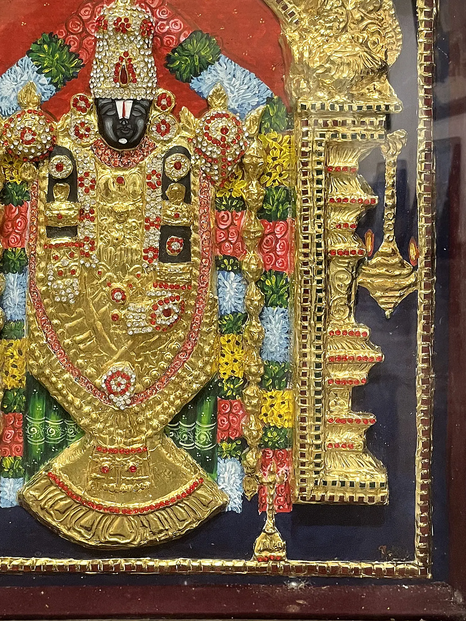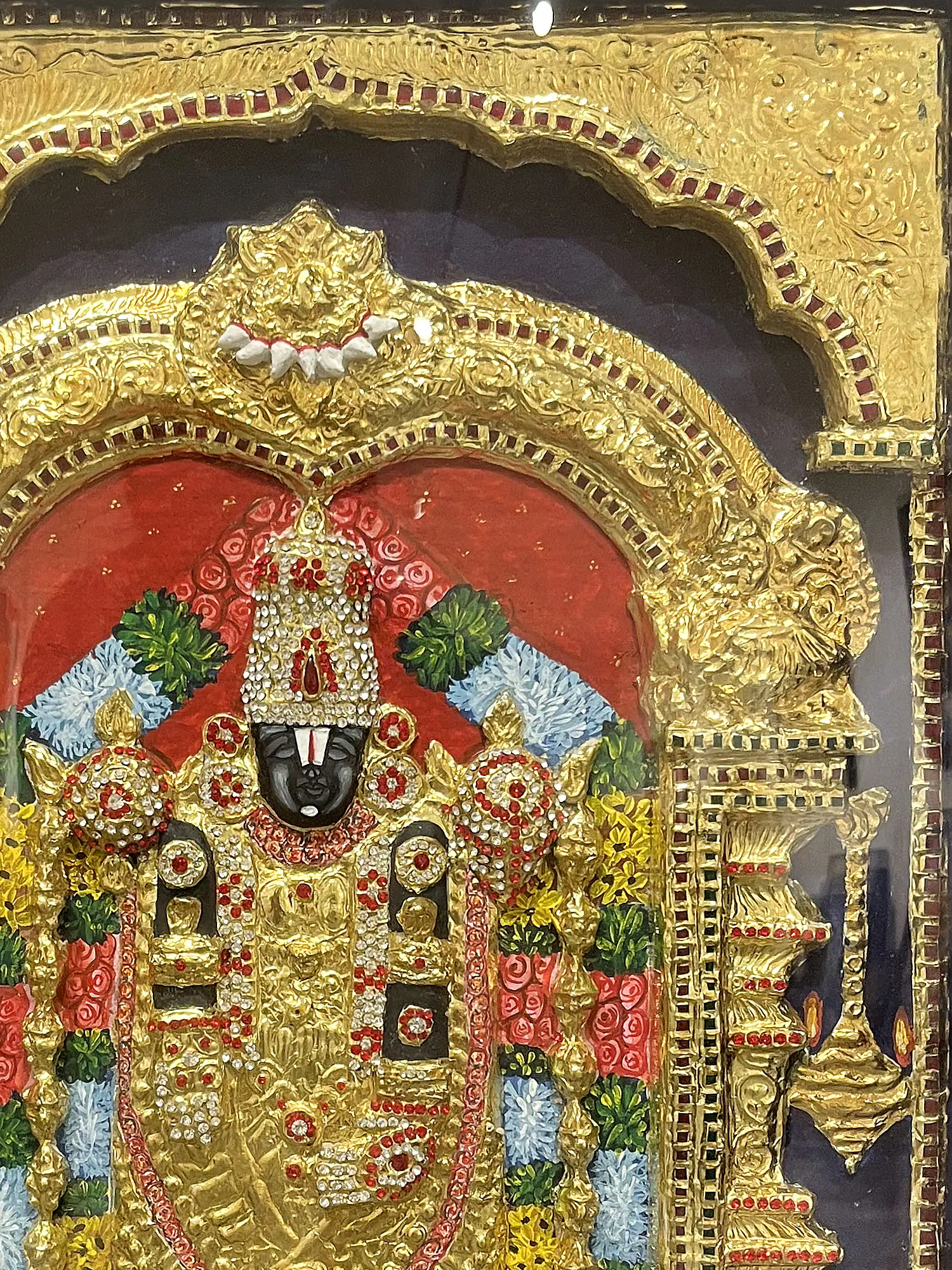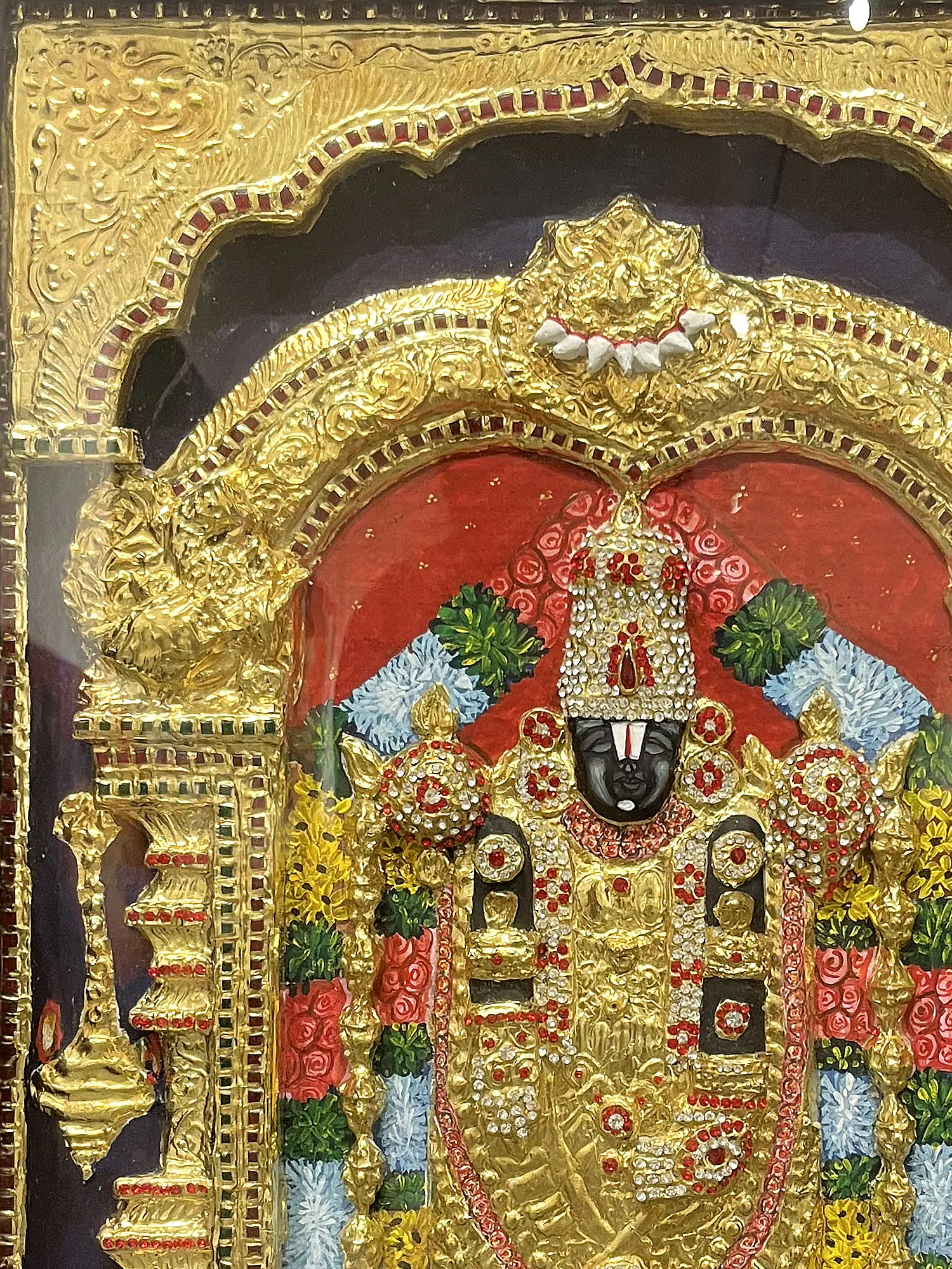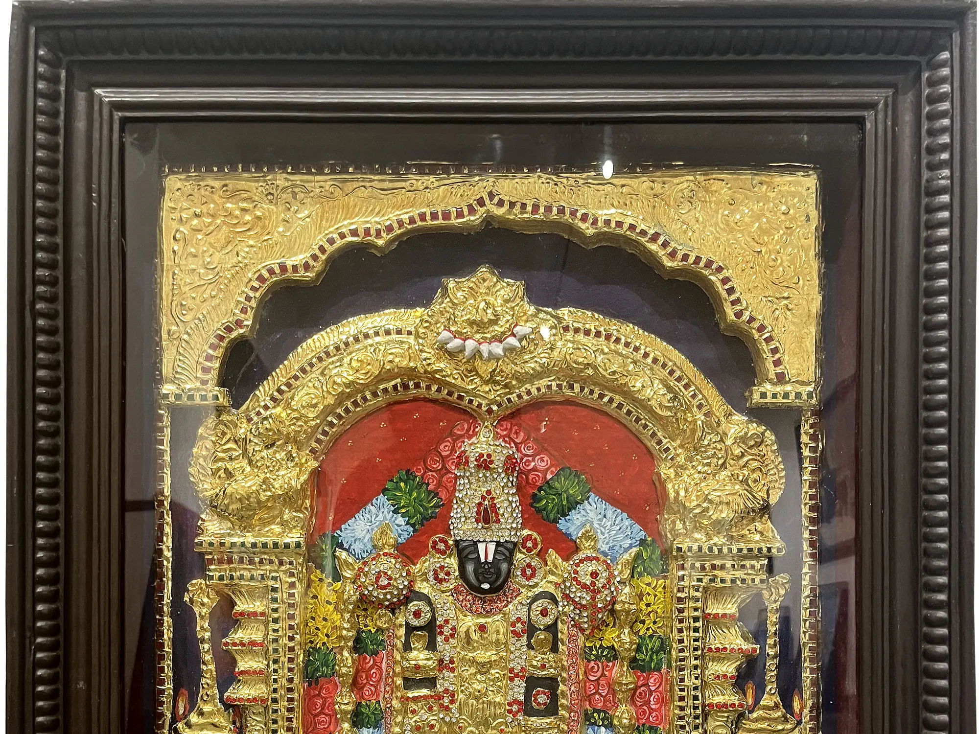 Under the embrace of an intricately carved wooden frame, a canvas of ancient mysticism and timeless reverence unfolds. Behold the divine presence of Tirupati Balaji, the Lord of the Seven Hills, standing as a beacon of grace and divinity. This Tanjore artwork beckons you to delve deeper into the realms of devotion, spirituality, and the eternal bond between the earthly and the celestial. Tirupati Balaji's majestic presence serves as a reminder of the divine grace that guides our path.