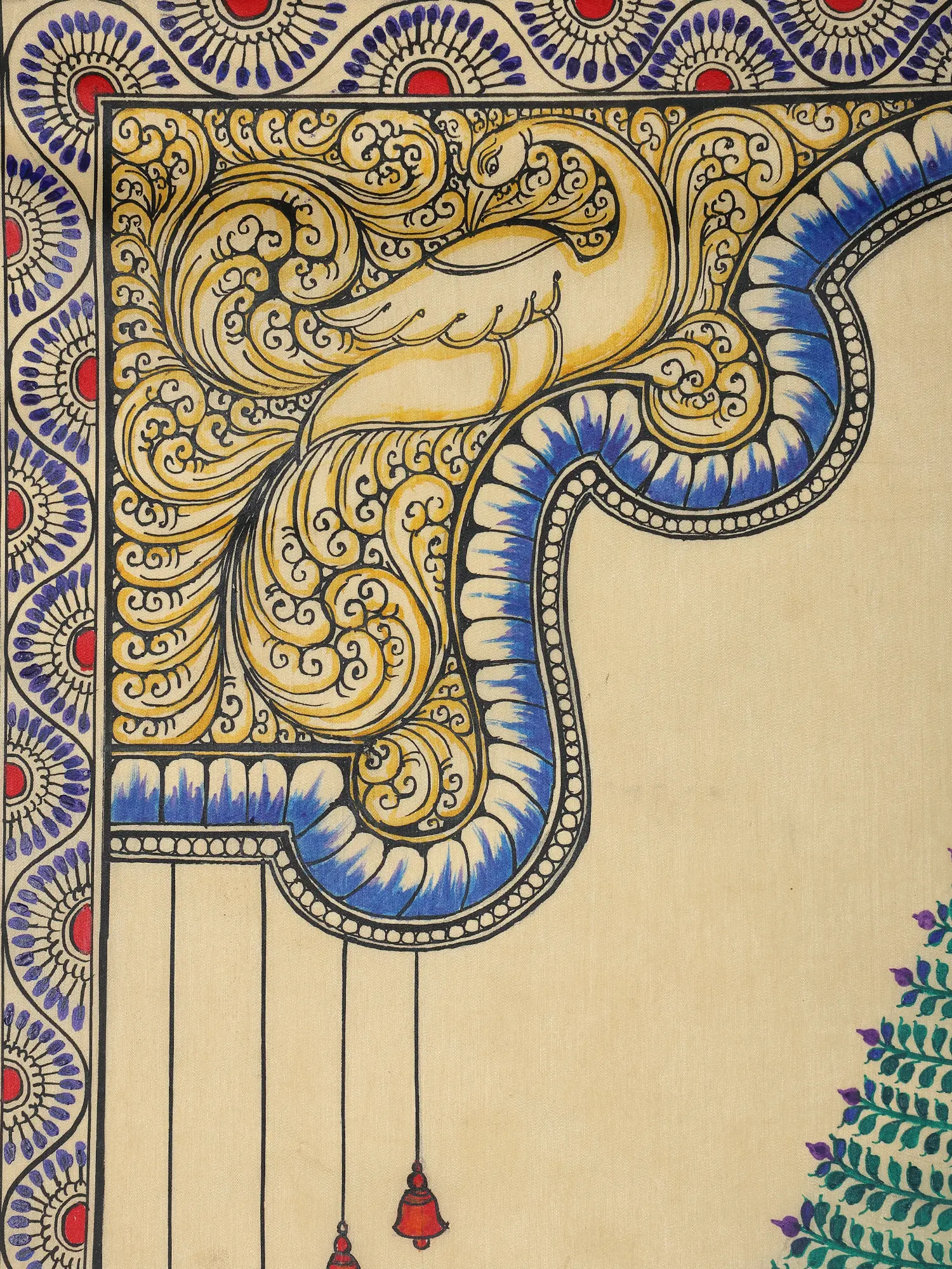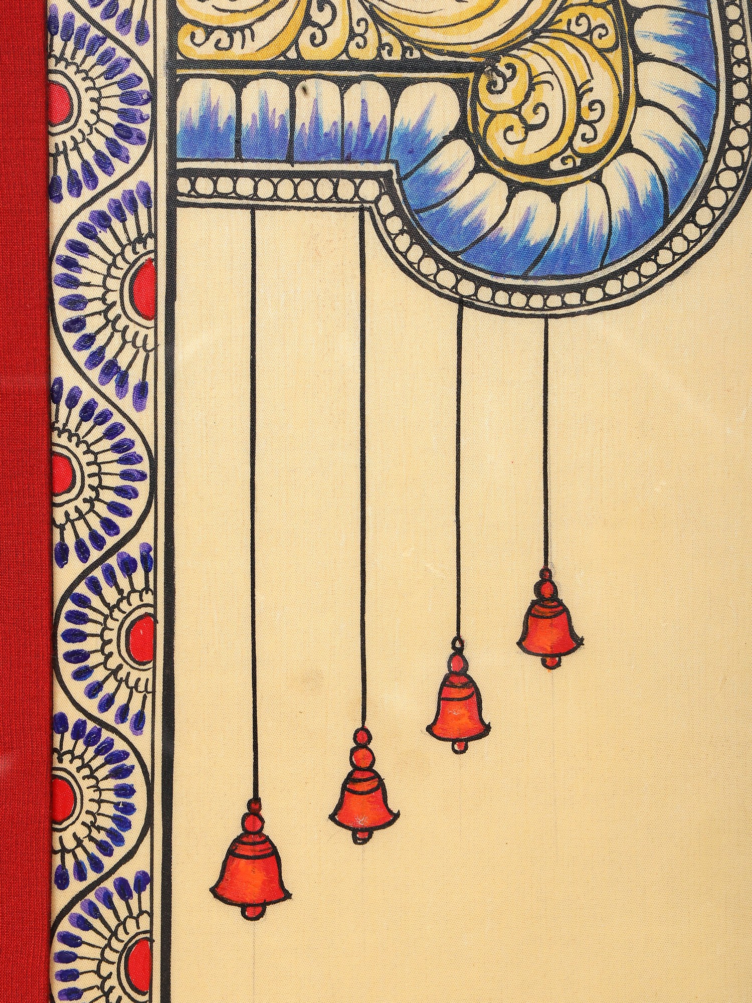 The central motif is beautifully framed by intricate borders that showcase the characteristic design elements of Pattachitra art. Notice the rows of meticulously crafted semi-circular designs, filled with alternating colors, add rhythm and pattern to the painting. The top of the painting features an ornate arch design adorned with detailed scrollwork, with an ethereal swan, or possibly a Hamsa, nestled within the patterns. Suspended below the arch are small, bell-like decorations, adding a whimsical touch and further enhancing the visual appeal.