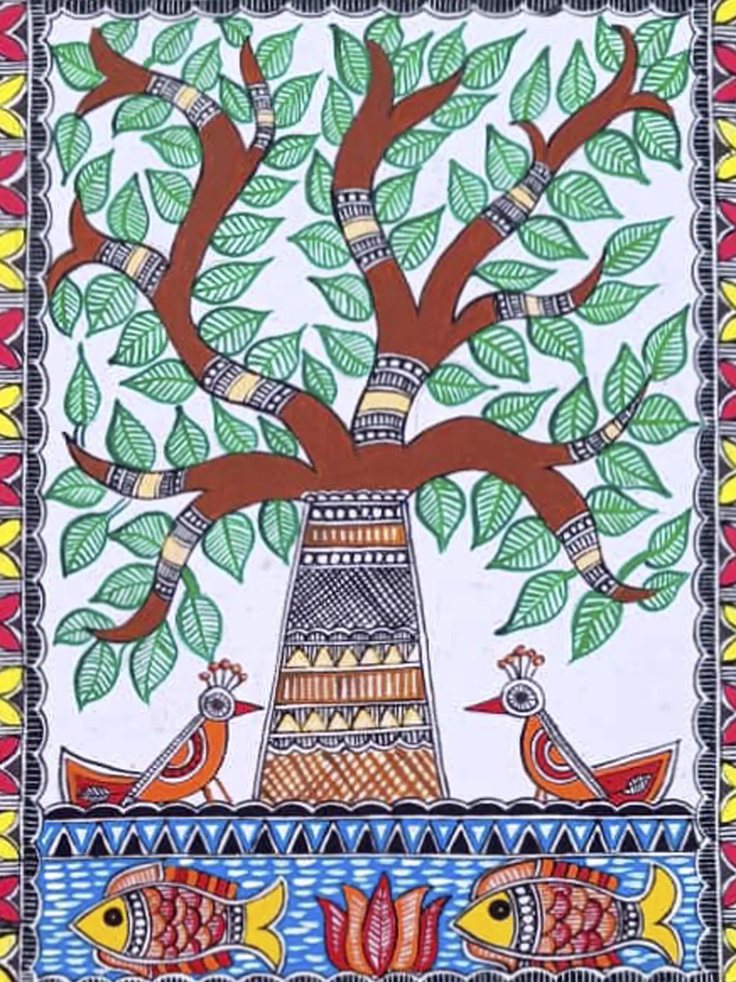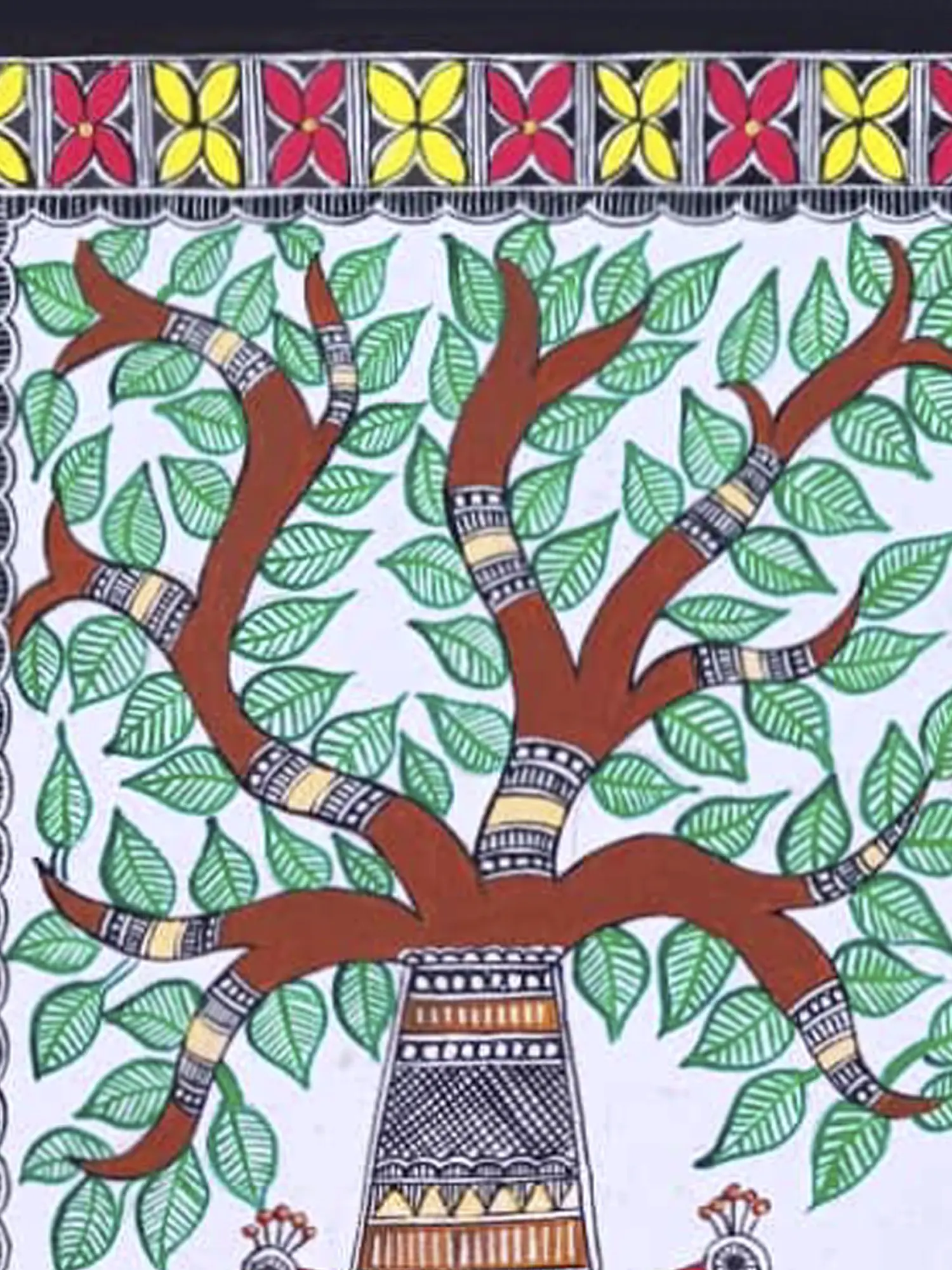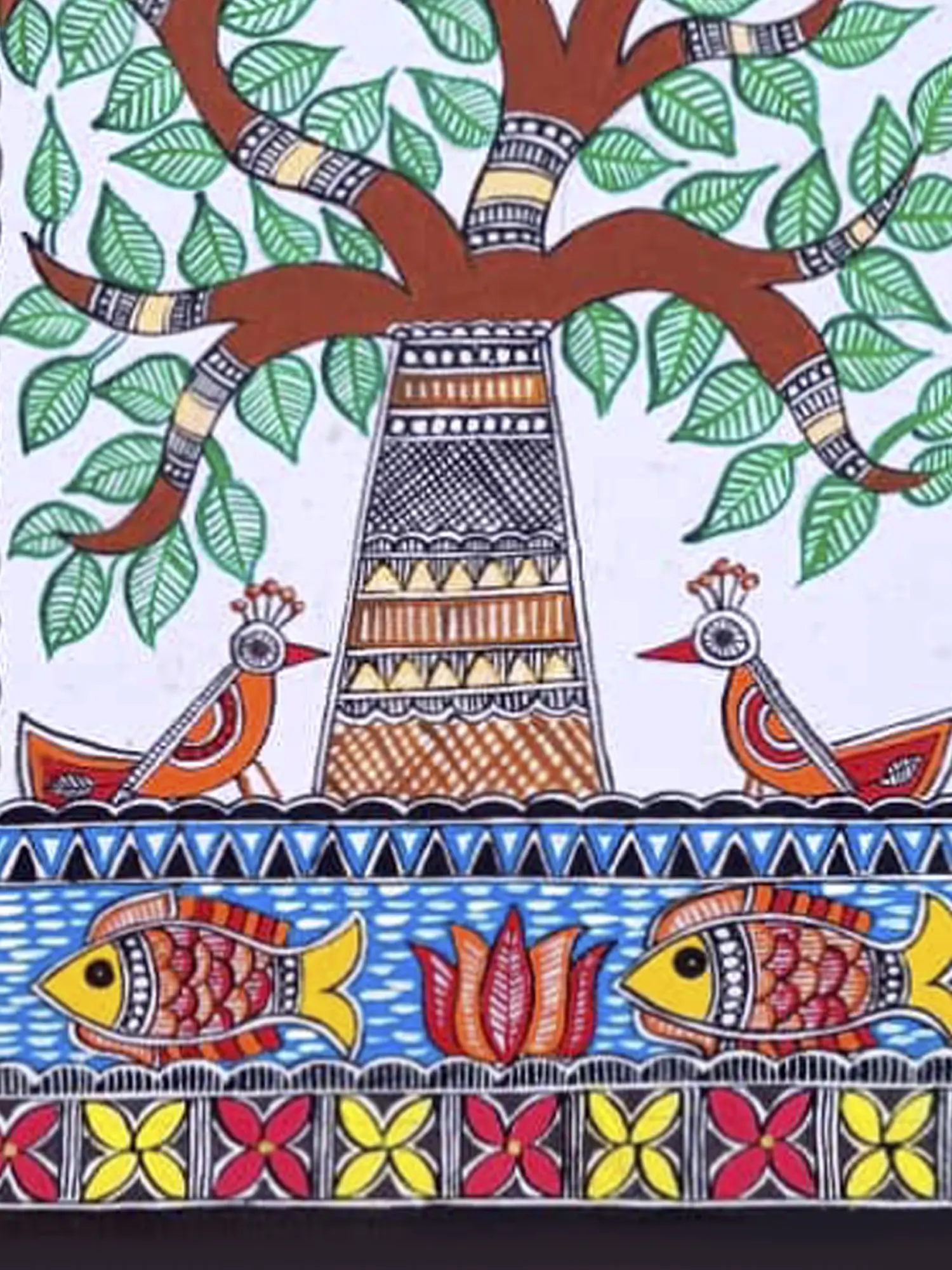 The piece not only showcases the artist's mastery of the Madhubani style but also invites viewers to immerse themselves in the cultural significance and timeless beauty encapsulated within the branches and roots of this symbolic tree.