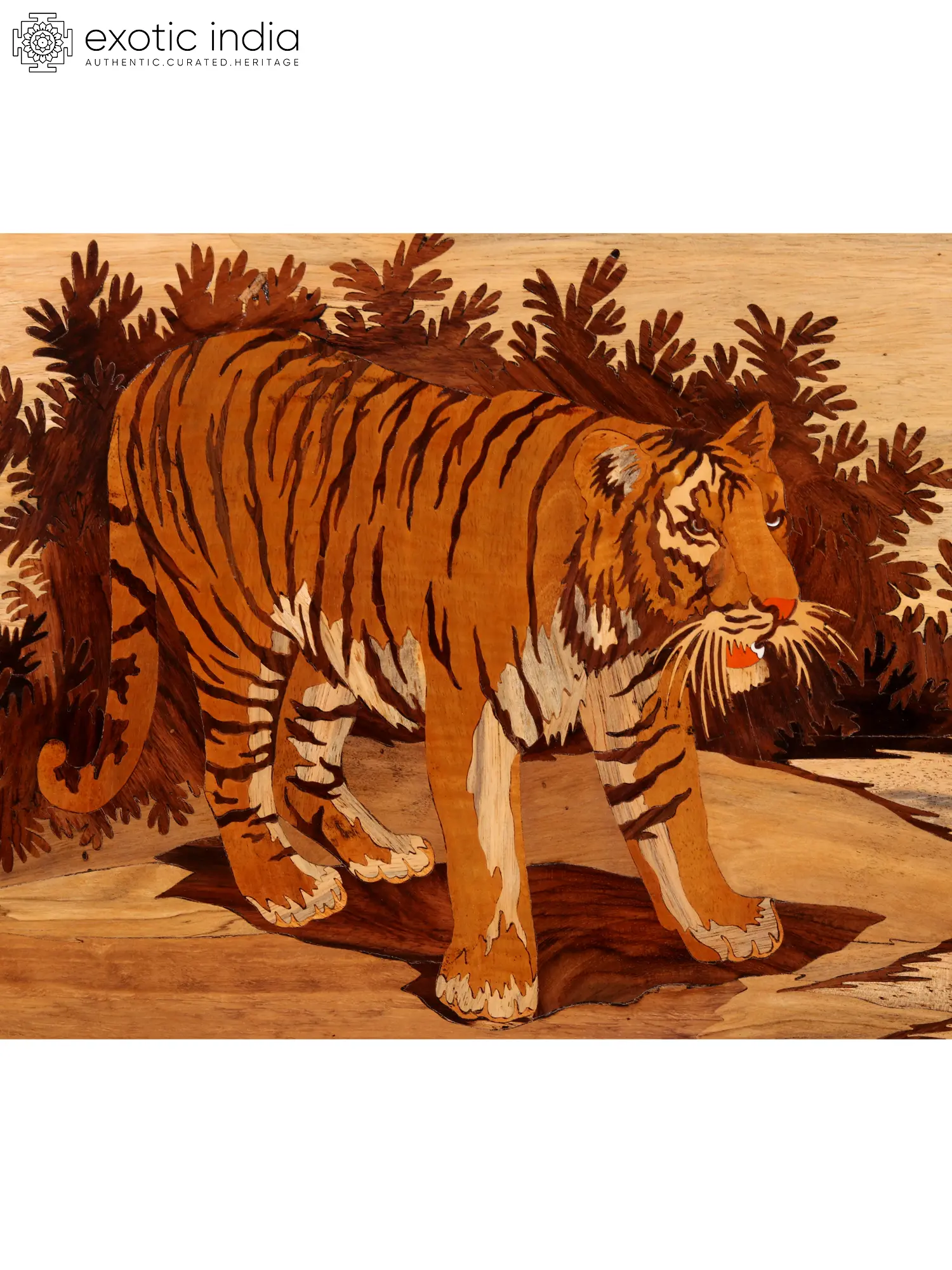 This breathtaking artwork showcases the artistry of Mysore's renowned wood inlay tradition. Depicting two majestic tigers amidst a lush forest landscape, this piece transcends mere decoration; it's a window into the rich tapestry of Indian culture and mythology. The intricate detail, achieved through the meticulous application of various wood veneers, creates a striking visual representation of these powerful creatures in their natural habitat. The rich, warm tones of the wood create a sense of tranquility and depth, inviting you to lose yourself in the scene. Observe the subtle variations in the wood grain, adding texture and character to the tigers' stripes and the surrounding foliage. This is more than just a painting; it's a narrative rendered in wood.