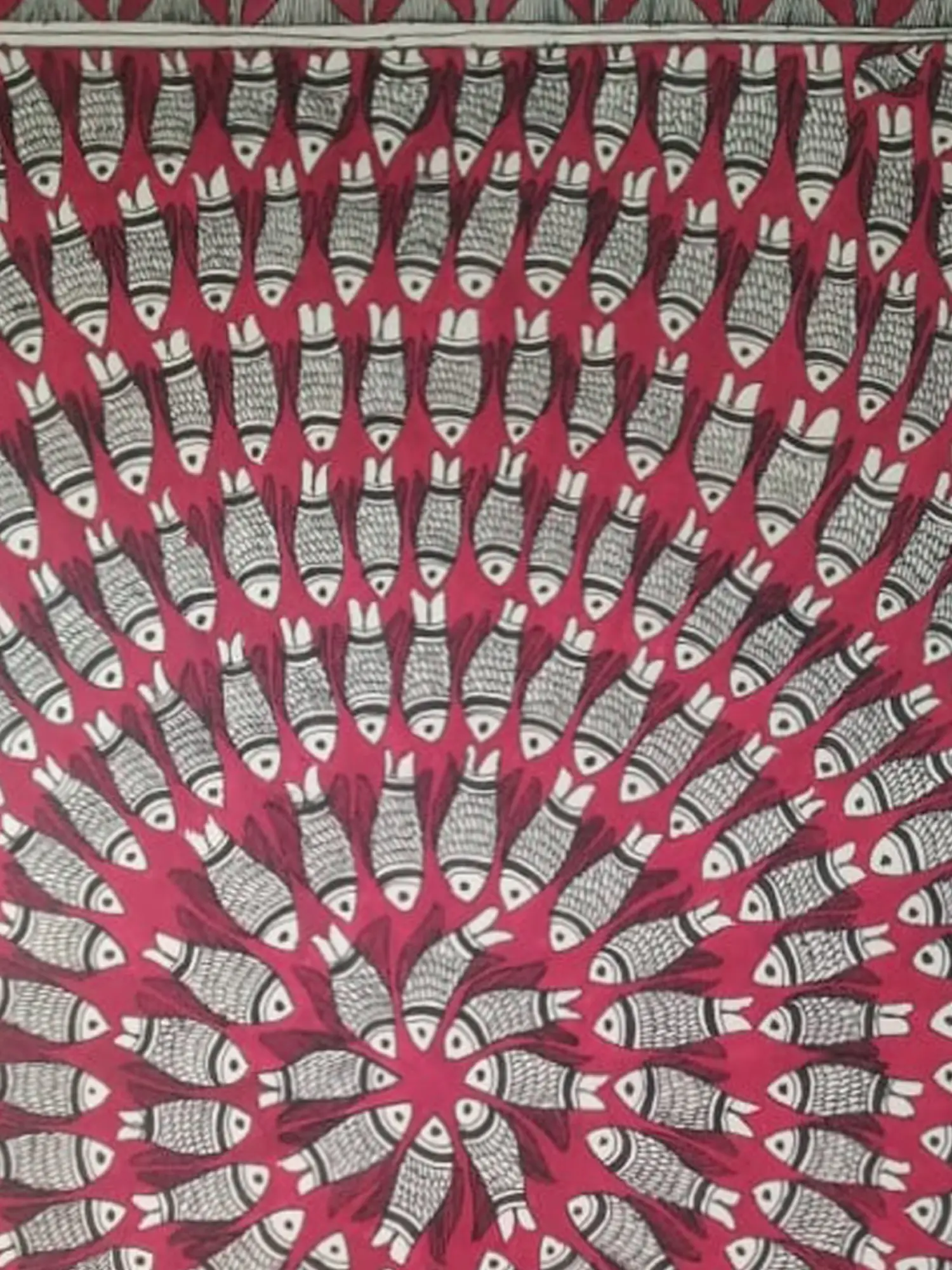 The striking composition features a dense arrangement of stylized fish, their forms rendered with intricate detail. The rich, natural colors create a vibrant yet harmonious backdrop, allowing the delicate linework to truly shine. Measuring 28 inches in height and 21 inches in width, this artwork possesses a substantial presence that commands attention without overwhelming its surroundings.