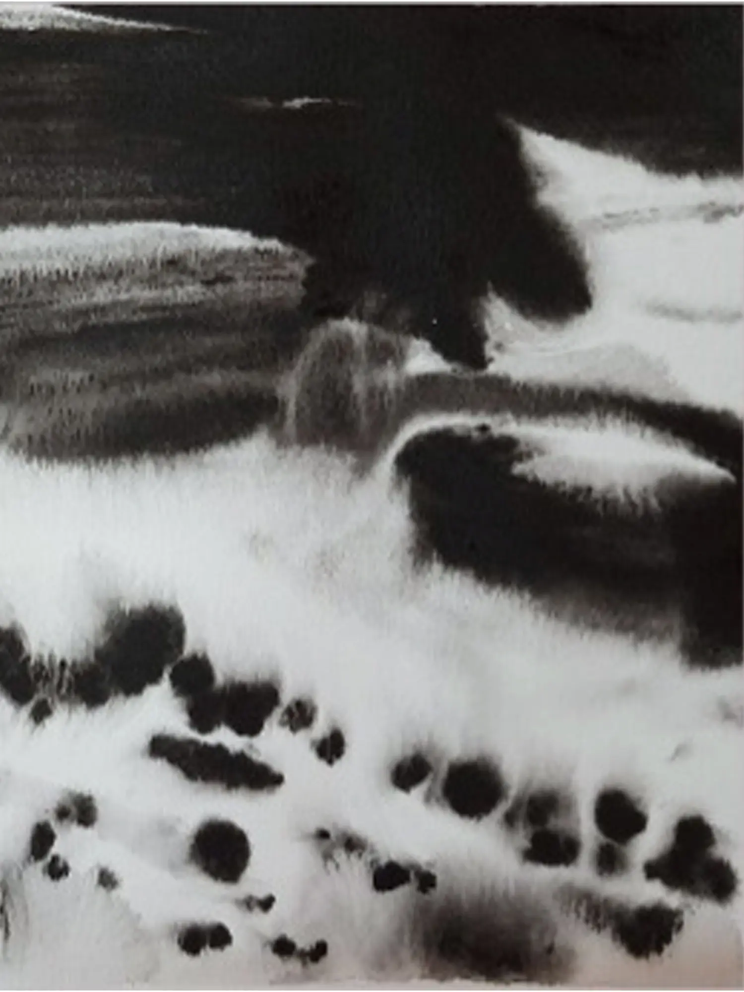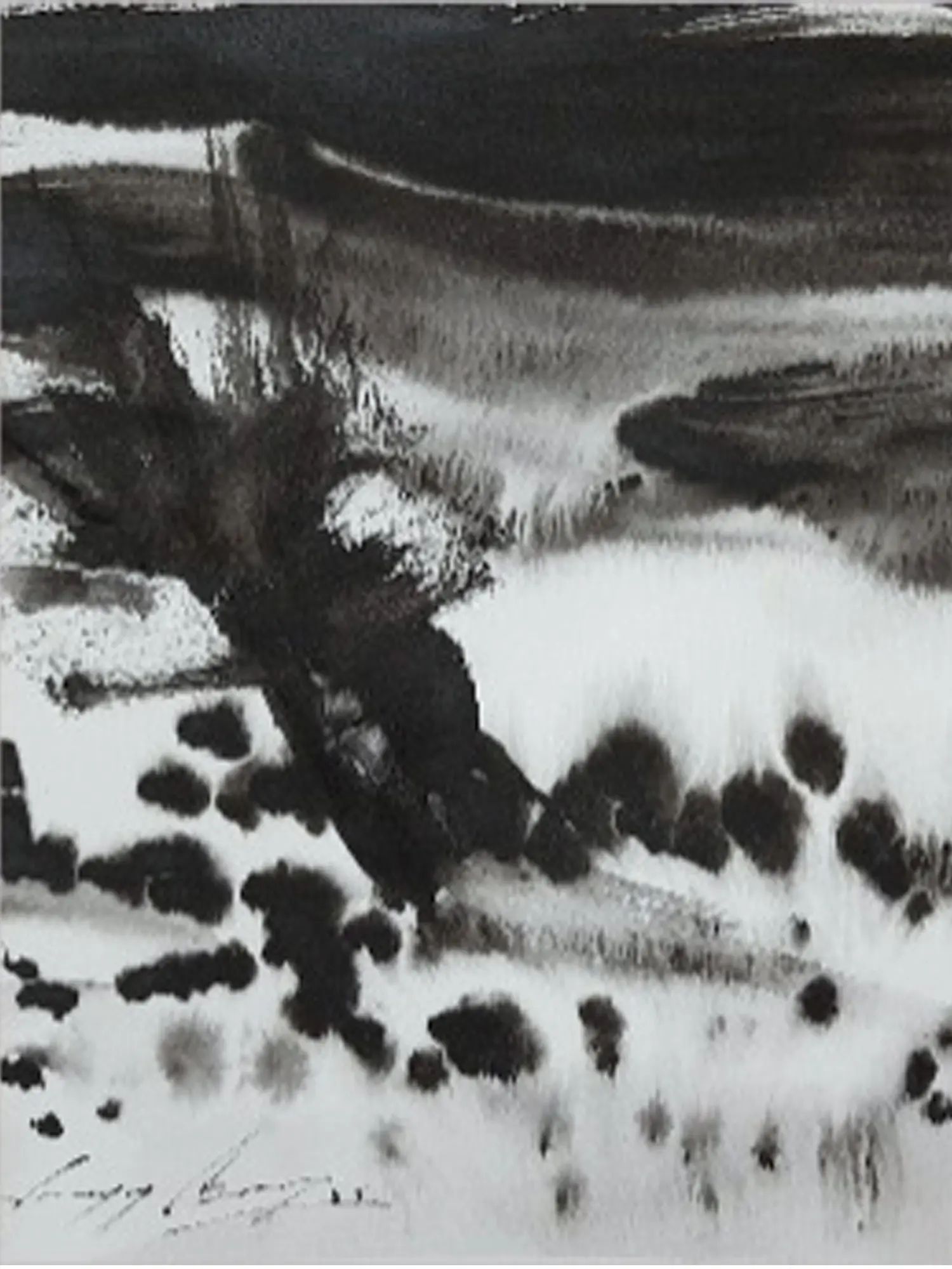 The Japanese technique of painting with ink on paper has been adopted by many painters and experimented with other techniques of watercolor painting. This painting titled "Valley in Monochrome" by Sanjoy Banerjee, is a watercolor masterpiece, that unveils a vision of a snow-clad valley. Some vegetation is shown in dark shade and the watercolor is allowed to move loose on wet paper creating a foggy look. A very unclear sight at first the painting open ups with time and captures the attention of the beholder. These types of paintings with dilute landscapes allow the beholder to unleash their creativity and find structure within the lines. The painting's monochromatic hues and graceful brushwork mirror the timeless beauty of simplicity. It symbolizes the harmony of contrasts, where shadows and light coexist in perfect balance.