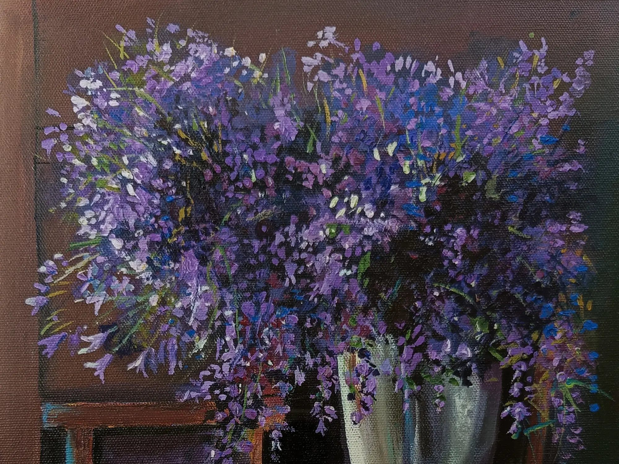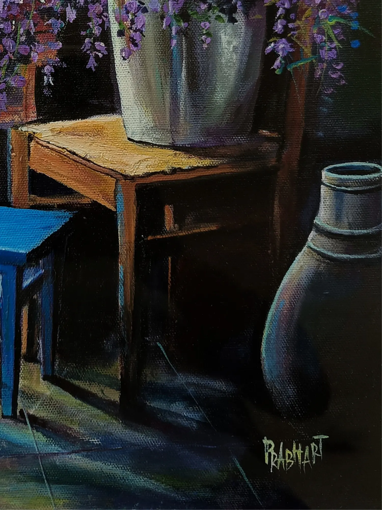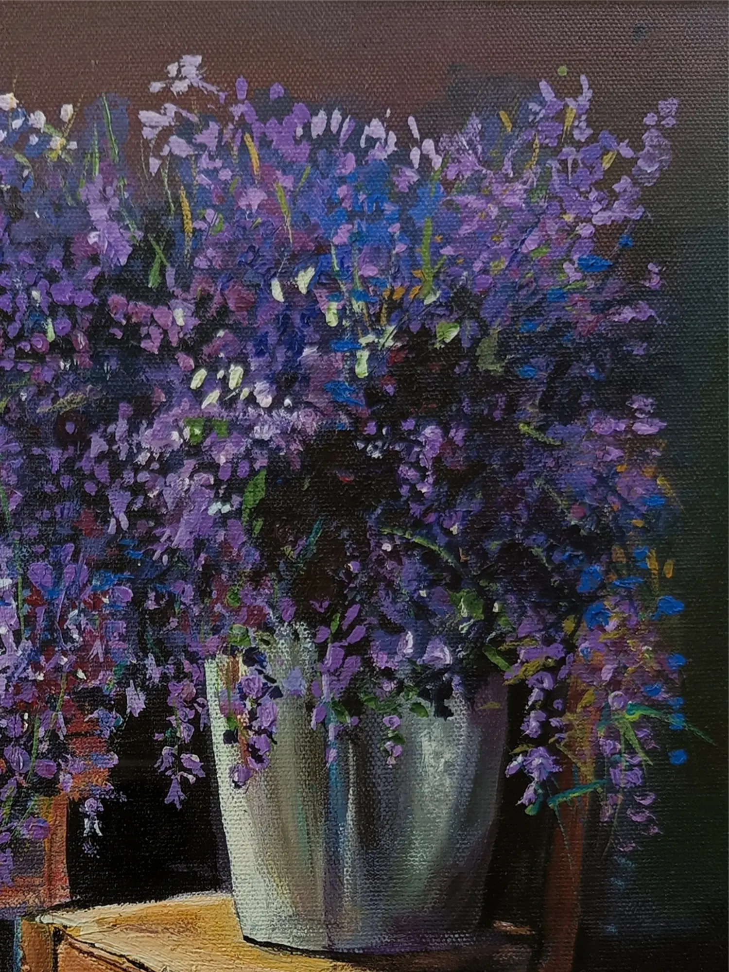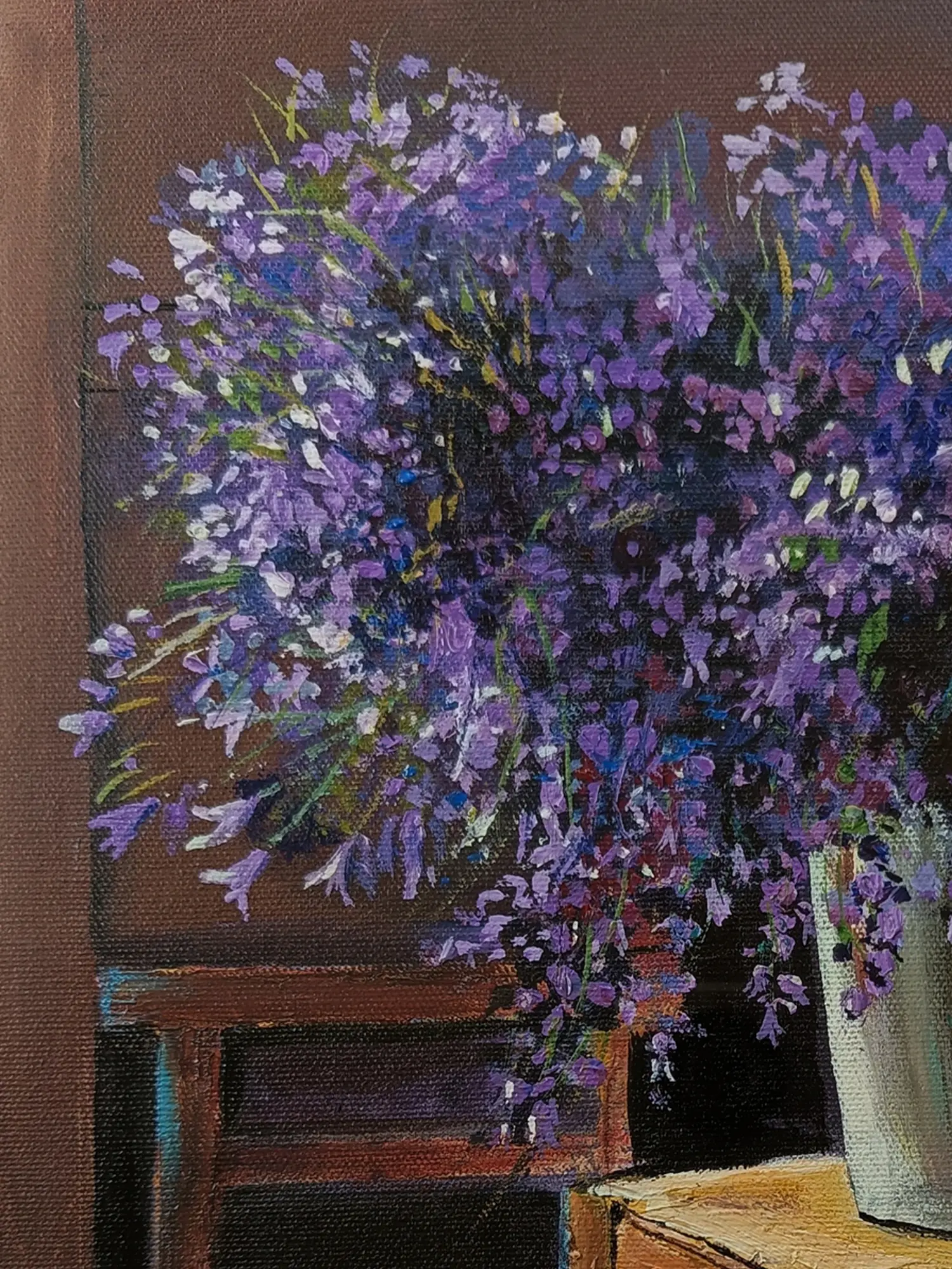 The still life painting of a vase with lavenders exudes timeless elegance and natural beauty. With picked colours, the artwork captures the delicate blooms and graceful curves of the vase. Through soft shadows, the lavender blooms radiate with ethereal charm and fragrant allure. Each brushstroke conveys the grace of floral arrangement, asking viewers to savour the fleeting beauty of nature's bounty captured in a moment of serene repose.