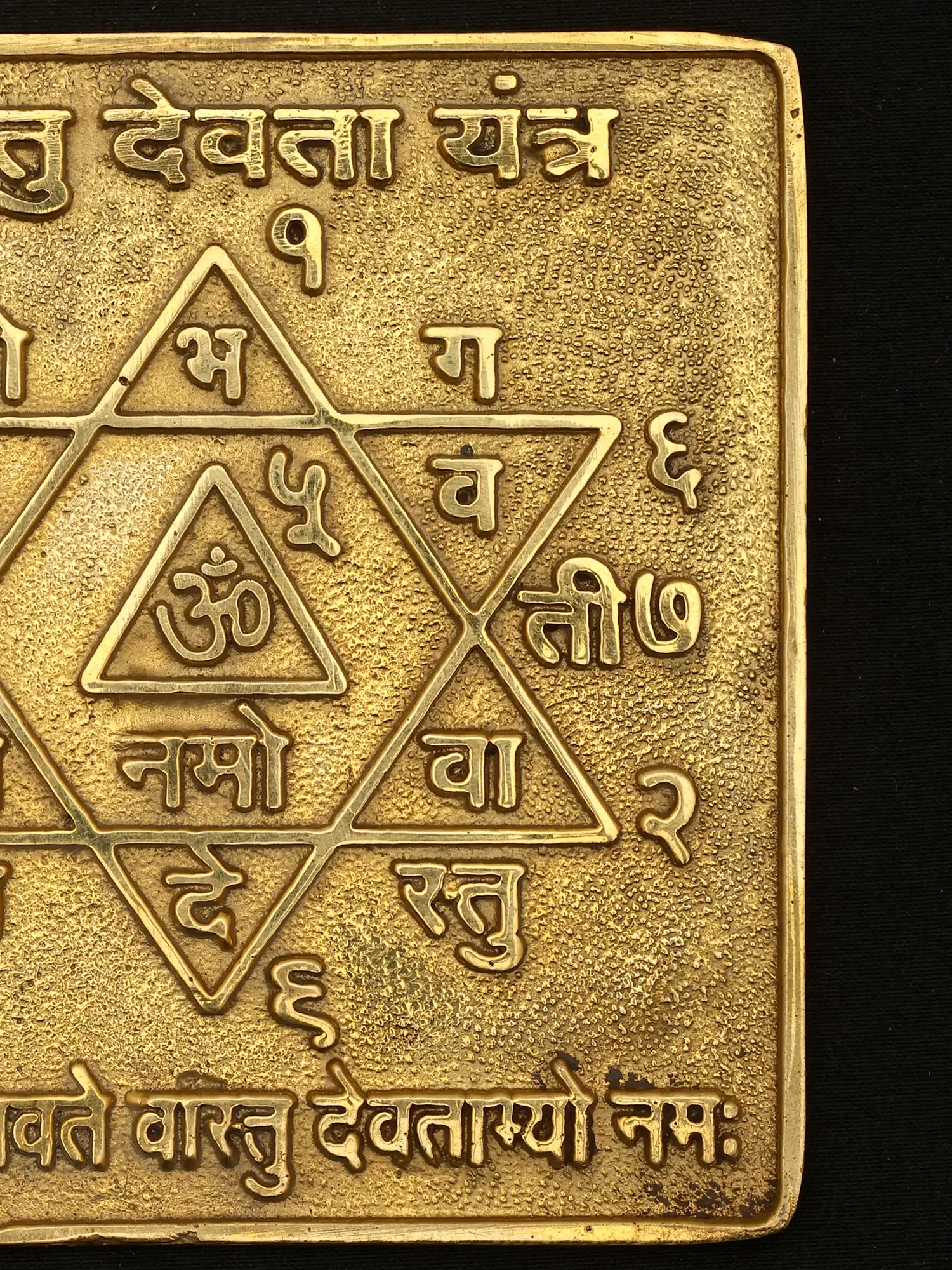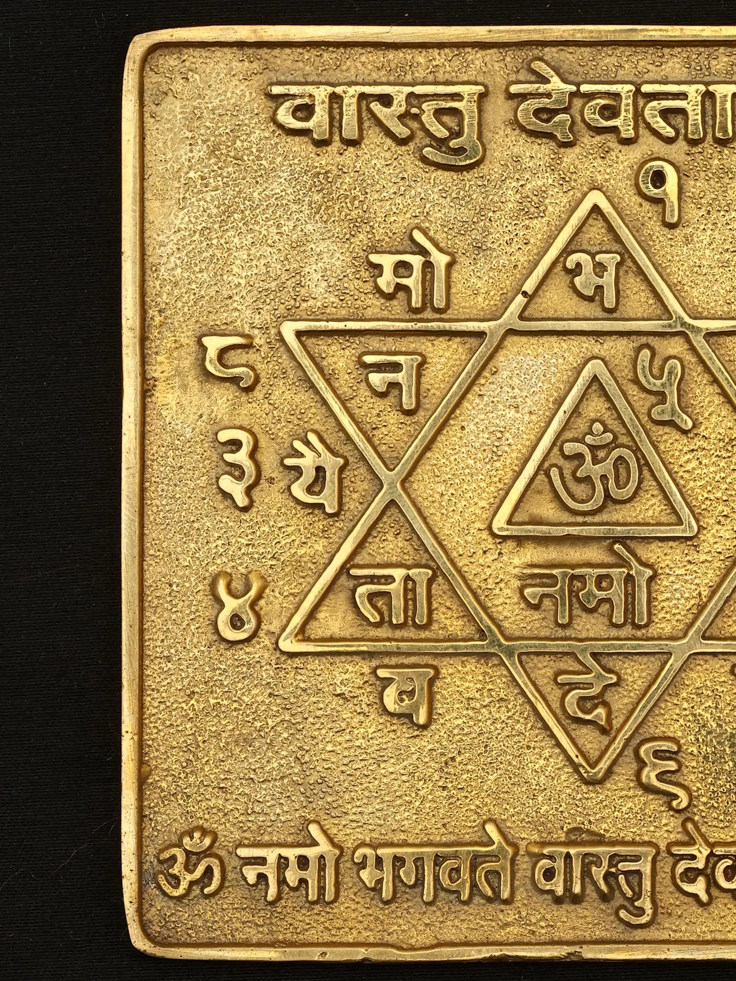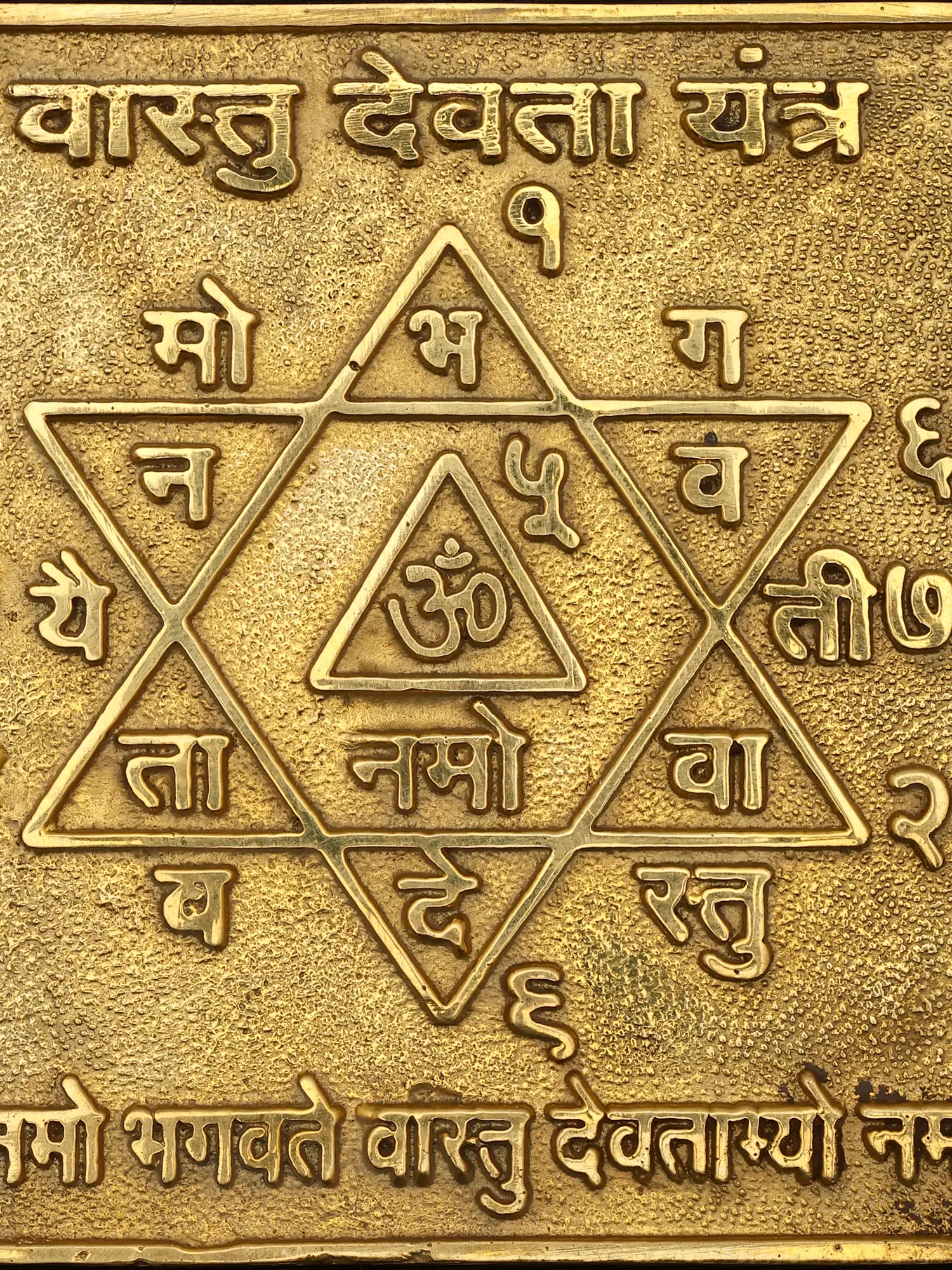 The intricate design features a central 'Om' symbol, the primordial sound, encased within a star of David-like formation. Surrounding this sacred geometry are Sanskrit syllables and numerals, each imbued with specific energetic properties and meaning. Its compact dimensions, approximately 3.5 inches by 3.5 inches, make it versatile for placement, while its substantial 0.2-inch thickness lends it a pleasing weight and presence.