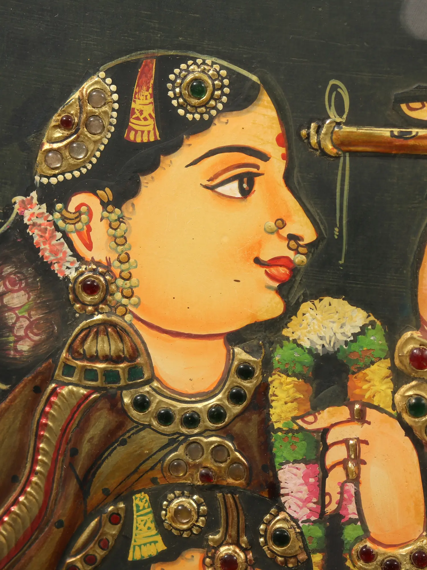 Symbolism in this Tanjore artwork is profound and beautiful. The cow and calf in the background, with the cow licking Krishna’s foot as a sign of her affection and the calf drinking her milk create an image of affection and devotion. The pitch-black backdrop is a a symbol of Krishna’s omnipresence as well, who has been often compared to the dark bumblebee, in terms of his ethereal beauty and lovely black form.