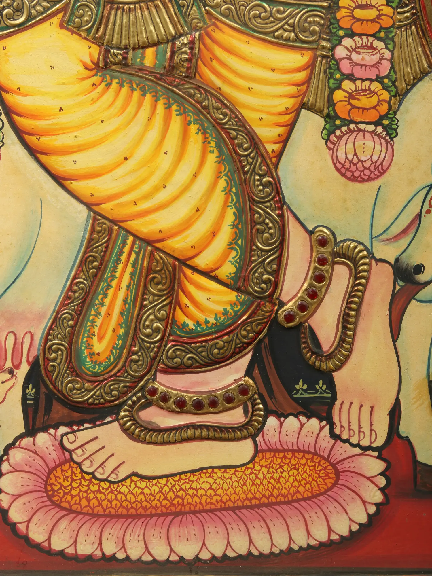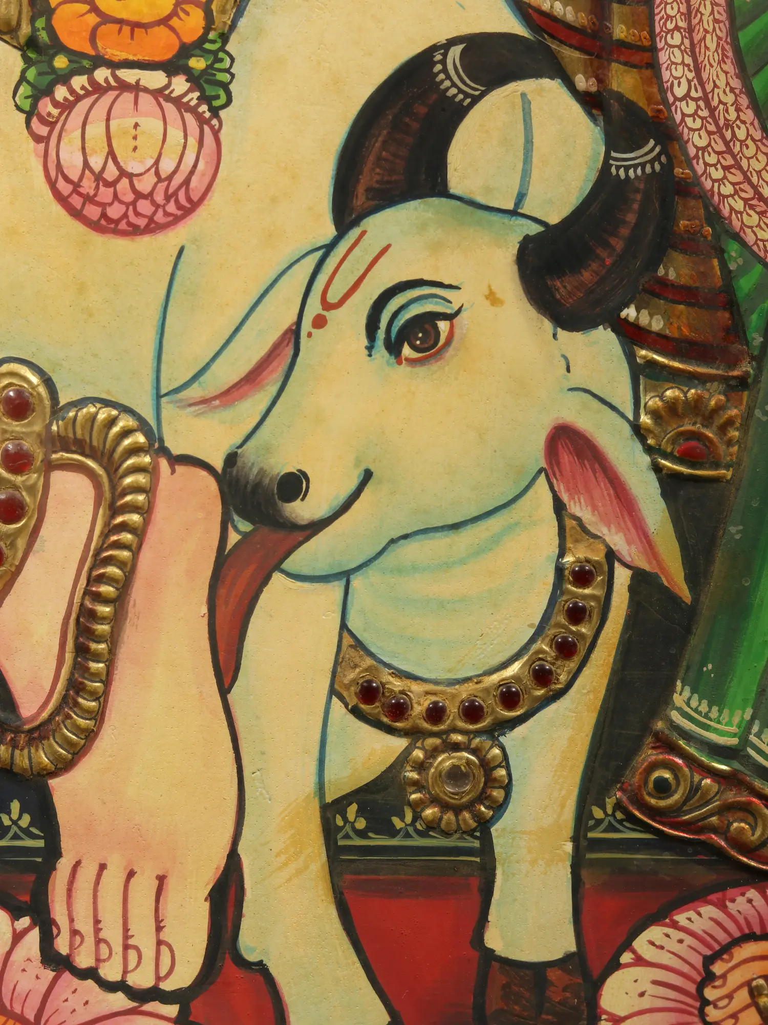 Venugopala or Venu-Maadhav is a heavenly aspect of Sri Krishna, blowing sweet melodies in his Venu or flute and becoming a source of nourishment for the residents of Vrindavan. Standing under the shade of a tree populated by animals and birds who flock to listen to the music of Venu, Krishna in this Tanjore painting is in his adolescence, innocent and charming to behold. He is beautifully attired from head to toe and has a colorful floral garland framing his graceful Tribhanga or triple bent pose.