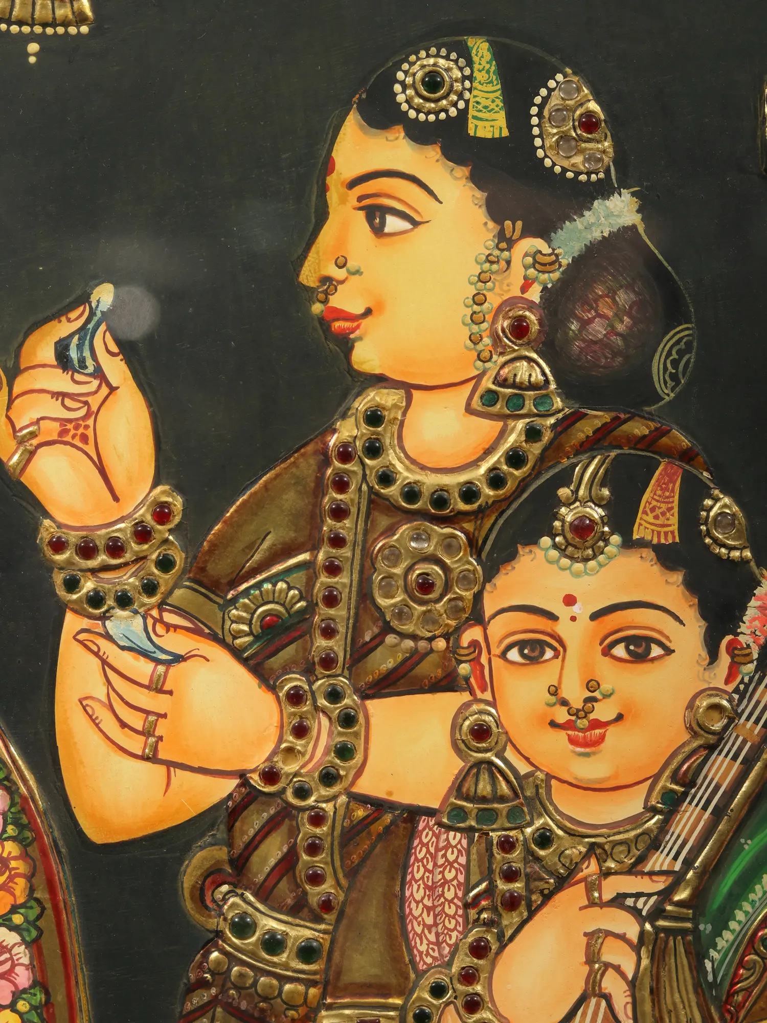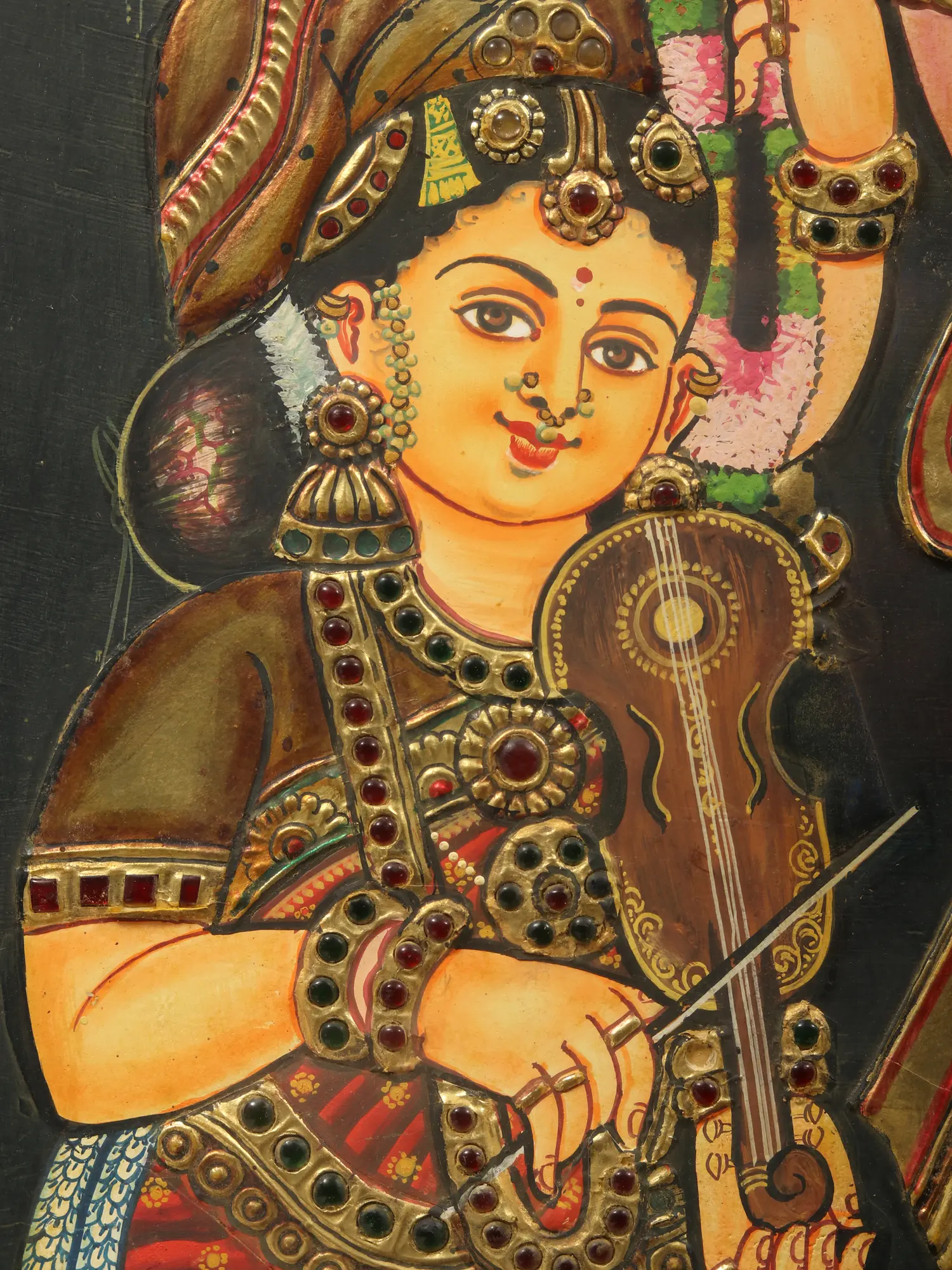 Four gopis, carrying musical instruments, garland, and Makhan (butter) surround Krishna, offering pleasantries to him and asking him to continue playing his Venu for them. The Veena in the hand of the Gopi on the right and the violin carried by the one on the left, are representative of the cultures of East and West respectively, telling the tale of Thanjavur’s journey, in which the artwork picked iconographic and cultural influences from around the world, to narrate the stories of India.