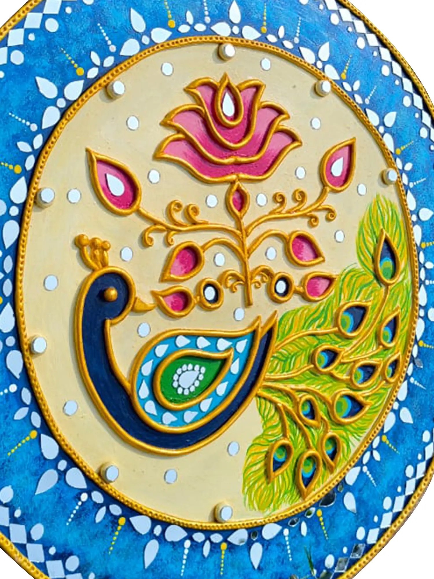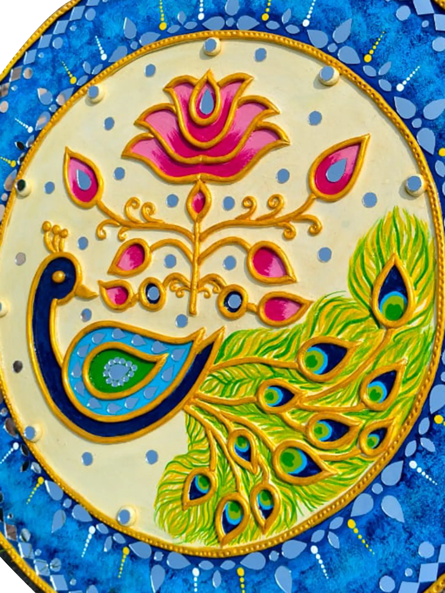 This circular masterpiece, measuring twenty-four inches in height and width with a delicate depth of just over a third of an inch, draws the eye with its balanced composition. The central motif features a gracefully poised peacock amidst stylized flora, rendered in striking blues, greens, and golds. Delicate clay sculpting gives the feathers and floral elements a beautiful three-dimensionality, while the integration of mirror fragments catches the light, adding a subtle sparkle. The outer border, a canvas of textured blues interspersed with white geometric patterns and luminous mirrored accents, frames the central scene with exquisite precision.