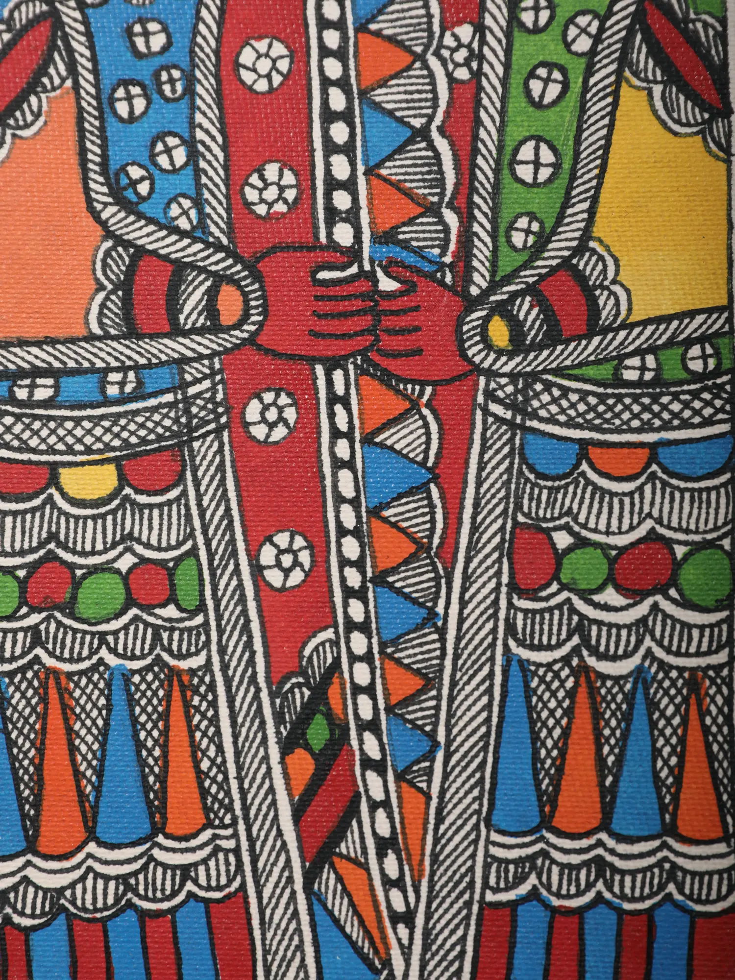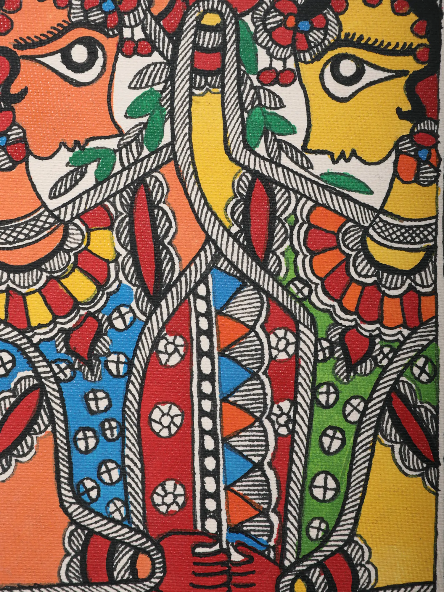 Madhubani art is often steeped in mythological symbolism, drawing from Hindu epics like the Ramayana and Mahabharata, as well as local folklore. While this particular painting focuses on village life, elements within the design may echo deeper symbolic meanings. The prevalence of certain colors, shapes, and patterns can allude to deities, natural elements, or abstract concepts. The double portraits in the paintings can be interpreted as representing the divine couple, Radha and Krishna, or Shiva and Parvati, embodying the harmonious balance and eternal bond between the masculine and feminine principles.