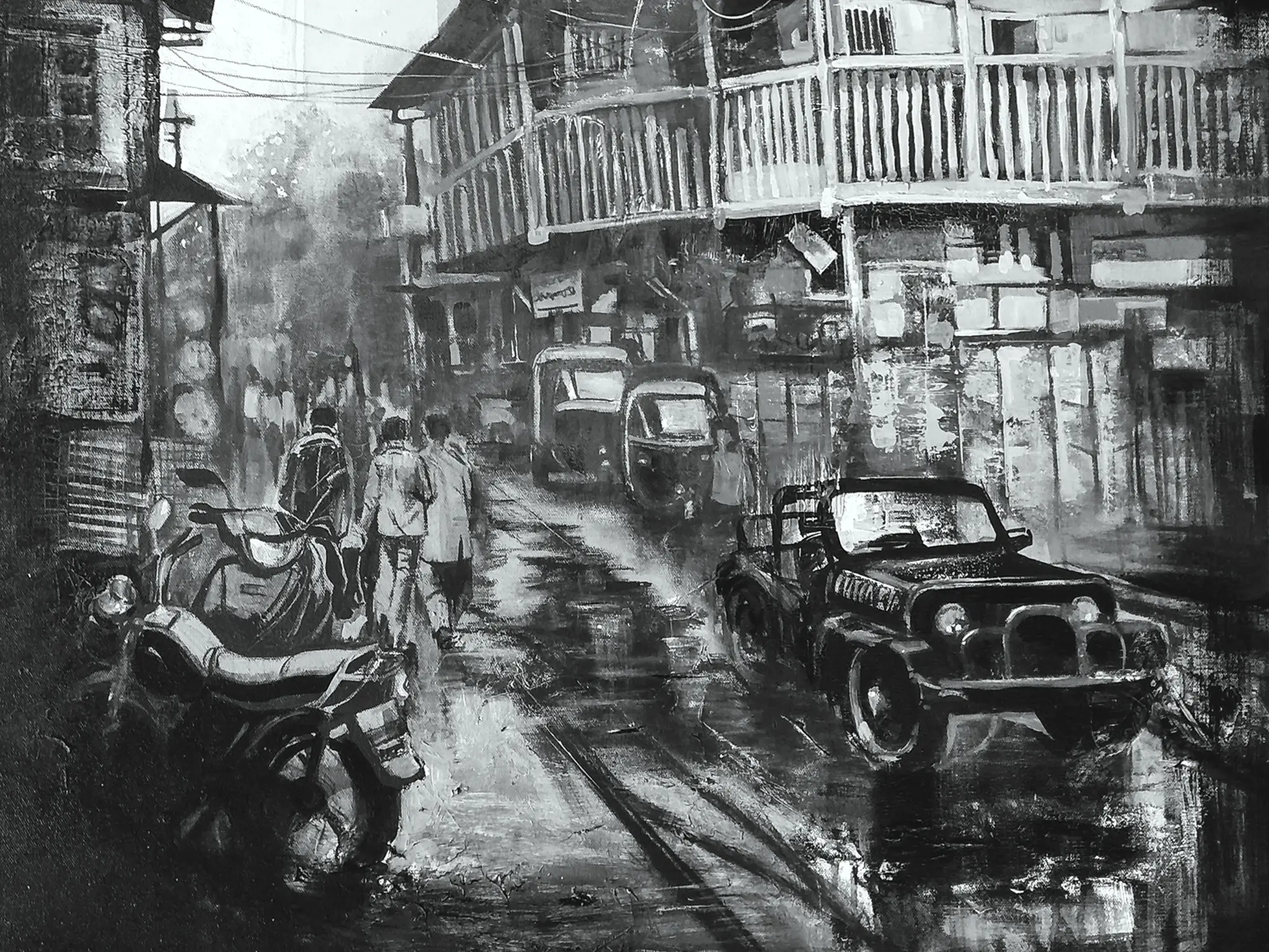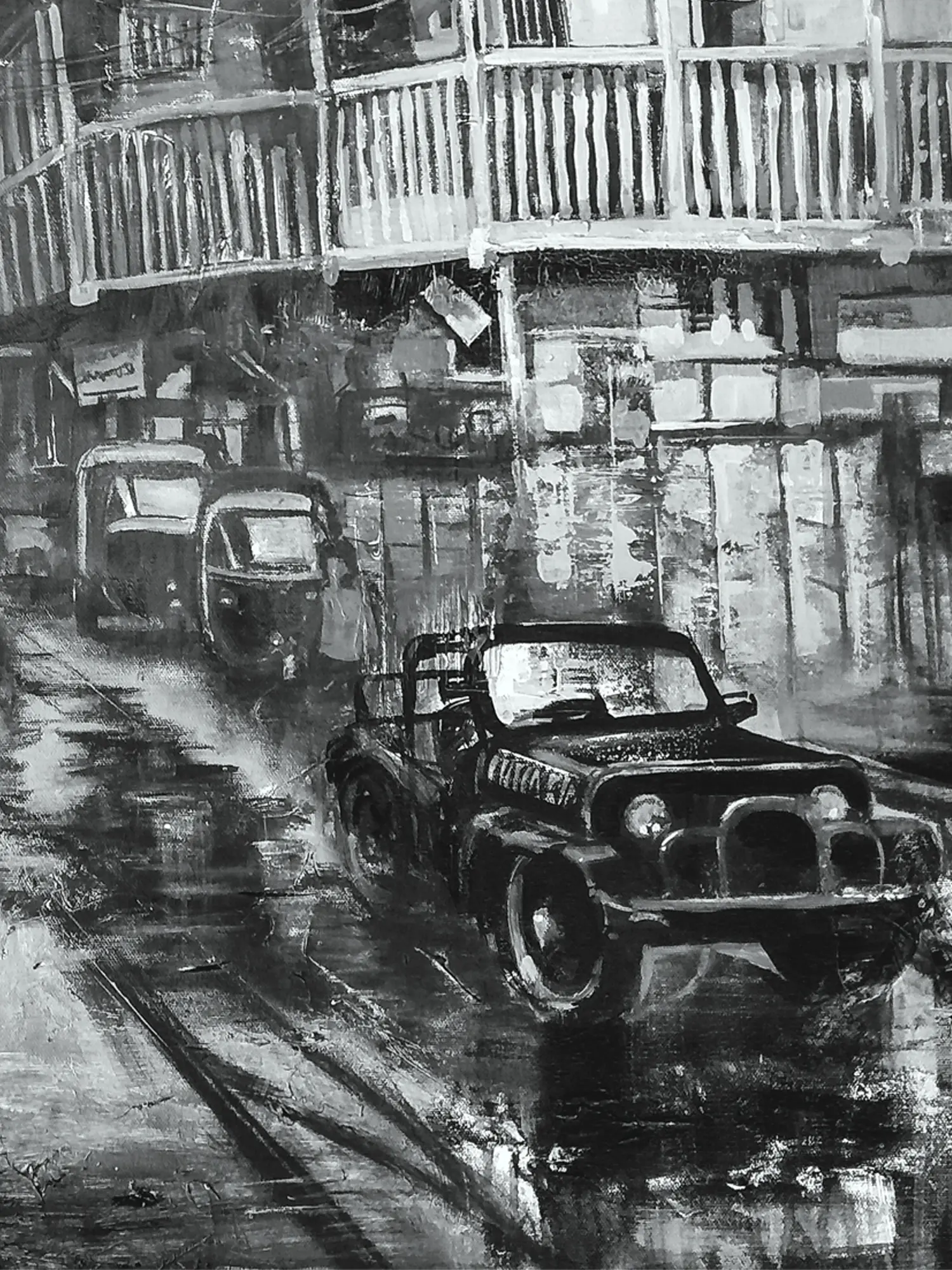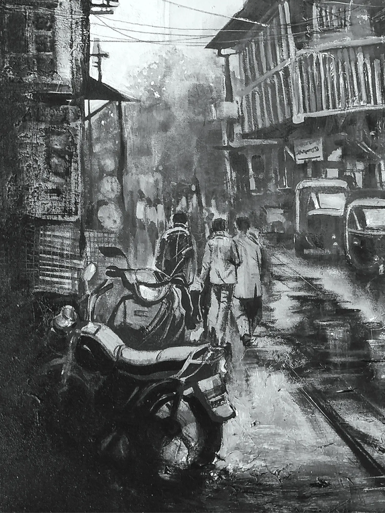 The substantial 36 x 30 inch dimensions command attention, providing an expansive canvas for the intricate details to unfold. Observe how the artist masterfully employs a grayscale palette, achieving dramatic contrast and subtle gradients that define the architecture and figures. The play of light on the wet pavement and the weathered facades of the buildings creates a captivating visual dialogue.