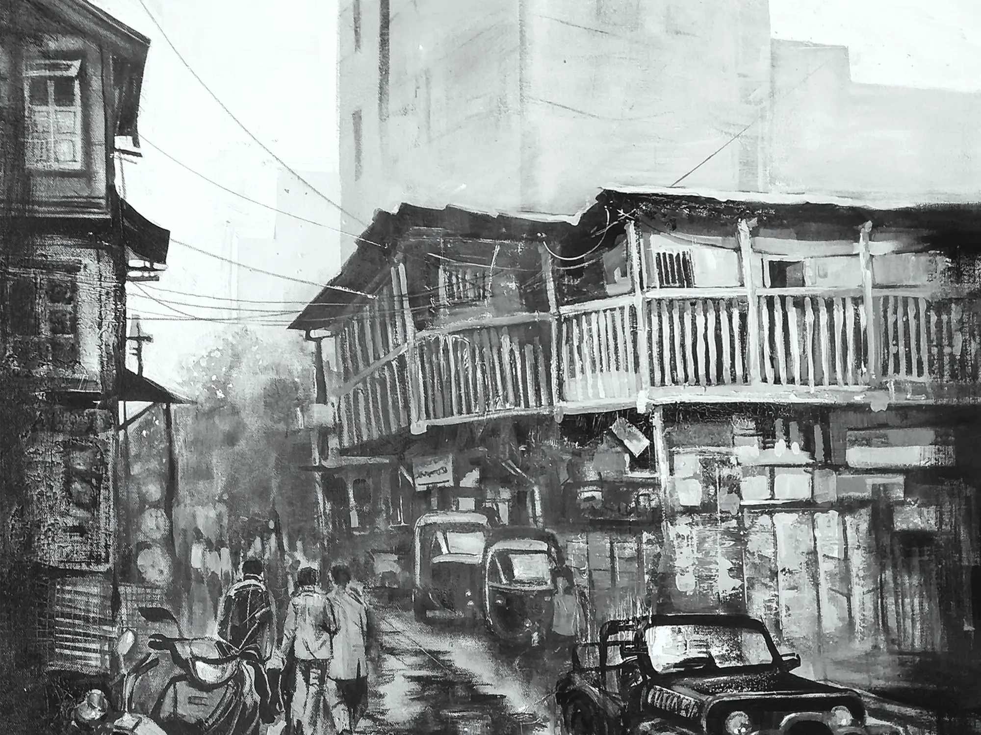 Evening Life in Old City | Acrylic and Charcoal on Canvas | Art by Harshad Godbole