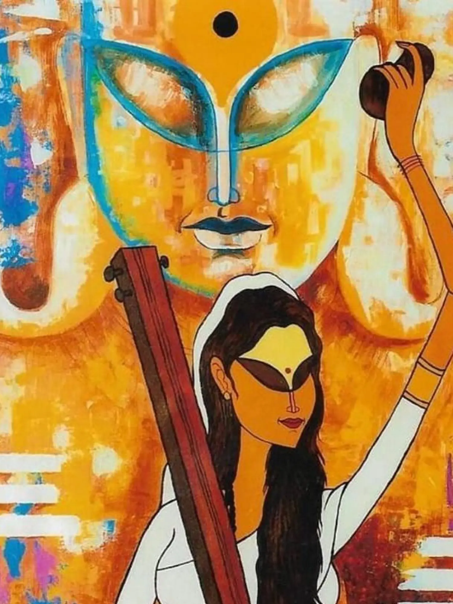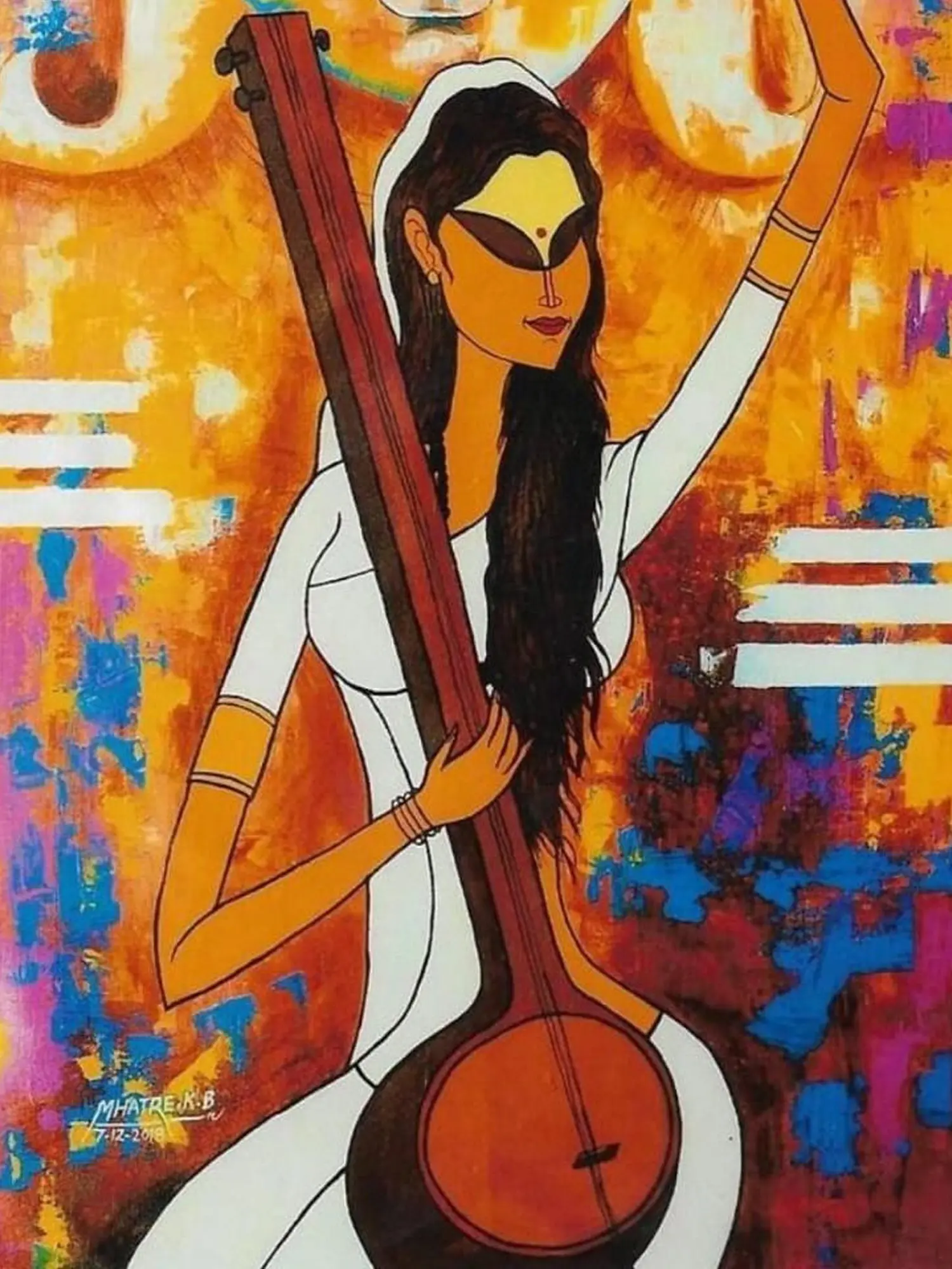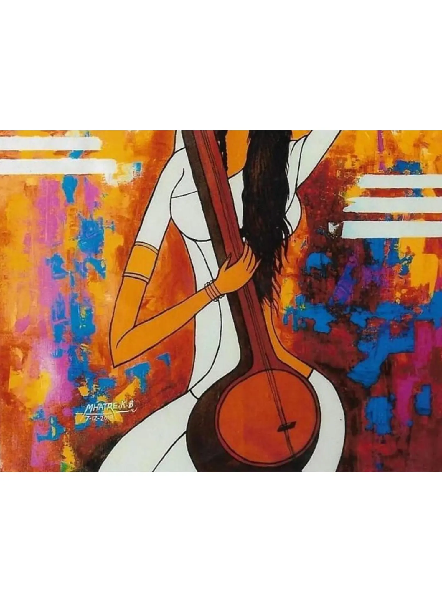 Immersed in the Naam-Jap (recitation of the name) of her beloved Krishna or Vitthal, Mira in this acrylic on canvas painting is a picture of the serene beauty of devotion. On a vertical canvas, Meera appears wrapped in white, the color of purity, her forehead smeared with yellow Chandan to mark her austerity. She holds her Veena in one hand, extending the other toward the horizon as if receiving the grace of the divine with open arms.