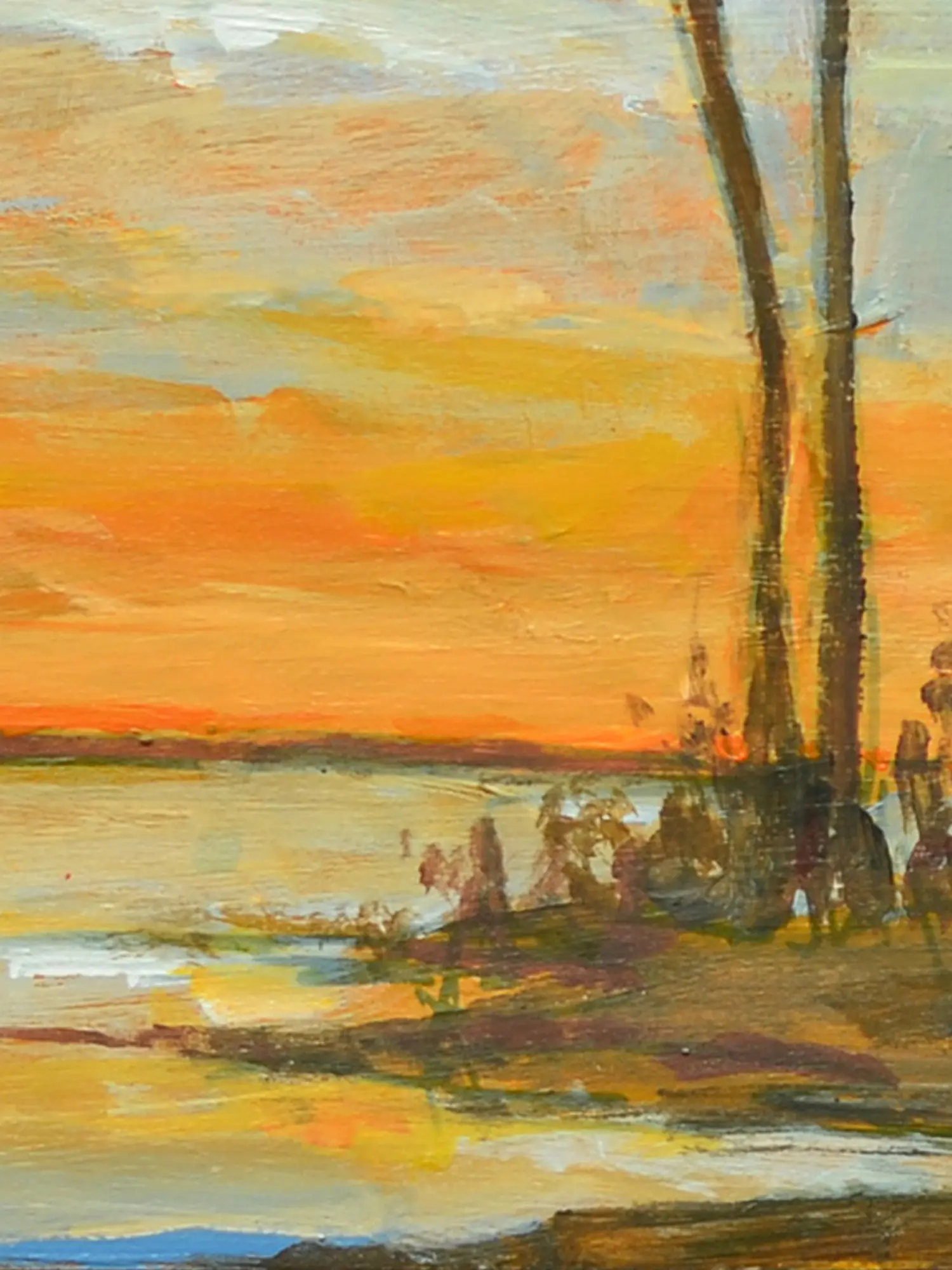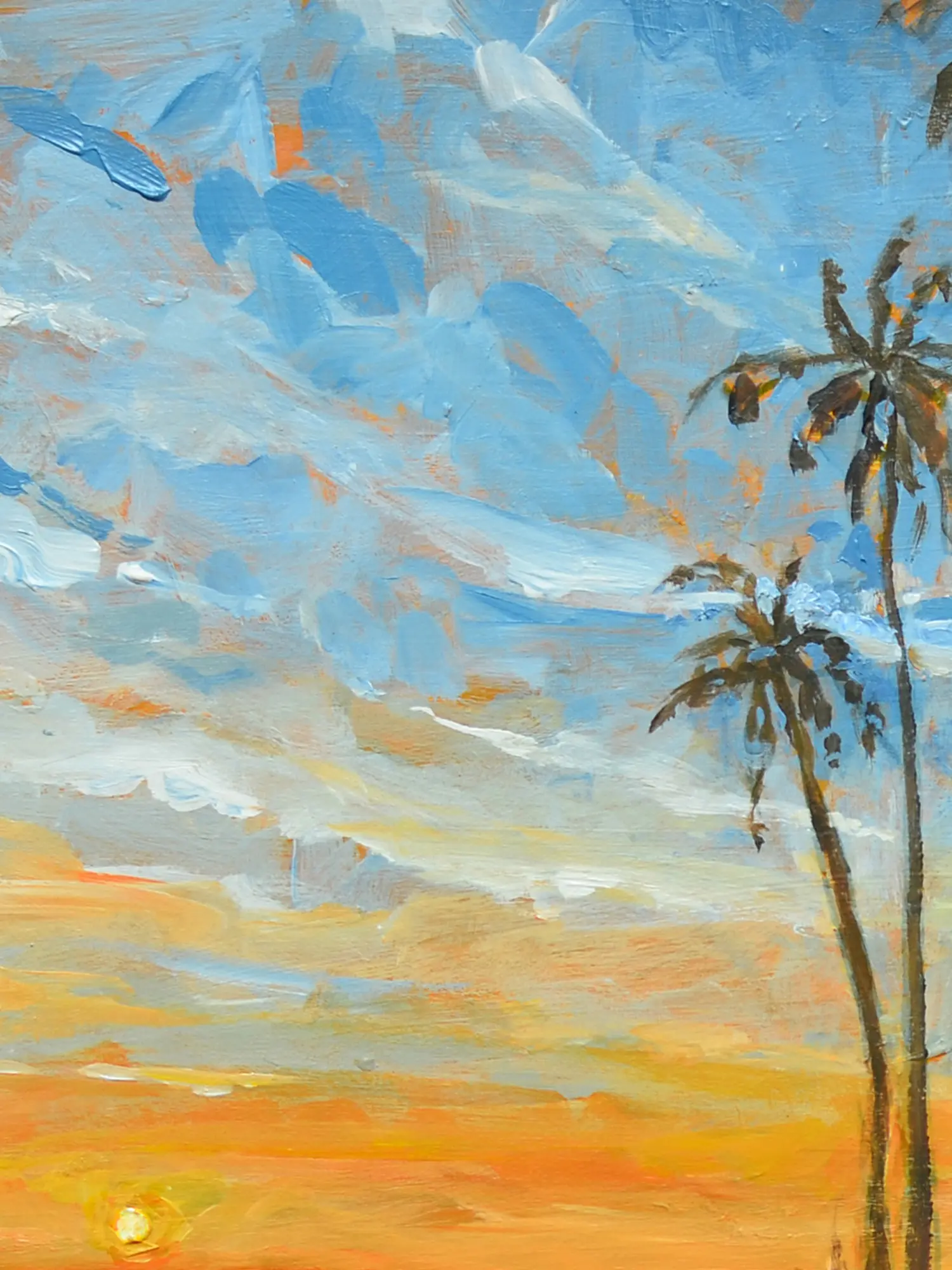 The interplay of warm oranges and yellows against soft blues and whites creates a breathtaking sky that melts into a reflective expanse of water. Silhouetted palm trees stand gracefully against this dramatic backdrop, their forms rendered with a delicate, expressive touch. The intimate scale of this 10 by 10 inch piece makes it an ideal addition to any curated collection, offering a captivating focal point without overwhelming your space.