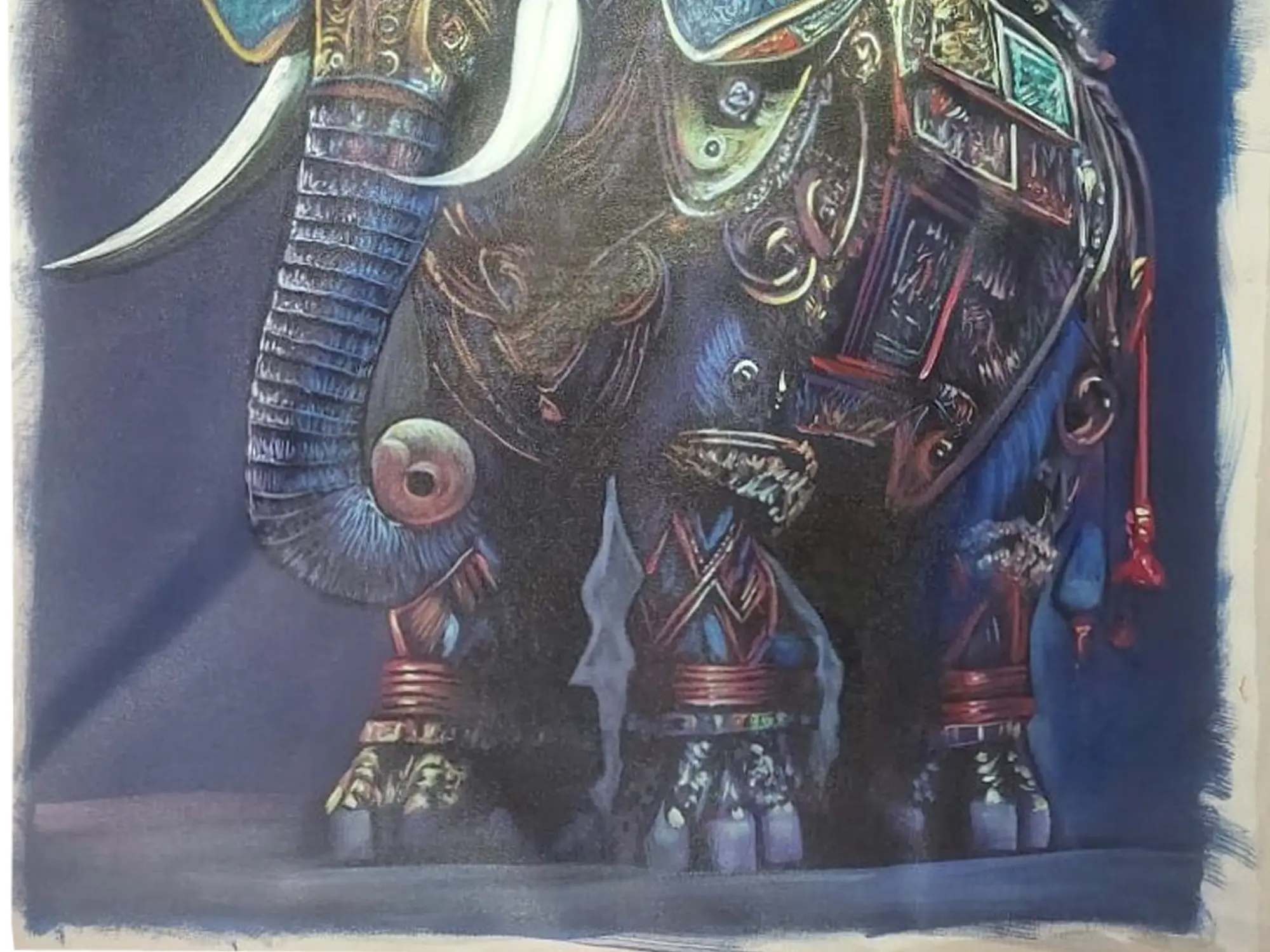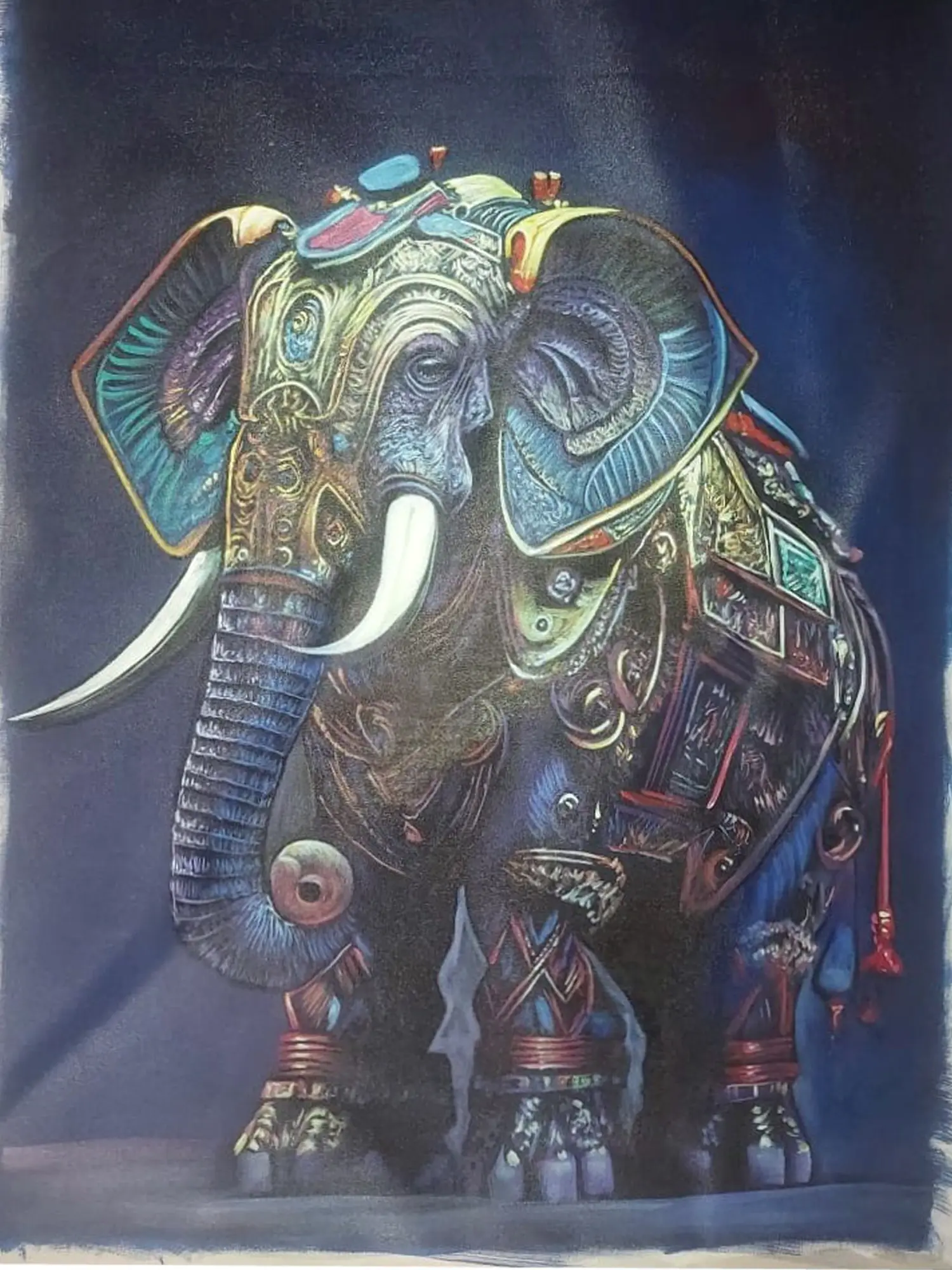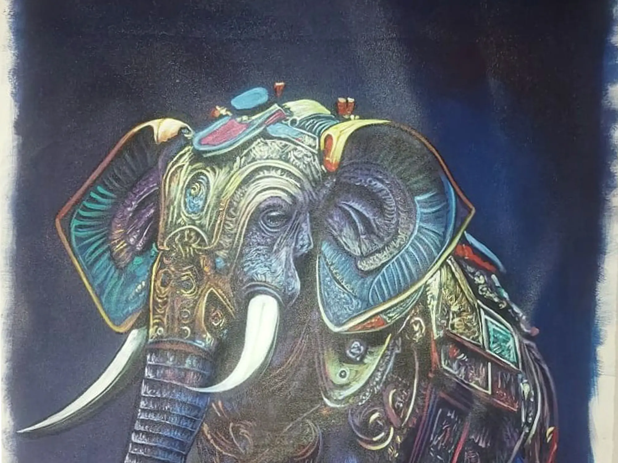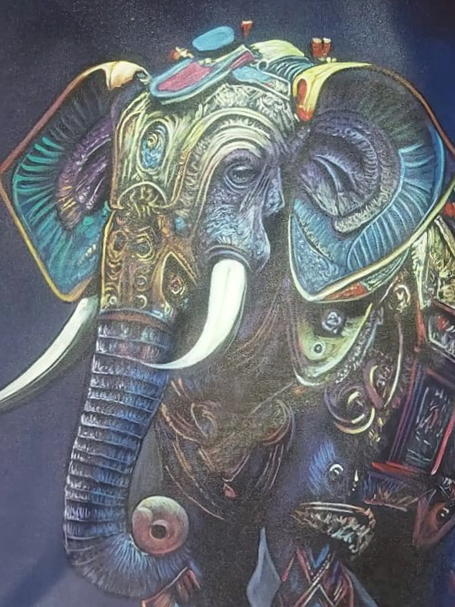 In Jagriti Bhardwaj's Warrior Elephant painting, a majestic and formidable scene unfolds as the artist masterfully depicts an elephant in a warrior-like stance. The powerful creature is adorned with ornate armor, symbolizing strength and resilience. Bhardwaj's attention to detail is evident in the intricate patterns and textures that embellish the elephant's regal appearance. The use of bold colors and dynamic brushstrokes enhances the overall sense of majesty and courage. This painting not only celebrates the physical prowess of the elephant but also evokes a sense of honor and nobility, inviting viewers to marvel at the fusion of nature's might and artistic expression.