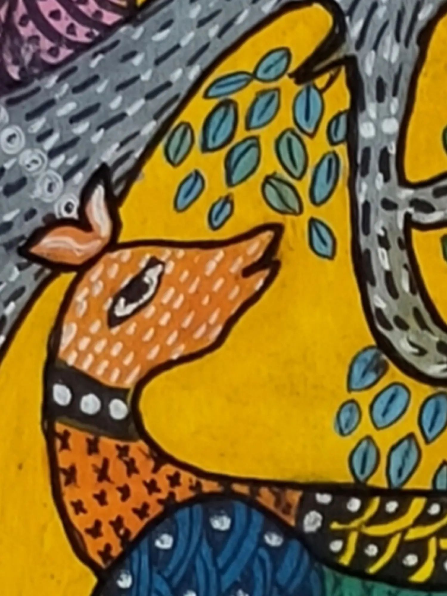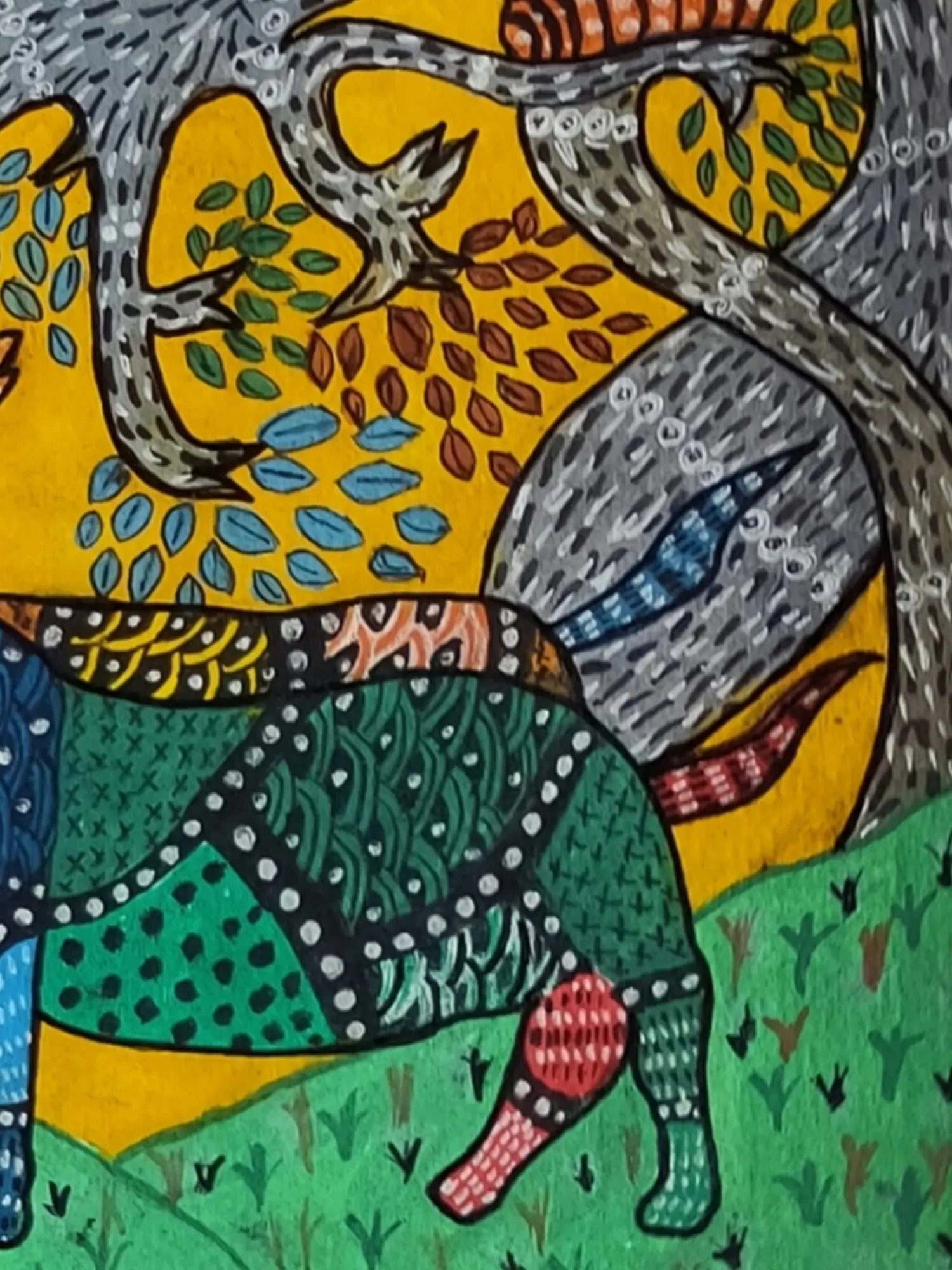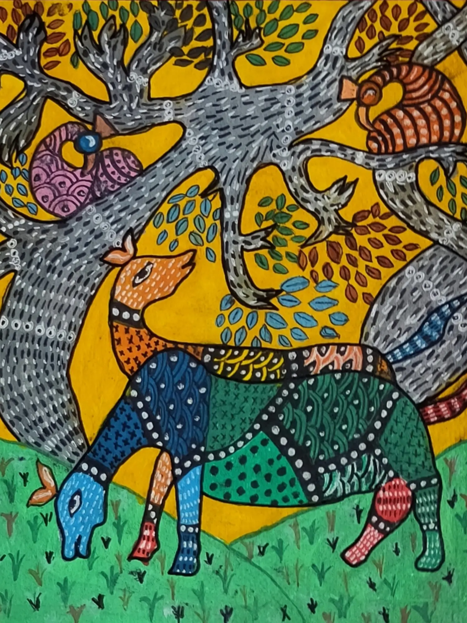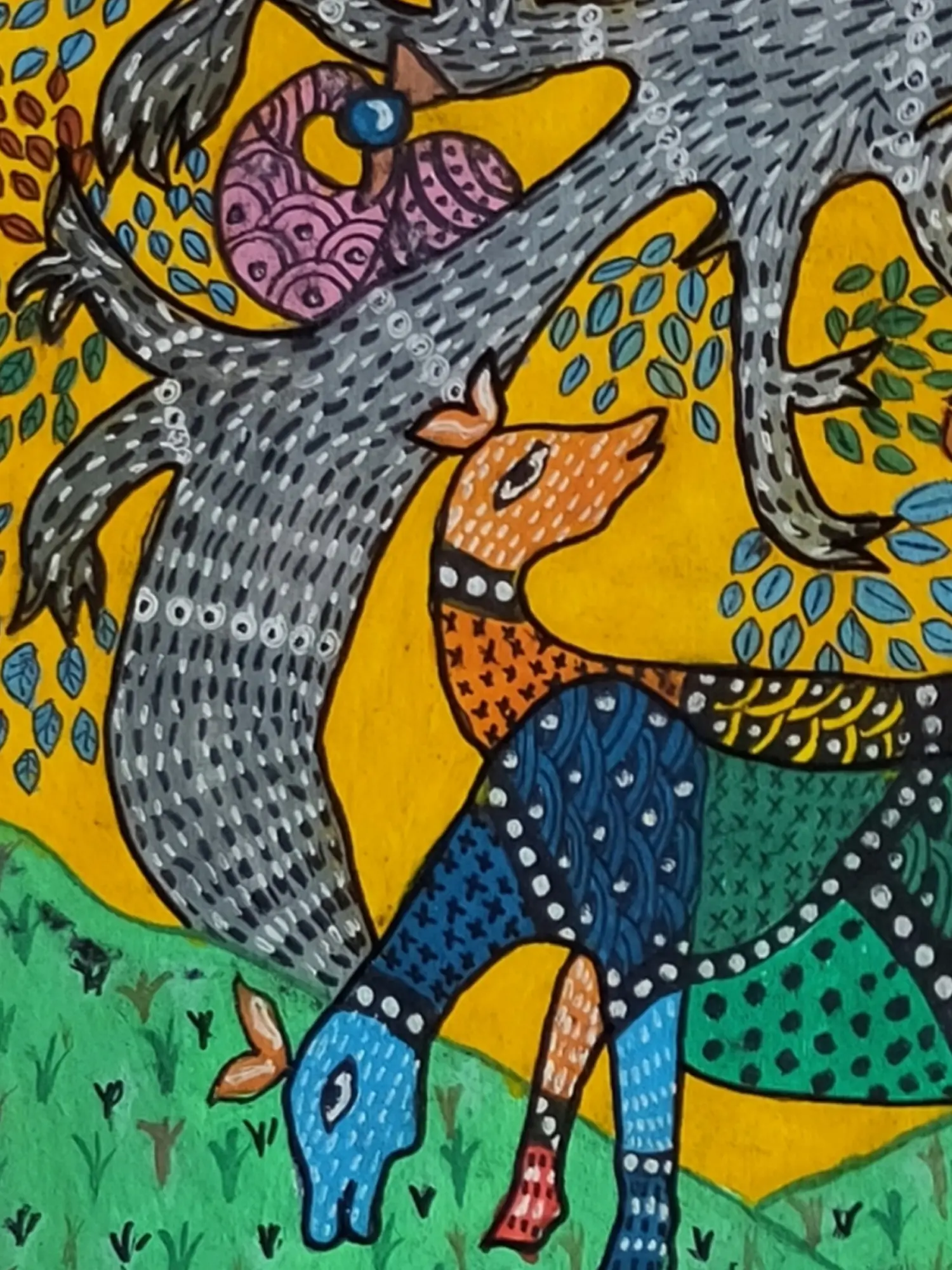 Step into an enchanted realm with this captivating Gond artwork. Watercolours burst forth, depicting a vibrant tapestry of wildlife. This ancient art form, rich in symbolism, reflects a deep reverence for nature and the interconnectedness of all living beings. The artwork embodies the philosophy of living in harmony with the environment, a timely message for our world.