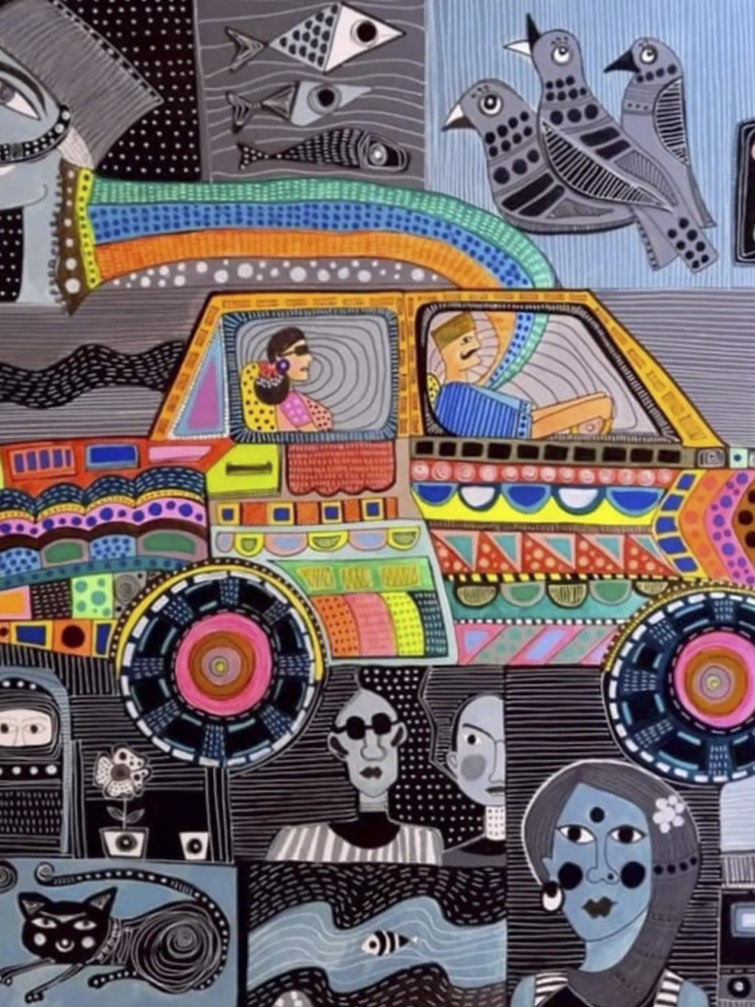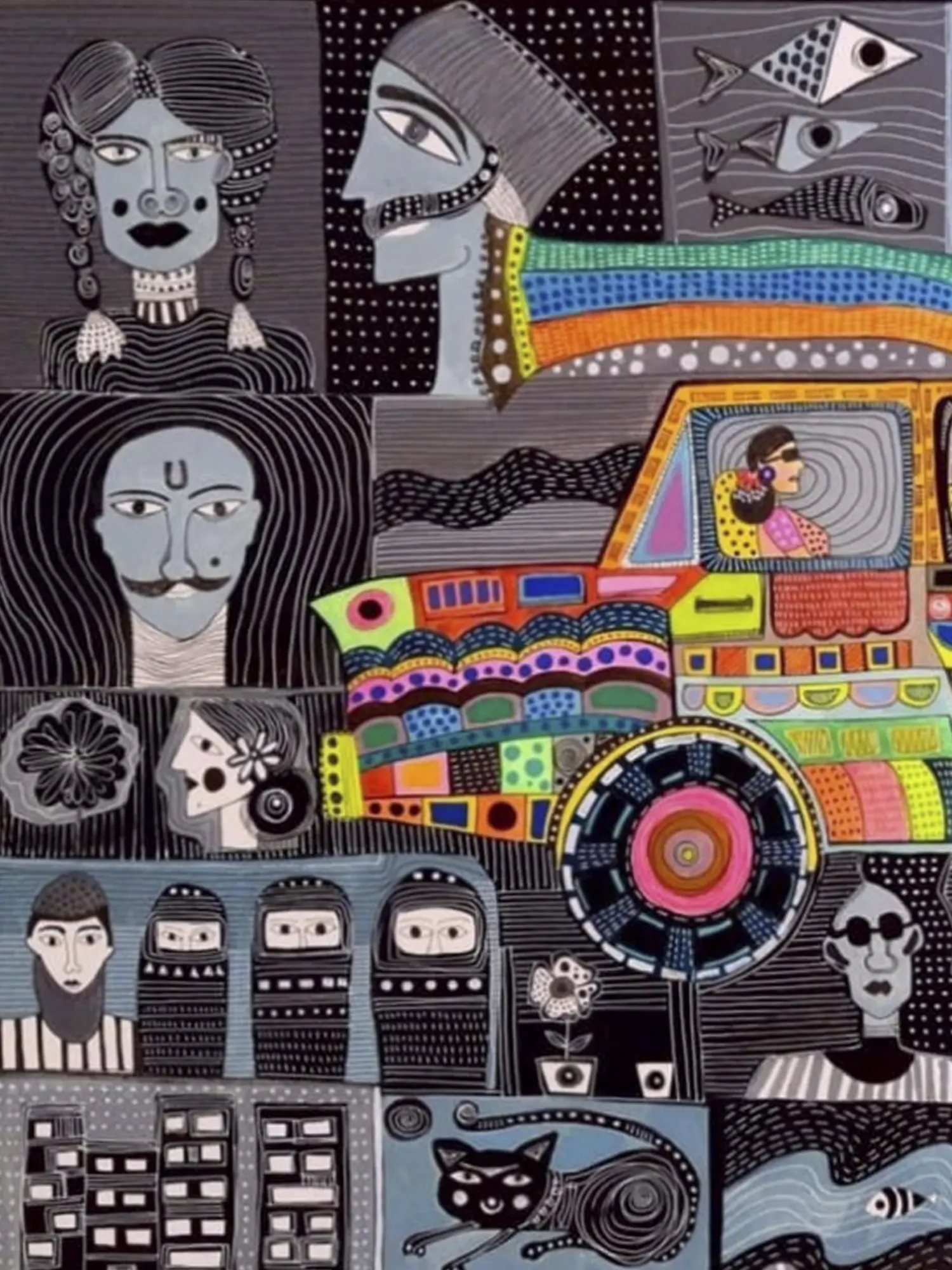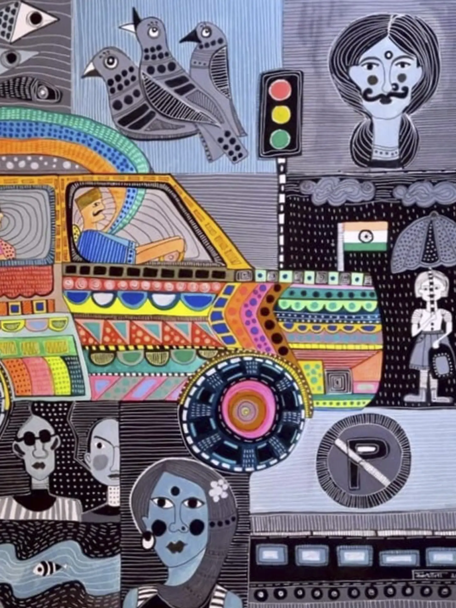This creation resonates with the energy and narrative traditions of South Asian art, subtly referencing everyday life, community, and the flow of movement. The stylized figures and symbolic elements evoke a sense of shared human experience, perhaps hinting at the spiritual journeys or the colorful chaos of bustling street life. It’s a contemporary interpretation that feels deeply rooted in timeless storytelling.